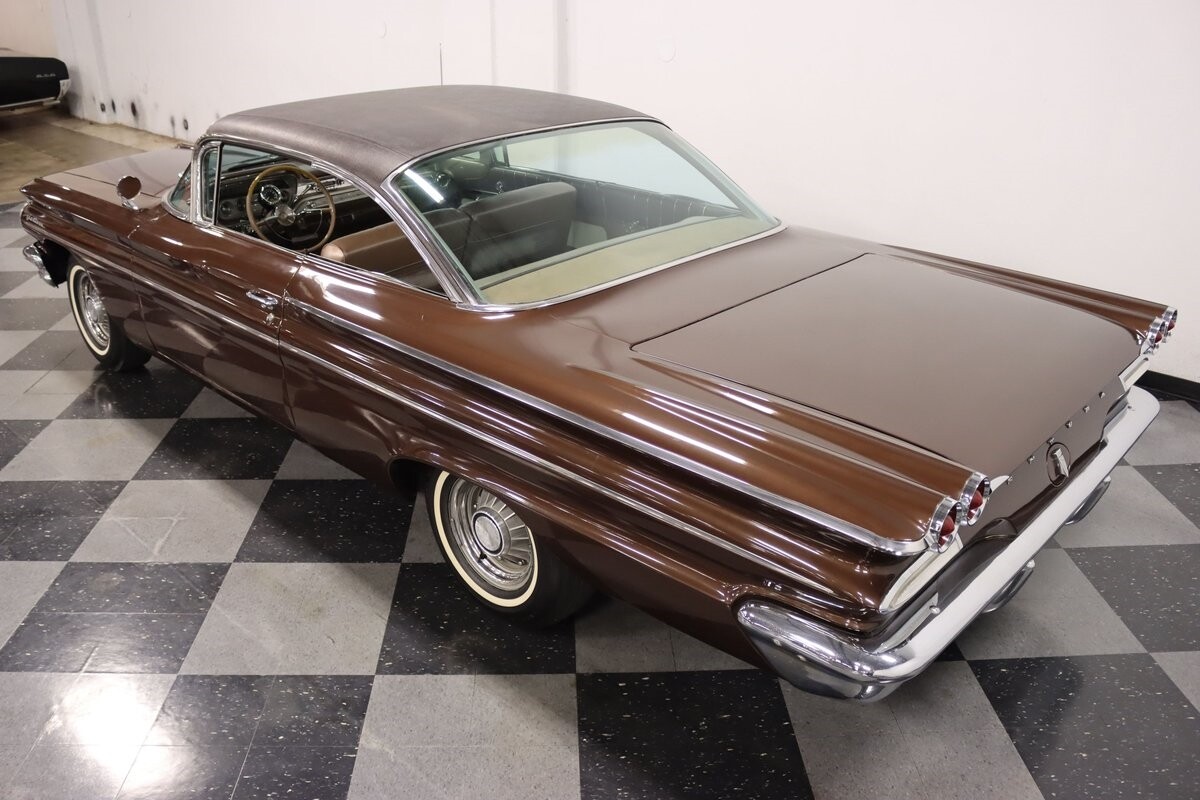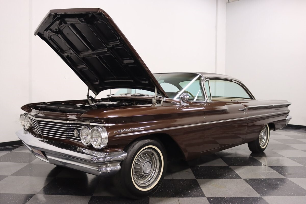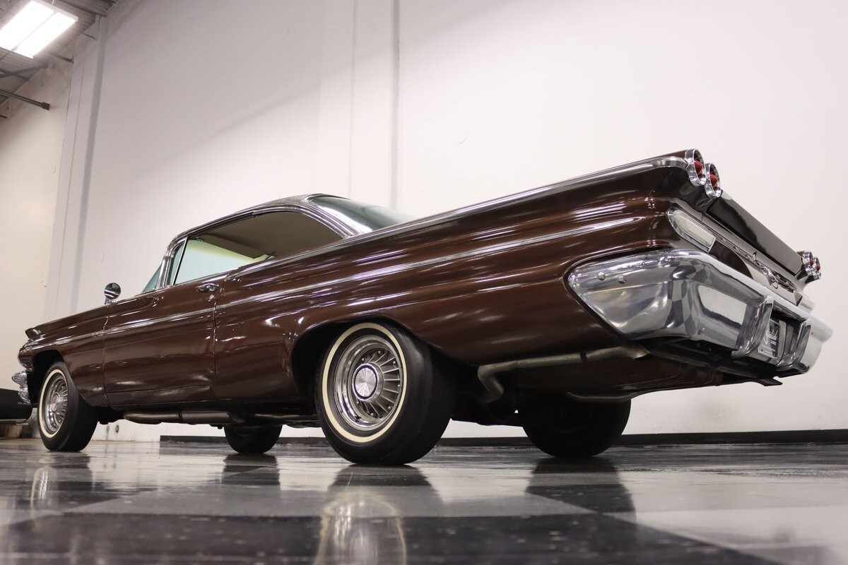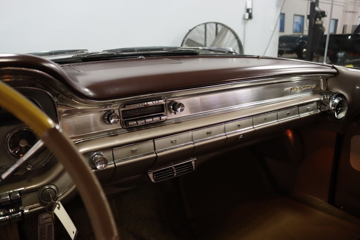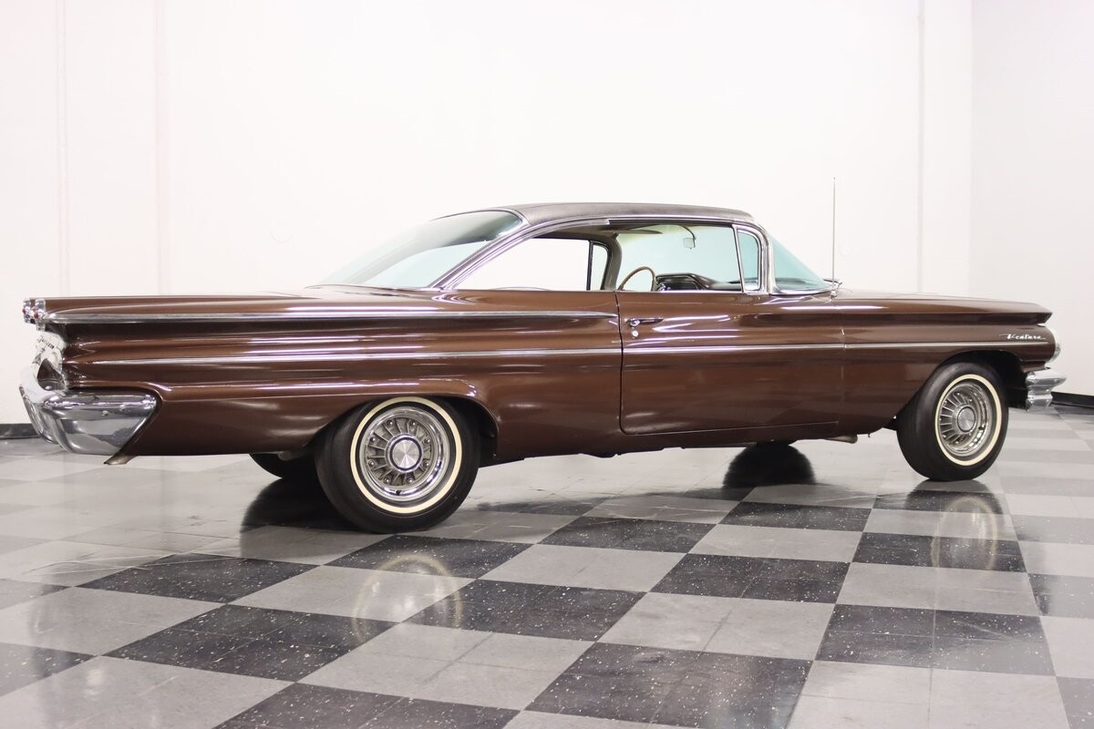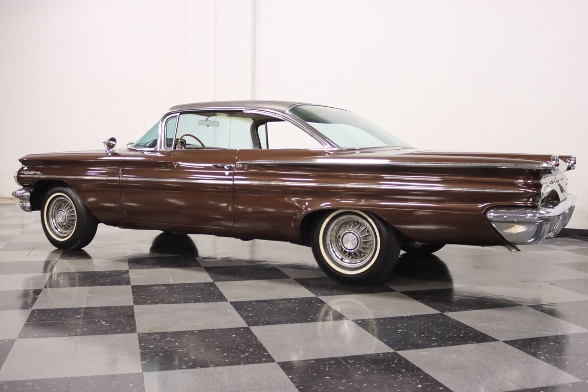 Refinished in Code N Mahogany Metallic, this stunning bubble-top coupe doesn't need a bunch of chrome or a convertible top to stop traffic wherever it goes. Freshly designed for the 1960 model year, the look is pure satellite-era Pontiac all around (the profile practically looks like a spaceship dome atop a flat platform), but one can also see the hints of the GTO to come in the front end. The aforementioned flat hood and decklid make the car look gigantic, even though it's actually built on GM smaller 122-inch wheelbase. It's obvious that the car was painted not terribly long ago, as the finish still has a very fresh look, and although it's certainly a driver, it's a top-end driver with deep, lustrous paint that has very few imperfections to speak of. In fact, take a couple steps back and you likely won't spot a demerit, and a professional buff-and-wax would only further improve things. Undivided horizontal bars in the unique front grille were actually quite revolutionary for the year, and that trim styling continues on the hood trim and profile moldings, which do a great job breaking up all that Mahogany finish. In back, the cool 'rocket' taillights are surrounded by plenty of chrome trim as well, and those have to be the biggest (and coolest) turn signals ever incorporated into such an ornate rear end. There's a lot of sheetmetal all in great condition and the gaps are uniform as well, which is especially critical thanks to that arrow-like side trim. A matching Mahogany vinyl roof adds a touch of sophistication to this Pontiac's already off-the-charts curb appeal, and it helps draw attention to the incredibly cool bubble top – with those incredibly thin pillars and awesome curved E-Z-Eye glass.