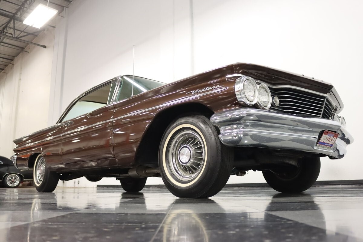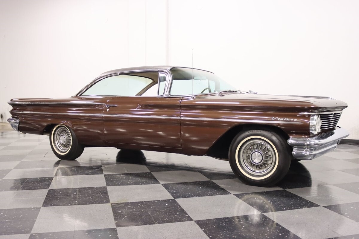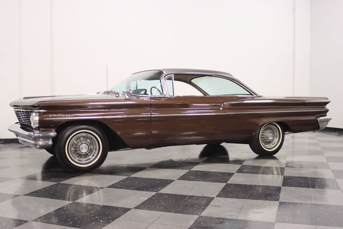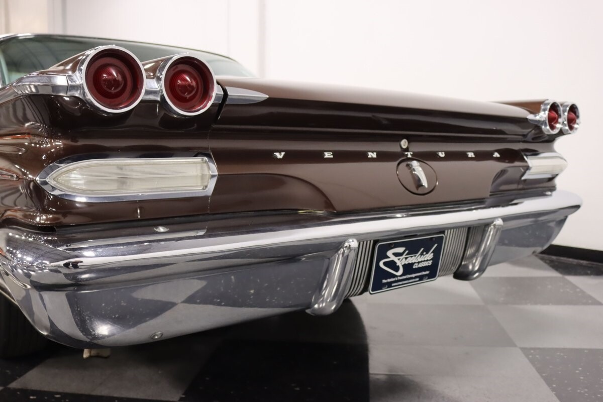 Power comes from the believed-original 389 cubic inch V8, which with a Tri-Power carburetor setup was Pontiac's top performer and would become the foundation of the GTO just a few years later. With big horsepower and plenty of torque, this middleweight coupe moves like a bantam yet hits like a heavyweight. The engine is properly dressed in Pontiac Turquoise paint and topped with a black snorkel air cleaner, and there wasn't much flash this year, apparently they were waiting for the GTO to start adding chrome under the hood. Although not perfect, the engine bay has a very nice shine, and turns heads everywhere it goes because it looks completely authentic. Pontiac's famed Wide-Track wheel design teams with a supple, softer suspension introduced in 1960, meaning this Ventura floats down the road, further aided by factory 'Wonder Touch' power steering and brakes. The Hydra-Matic transmission shifts smoothly, sending power to the Safe-T-Track rear differential that can easily handle the car's torque, and the stock-style dual exhaust underneath has a fantastic note. Underneath, it's incredibly solid and clean with original floors, and 14-inch PMD 8-lug wheels wrapped in 225/70/14 Laramie whitewall tires at the corners are the perfect endcaps.