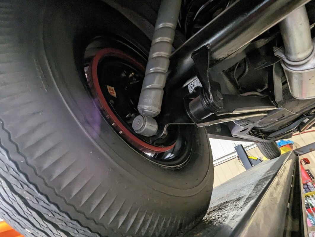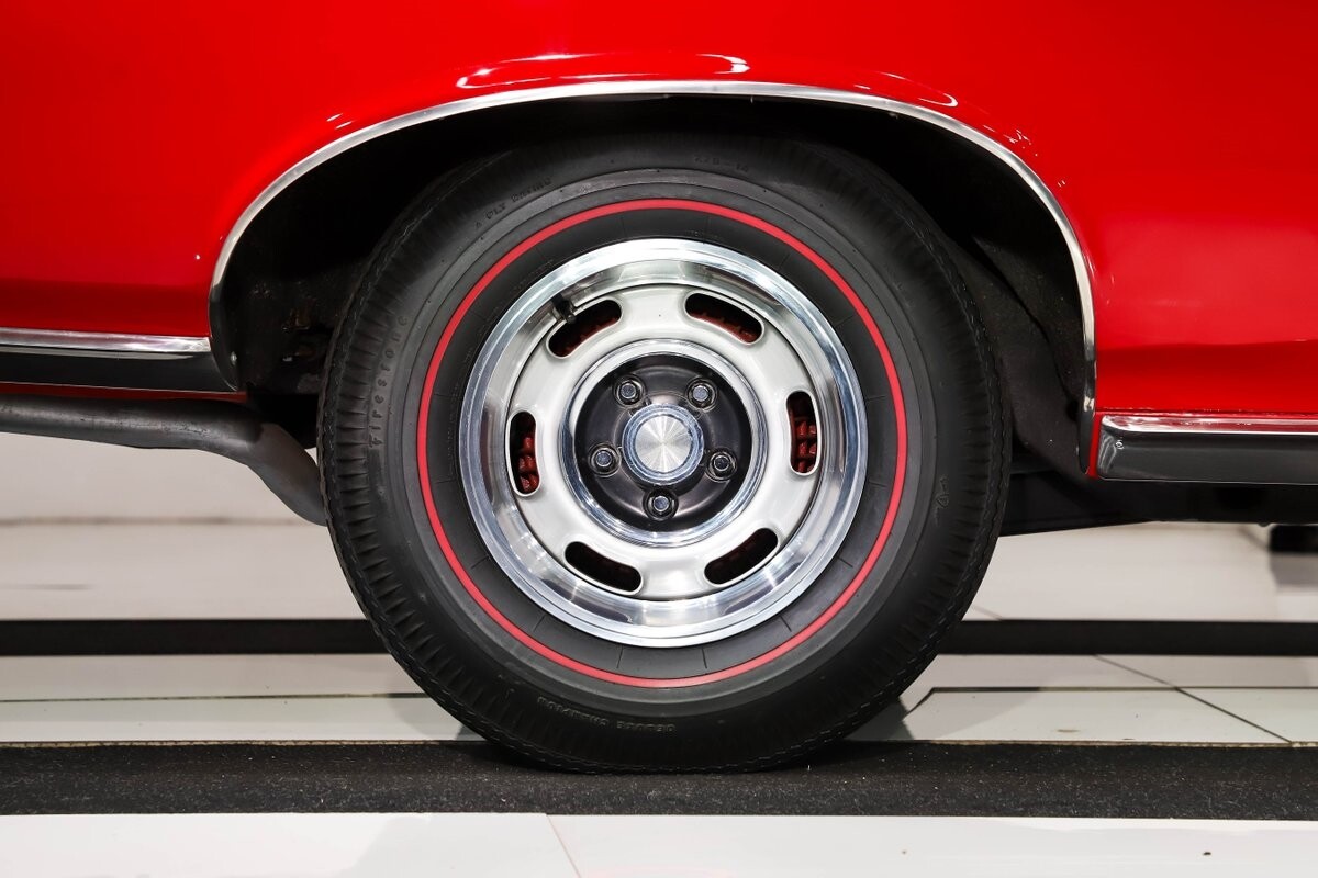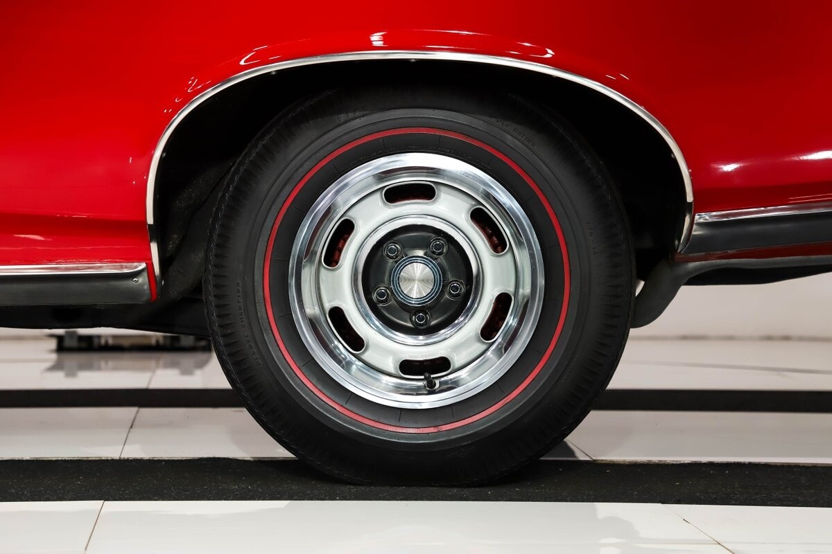 EXTERIOR: This one sits proud! The body is clean and straight. No rust or issues and the panels fit right. Repainted in Montero Red and it is polished smooth and glossy. All the chrome and trim are sparkling. Glass is clear, weatherstrips are soft. Here are the exterior options: door edge guards, remote mirror, pinstripe, a power antenna, and a vinyl top. It also has Rally 1 wheels wrapped in reproduction redline tires.
