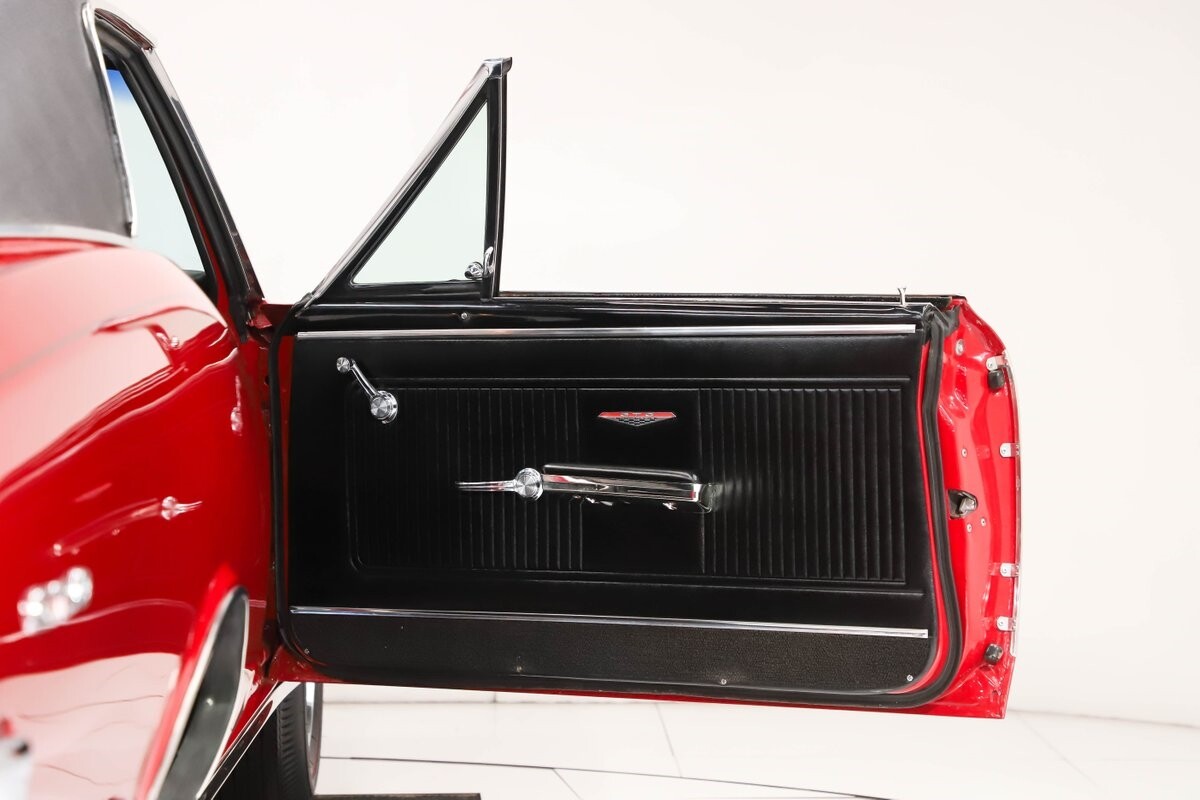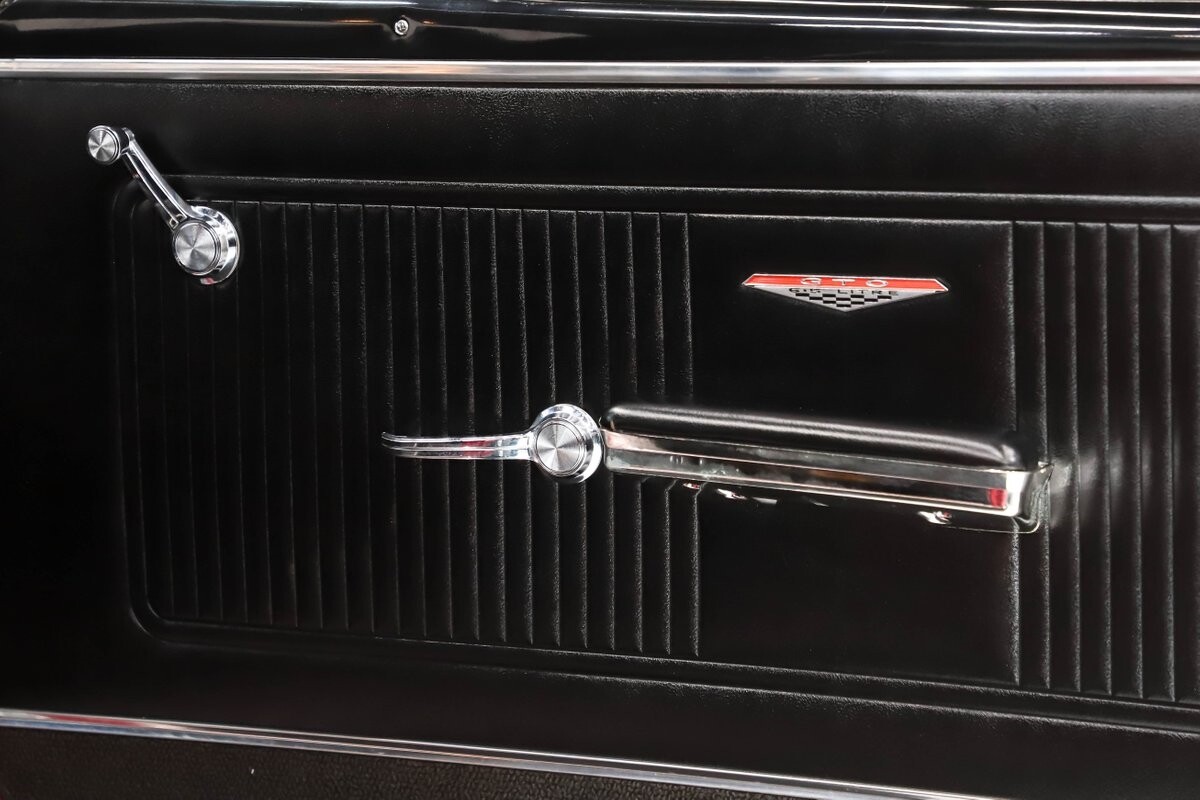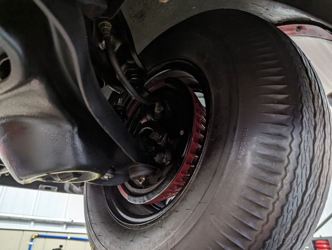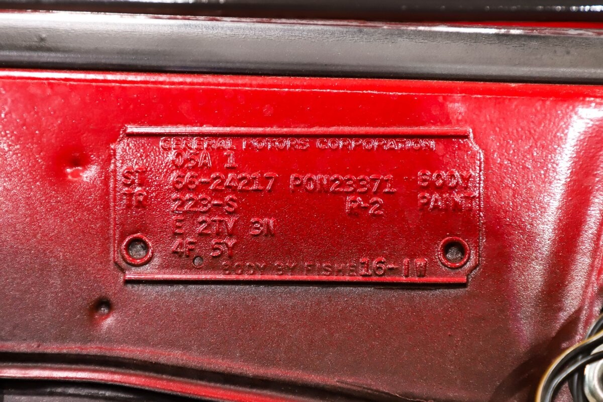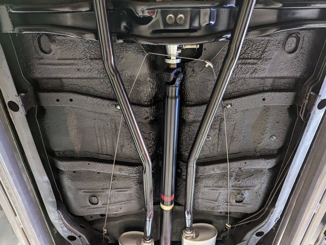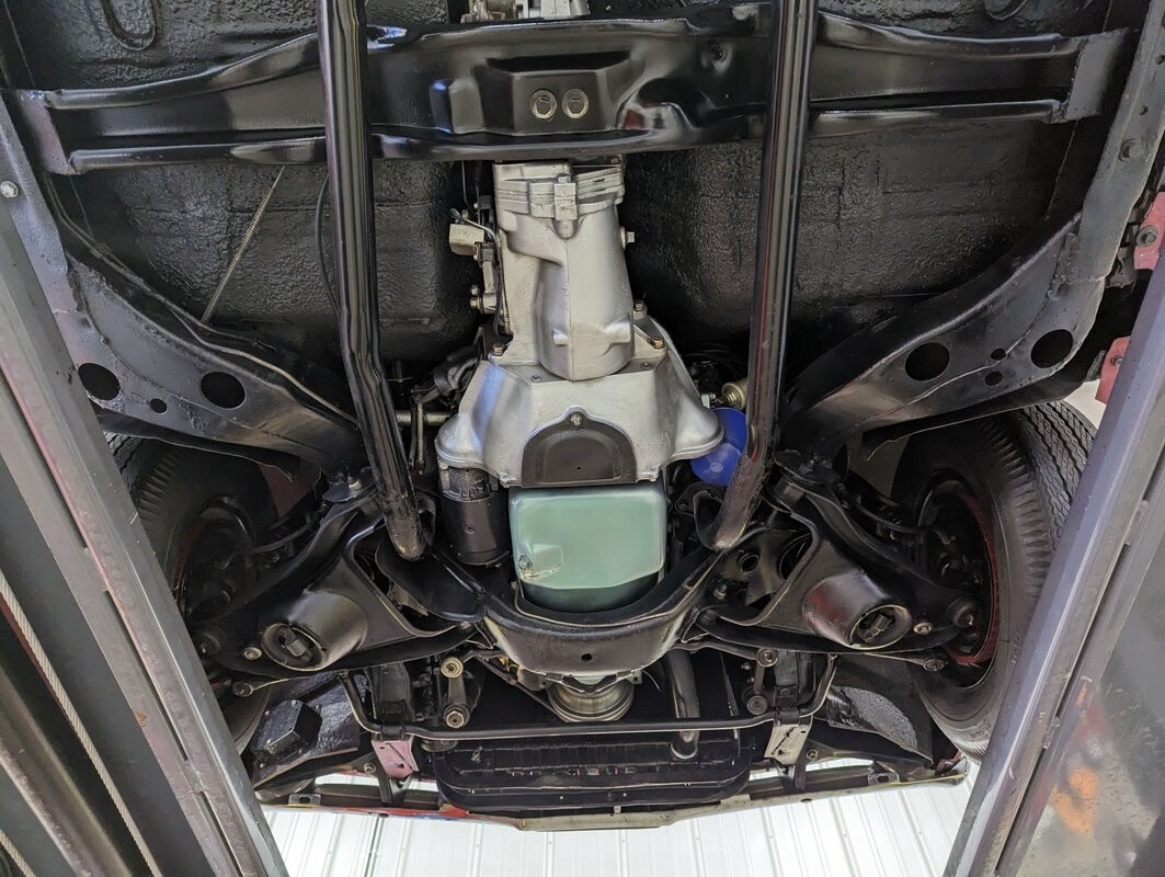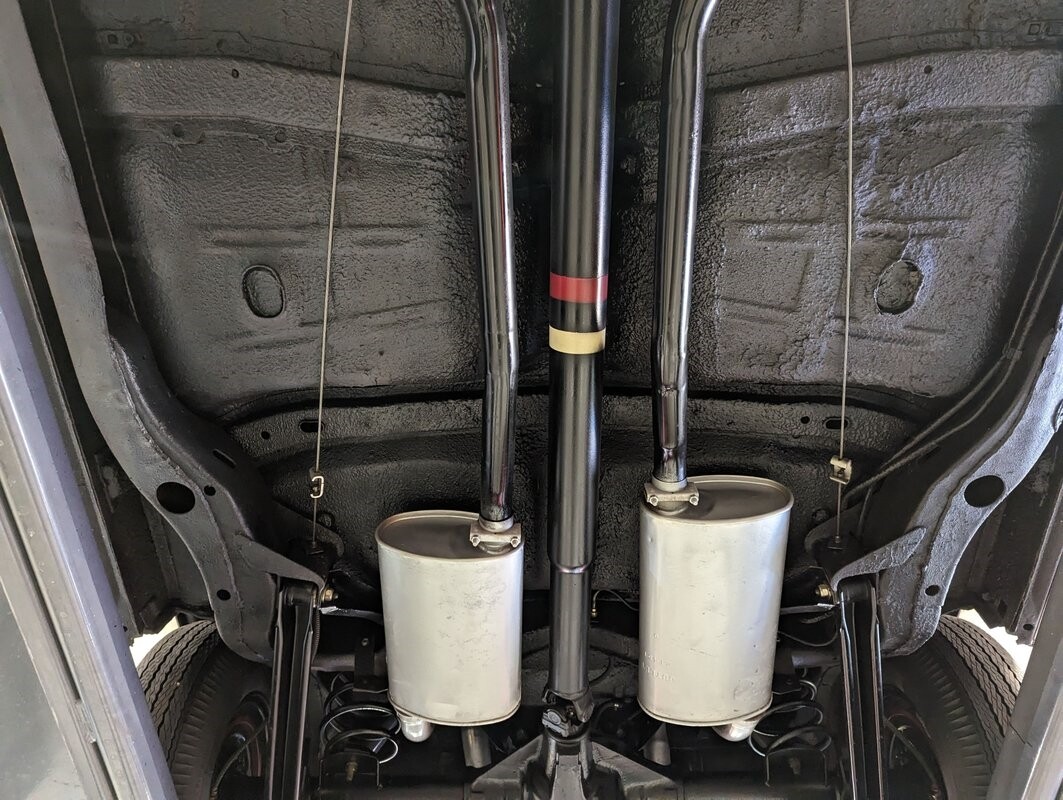 UNDERSIDE: The body was off the frame during restoration. All rock solid floors has the factory undercoat, it was cleaned and freshened up with some black paint. The chassis was all stripped down, repainted then rebuilt. The steering and suspension were redone, it even has correct spiral shocks. The brake system has been thoroughly gone through. It has optional metallic brake linings on the finned drums at all four wheels, e-brake is hooked up. Correct style dual exhaust with the offset mufflers and resonators in the tailpipes. Looking up at the motor it is very fresh, has correct starter. The correct Muncie 4-speed is also fresh with a Hurst shift linkage. Restored drive shaft with the assembly line markings reapplied. Correct 3.55 posi rear end.