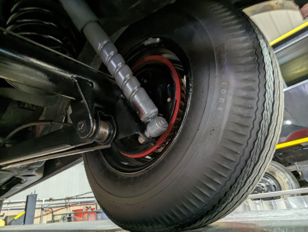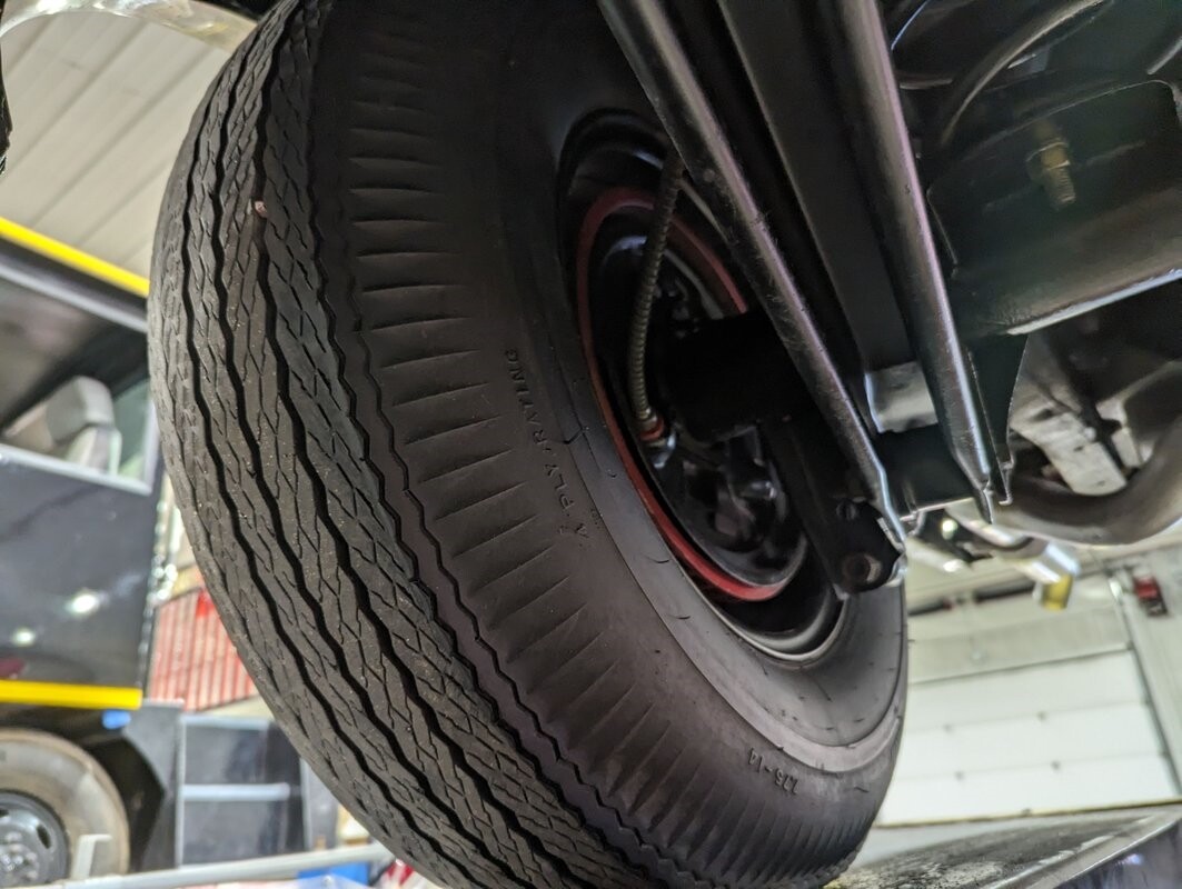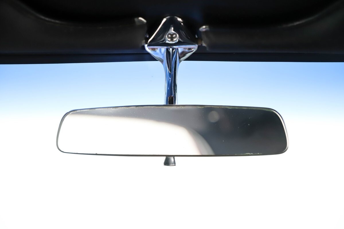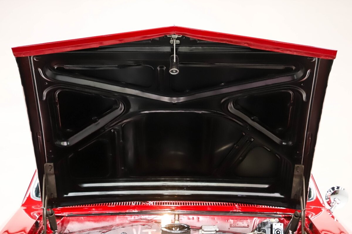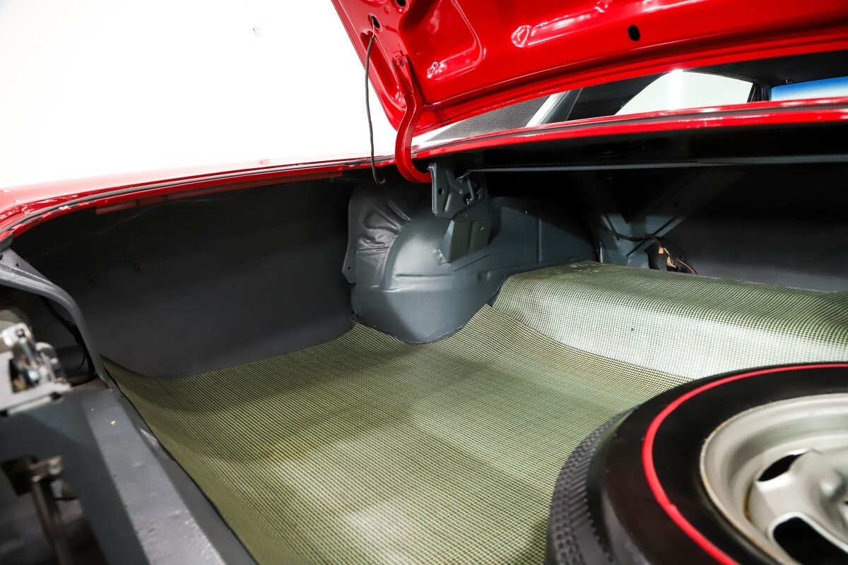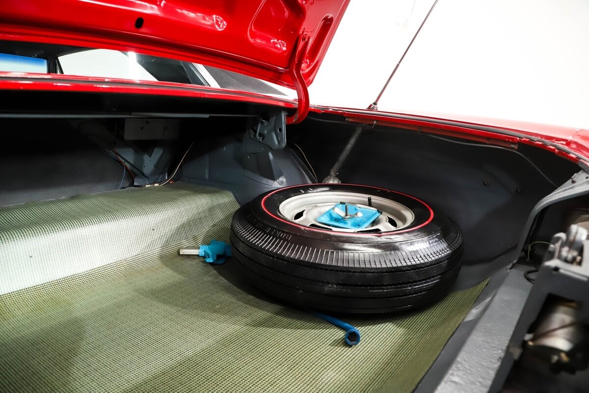 TRUNK COMPARTMENT: You actually pump a plunger in the glovebox and that pops the trunk! Yes, that's a factory option. It also has an optional trunk light that works. Reproduction weatherstrip and 2 piece trunk mat. It is complete with a matching reproduction redline tire on a Rally 1 wheel and correct jack assembly. Inside is clean metal with a spatter paint.