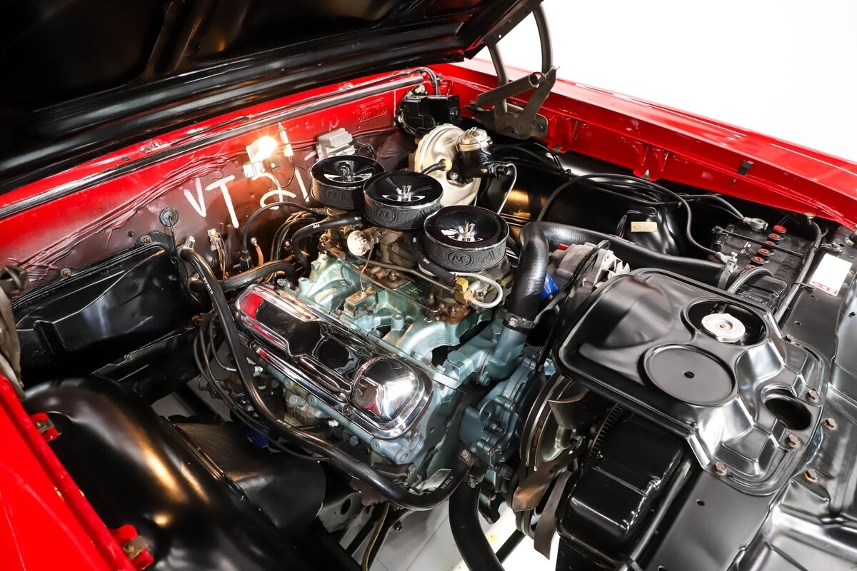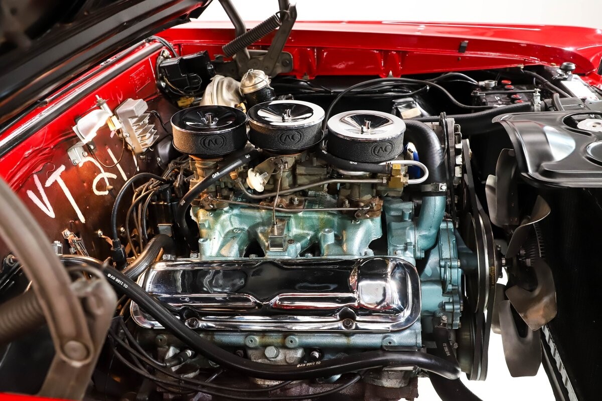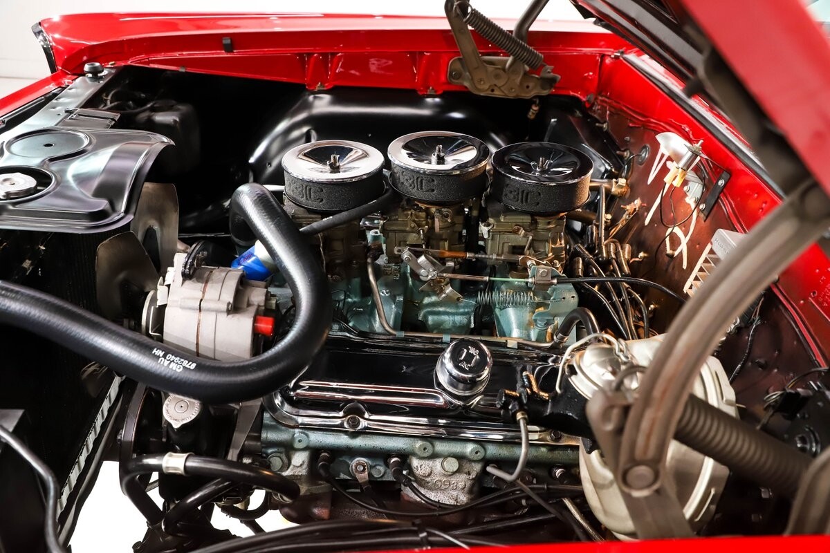 ENGINE COMPARTMENT: Rebuilt original 389-360 hp Tri-Power engine. Correct casting code and date, correct WS code and the unit number matches the protect-o-plate. It has correct big valve 093 heads, 068 intake and large venturi carbs. It also has the correct chrome valve covers and air cleaner lids, correct foam filters, choke, fuel lines, fuel filter etc. The entire engine compartment is detailed to the way that specific factory would have done it: proper overspray on the firewall with the assembly line markings. It also has reproduction hoses, clamps, spring clamp battery cables and Delco battery topper. Other options include transistor ignition, power steering, power brakes and under hood lamp. Everything looks proper: the battery is secured, windshield washers are hooked up.