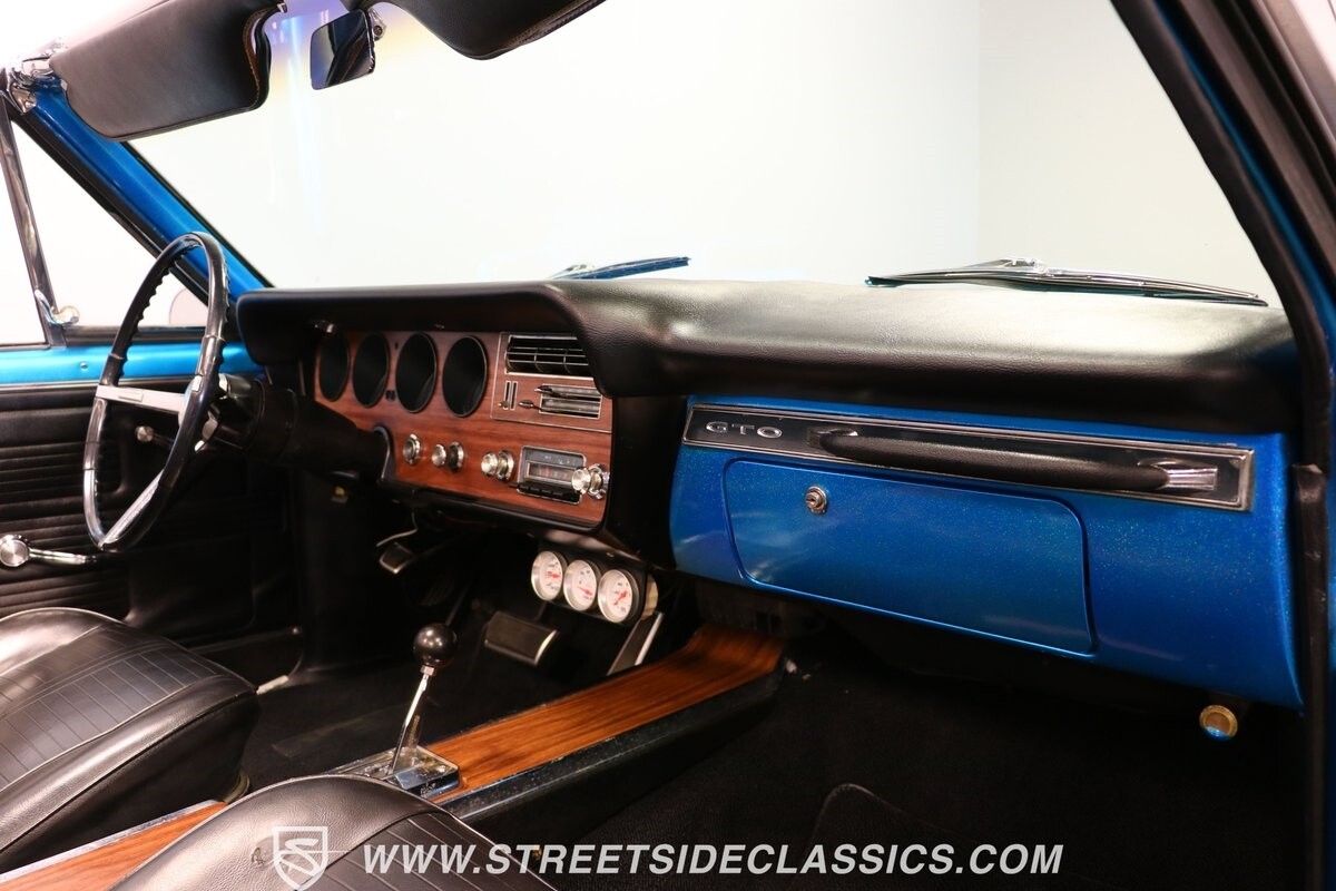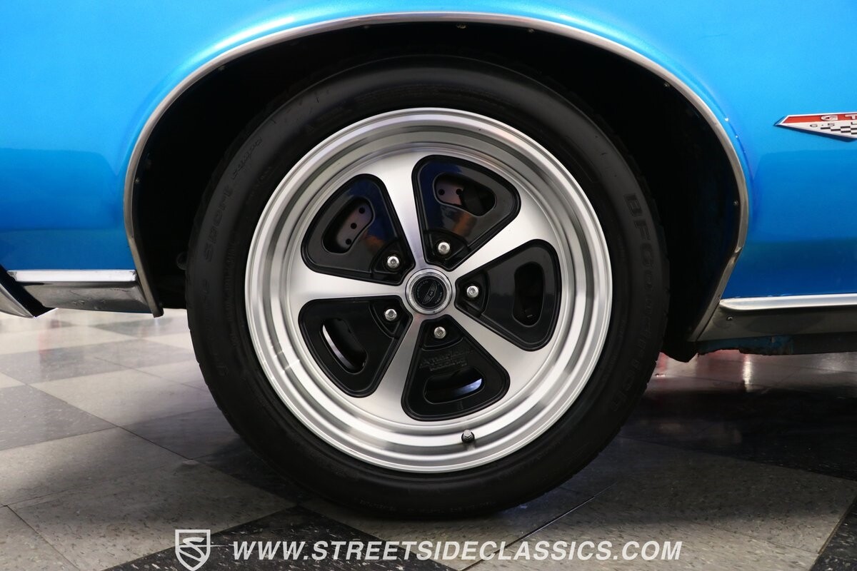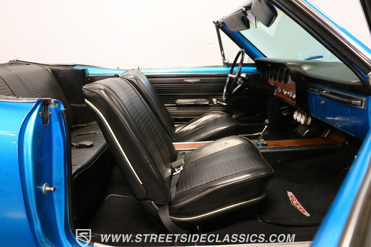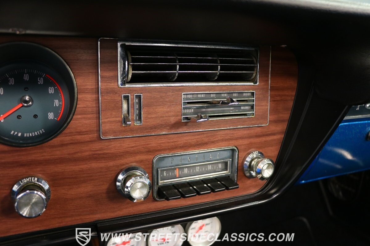 Pontiac gave the premium LeMans plenty of style, so upgrading it to a GTO is not hard. But we all know if you miss some key areas. So it's nice to see this is done correctly in places like the hood scoop and exclusive tail light panel. Form-fitting chrome bumpers and full rocker trim make for some attractive brightwork. But on this unique convertible, the paint is the true radiant star. The blue has an impressive amount of metallic embedded deep into the finish. So when the light hits it, this convertible can make some bass boats jealous. The kind of upgrade shows this is a tribute car made to be driven. So it never gets too fancy like a museum piece, but it sure knows how to have a presence out on the road. And those American Racing wheels are even made to look like classic mag wheels from the 1960s, but they are modern 17-inch alloys that hold some of the best modern sport tires.