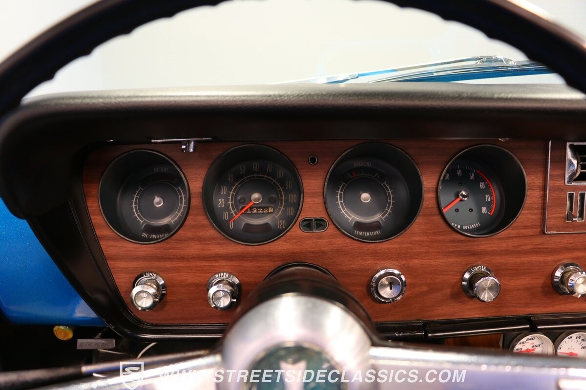 The black convertible top looks good in place, and with the flip of a switch, it powers down to reveal the full black interior. So, there is an appealing color package with or without the roof. The full package has a vintage style, right down to the classic wood-like trim and AM radio that's still there for display. And we especially love the driver-oriented setup. You have classic pieces, like the front bucket seats, a center console, and sporty round gauges with a large tach. There are also worthwhile upgrades, like the under-dash auxiliary readouts and a Hurst His & Hers dual-gate shifter.