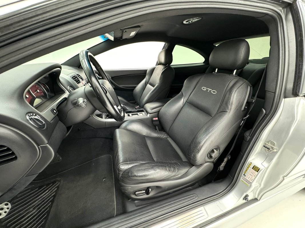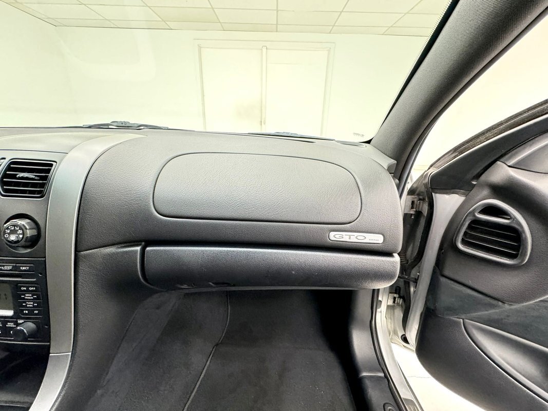 Fashioned from black curved molded vinyl and a strip of suede, the door panels are as aerodynamic as the exterior. High back extra bolster support buckets in black leather have an embroidered GTO in their uppers. These seats are power adjustable and in back is a 2 plus 2 bench setup stretching from B pillar to B pillar. In the center is a curved molded console that makes its way gracefully upward and melting into the dash. On its way is a Blaupunkt 6-disc AM/FM/CD radio, green screen readout for information and fan and temperature knobs. The dash borrows styling directly from Porsche with the overlapping red background circle gauges, and more green readouts, under a curved dash top visor. Black carpet for the floors and more molded panels covered with slightly fuzzy charcoal gray material for the headliner.