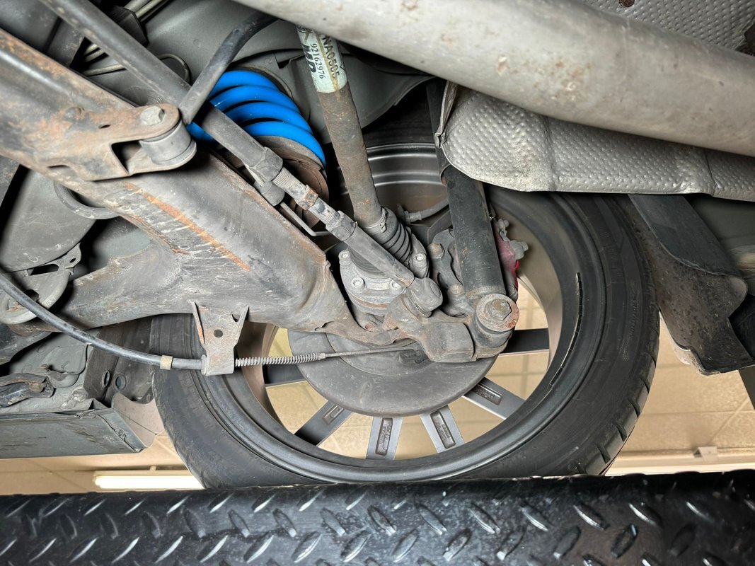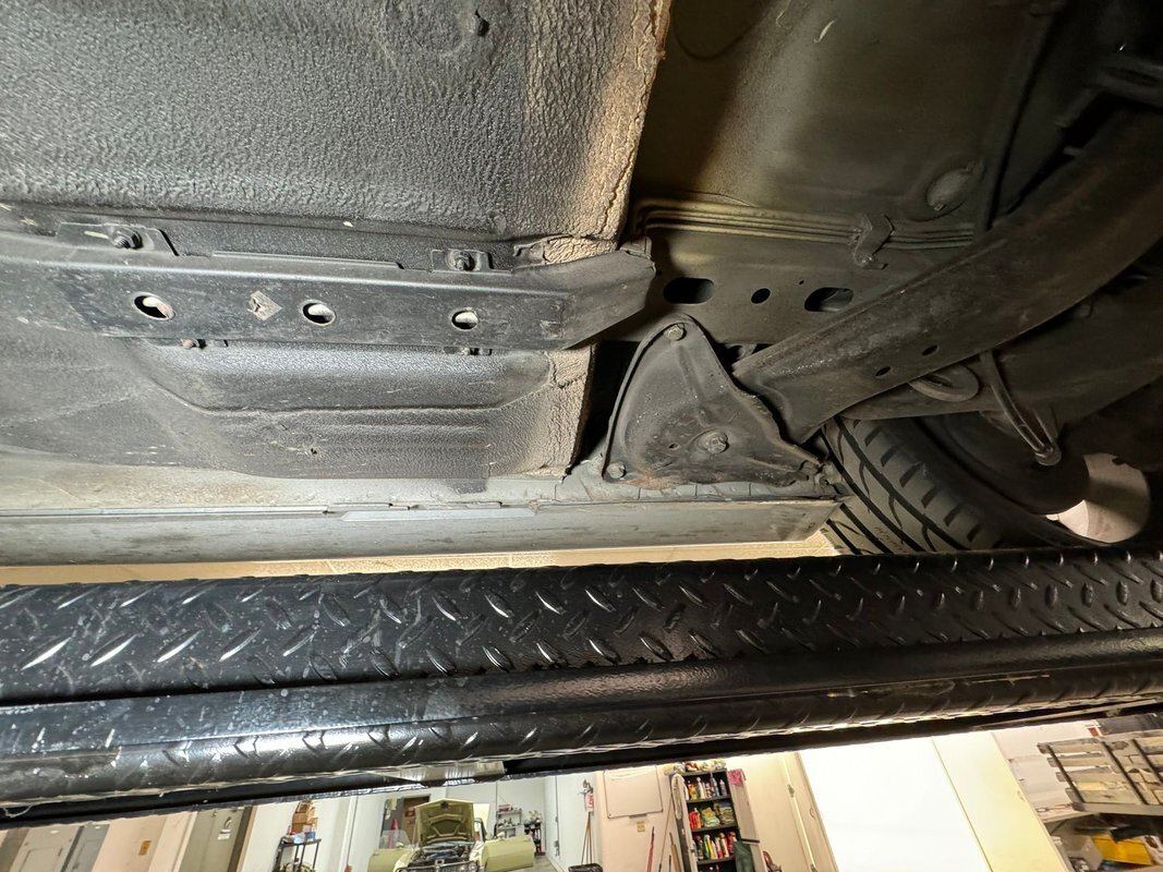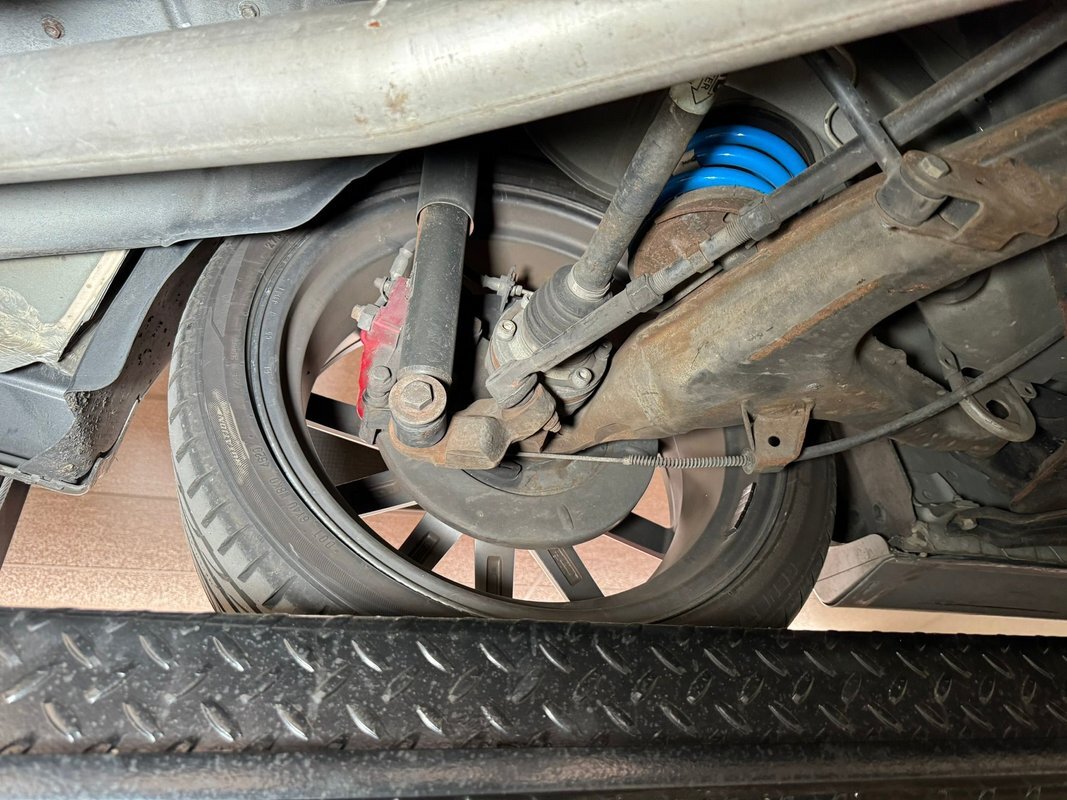 Up on the lift some slight surface rust but all structurally sound with the unibody construction. All independent suspension, and all power disc brakes all around for this car. Adjustable coilovers are in front, and lowering springs are in back. Noted, there is still a noticeable bend in the left front unibody rail near the radiator support (see photos 68 and 69).