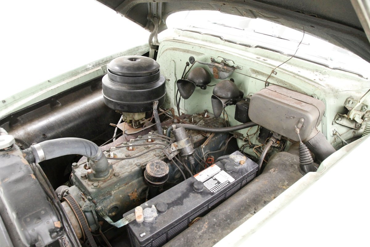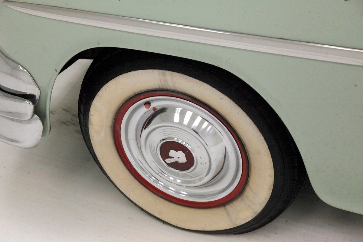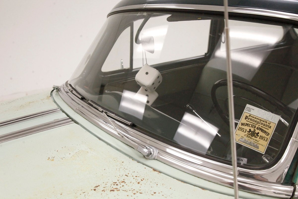 For consignment, a 2 owner original two tone patinaed paint car with chrome trimmings aplenty. This car is all original, has a newly rebuilt carburetor, new starter and a new exhaust system. It is a flat 8 cylinder inline engine, and run by a 6 volt electrical system. The interior is all good and looking the early 50's part.