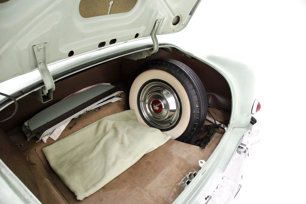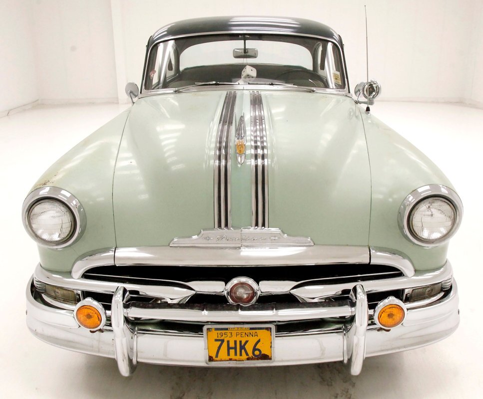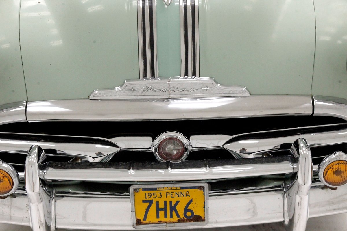Up front envelope designs prevailed, which GM called "flow-through-fender" styling, though the rear quarters retained the suggestion of the old pontoon fenders. Model year 1953 marked the best-selling year for the Chieftain Eight. The 1949 chassis, suitably refined after four years in production, was stretched 2 inches for a 122-inch wheelbase. Styling was squared up with one-piece windshields and wraparound rear glass. Emblematic of the kind of fine detail that distinguished Pontiac in this time period. A large grille with several horizontal bars stretching across it to protect it, leads the way. Fog lights are attached to said bumper and the fenders have a single chrome bezel headlight on each corner framing the grille. A big bulbous hood rises from the grille and has the iconic lighted Pontiac Chief hood ornament. Two curved bars frame the ornament and run the gamut of the car even showing up on the trunk to finish framing the trunk lid opener. All the side slabs of the car are some nifty chromed storm spears and these run the length of the car's sides. Some chrome trimmings also for the lower glass surrounds, pontoon rear quarter protectors and framing the gas tank door. The lowers of the car make use of the light Linden Green paint which is optional to the car. There are some chip off and dulling but it is original paint. The roofline which features a two tone dark Spruce Green and a wrap around rear glass is in good condition with no rust. The glass is all clear and as we bring up the rear, small rounded over fins frame the trunk lid and have a single round tail light on their lowers and a Chief badge on either side near the top fins. Another large chrome bumper brings up the rear and it has an extra horizontal bar to frame the license plate and protect the lid and its large latch operation. Wide yellowed white walls are riding on red wheels with a chromed hubcap on all corners featuring more chieftain badging in the centers.
