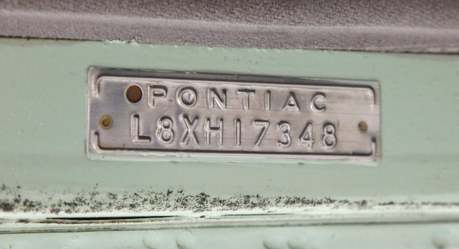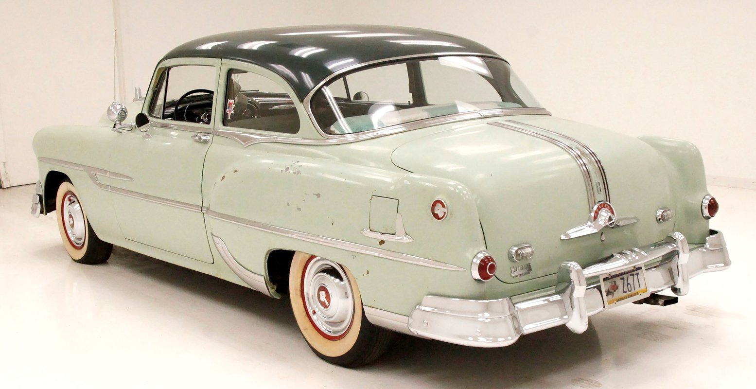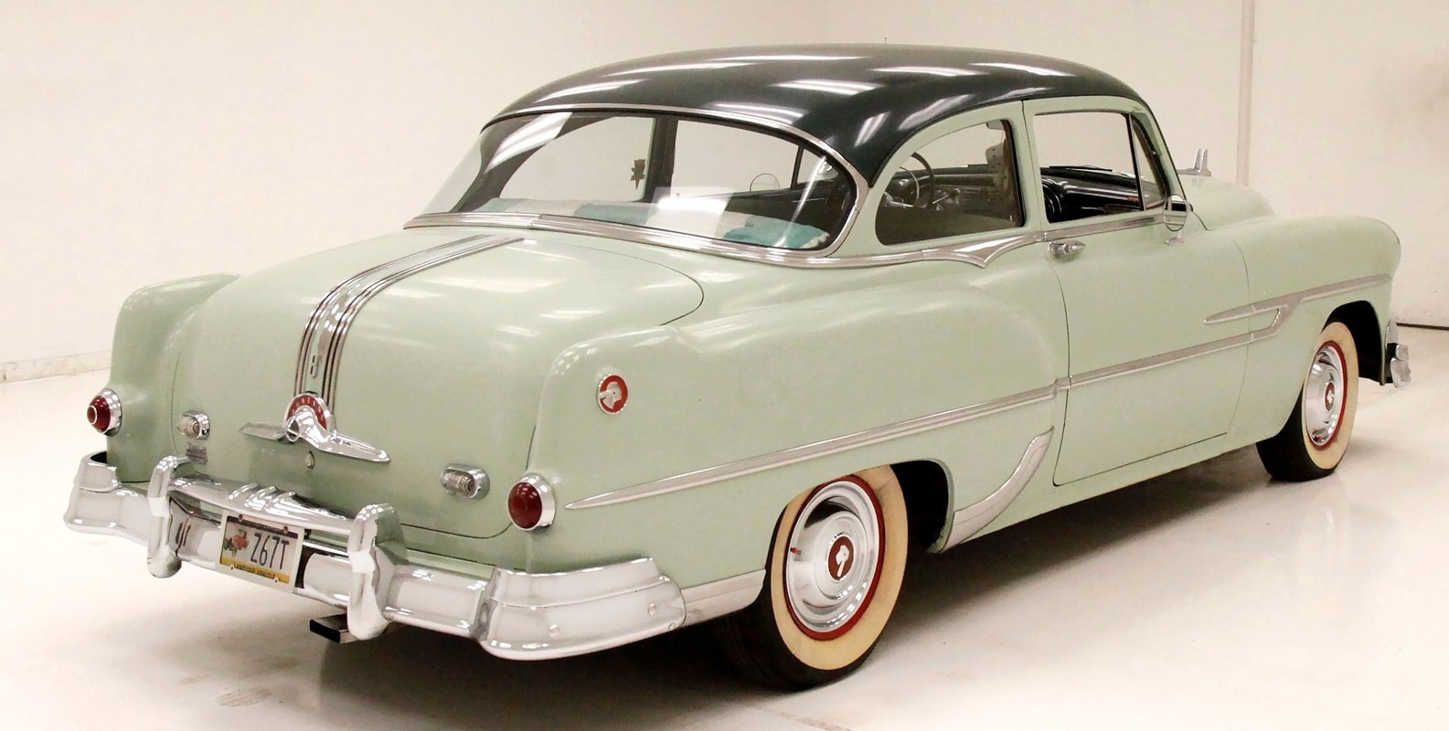 Up front envelope designs prevailed, which GM called "flow-through-fender" styling, though the rear quarters retained the suggestion of the old pontoon fenders. Model year 1953 marked the best-selling year for the Chieftain Eight. The 1949 chassis, suitably refined after four years in production, was stretched 2 inches for a 122-inch wheelbase. Styling was squared up with one-piece windshields and wraparound rear glass. Emblematic of the kind of fine detail that distinguished Pontiac in this time period. A large grille with several horizontal bars stretching across it to protect it, leads the way. Fog lights are attached to said bumper and the fenders have a single chrome bezel headlight on each corner framing the grille. A big bulbous hood rises from the grille and has the iconic lighted Pontiac Chief hood ornament. Two curved bars frame the ornament and run the gamut of the car even showing up on the trunk to finish framing the trunk lid opener. All the side slabs of the car are some nifty chromed storm spears and these run the length of the car's sides. Some chrome trimmings also for the lower glass surrounds, pontoon rear quarter protectors and framing the gas tank door. The lowers of the car make use of the light Linden Green paint which is optional to the car. There are some chip off and dulling but it is original paint. The roofline which features a two tone dark Spruce Green and a wrap around rear glass is in good condition with no rust. The glass is all clear and as we bring up the rear, small rounded over fins frame the trunk lid and have a single round tail light on their lowers and a Chief badge on either side near the top fins. Another large chrome bumper brings up the rear and it has an extra horizontal bar to frame the license plate and protect the lid and its large latch operation. Wide yellowed white walls are riding on red wheels with a chromed hubcap on all corners featuring more chieftain badging in the centers.