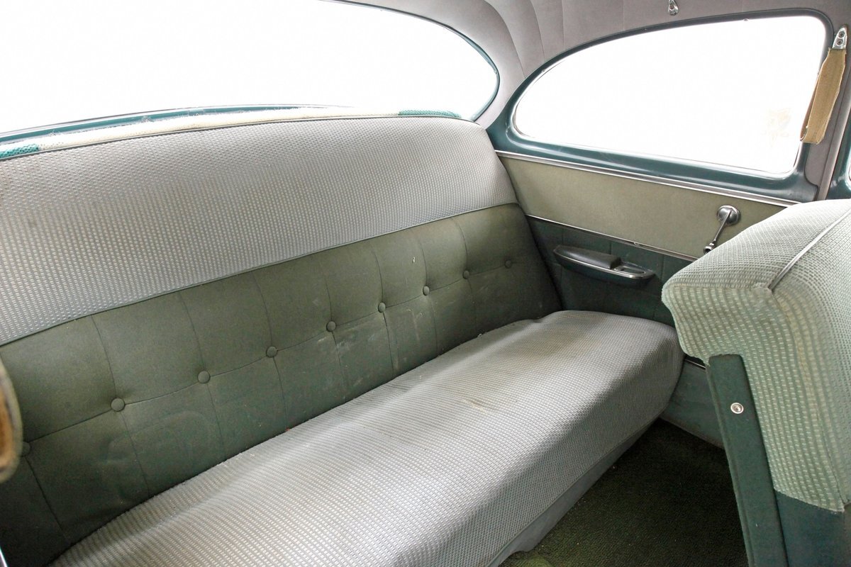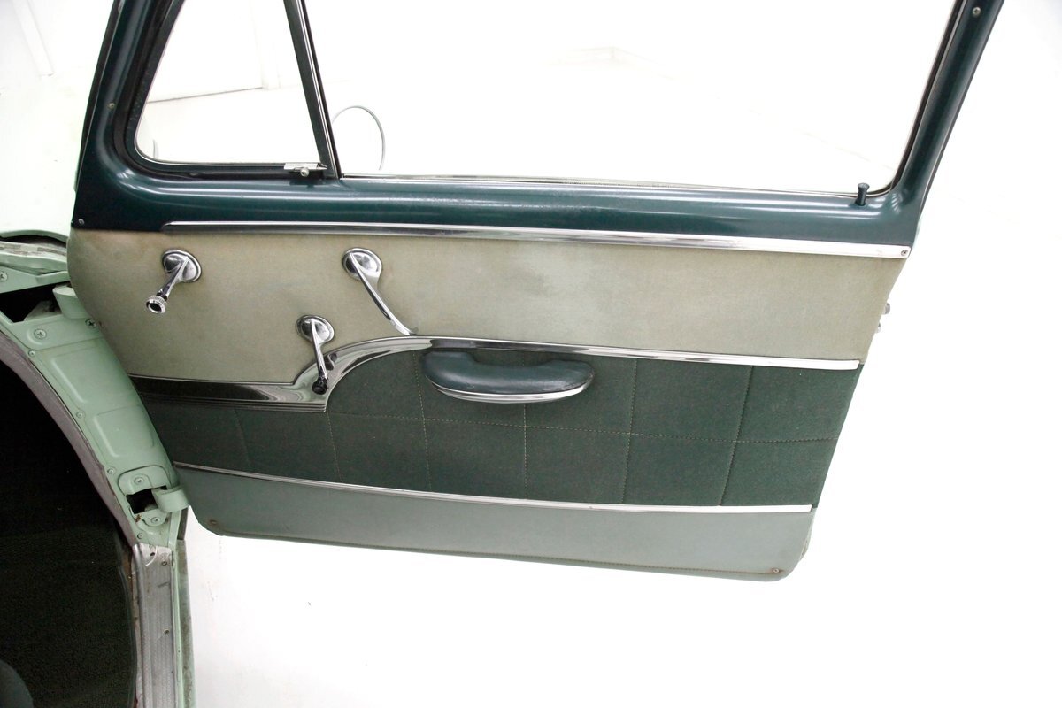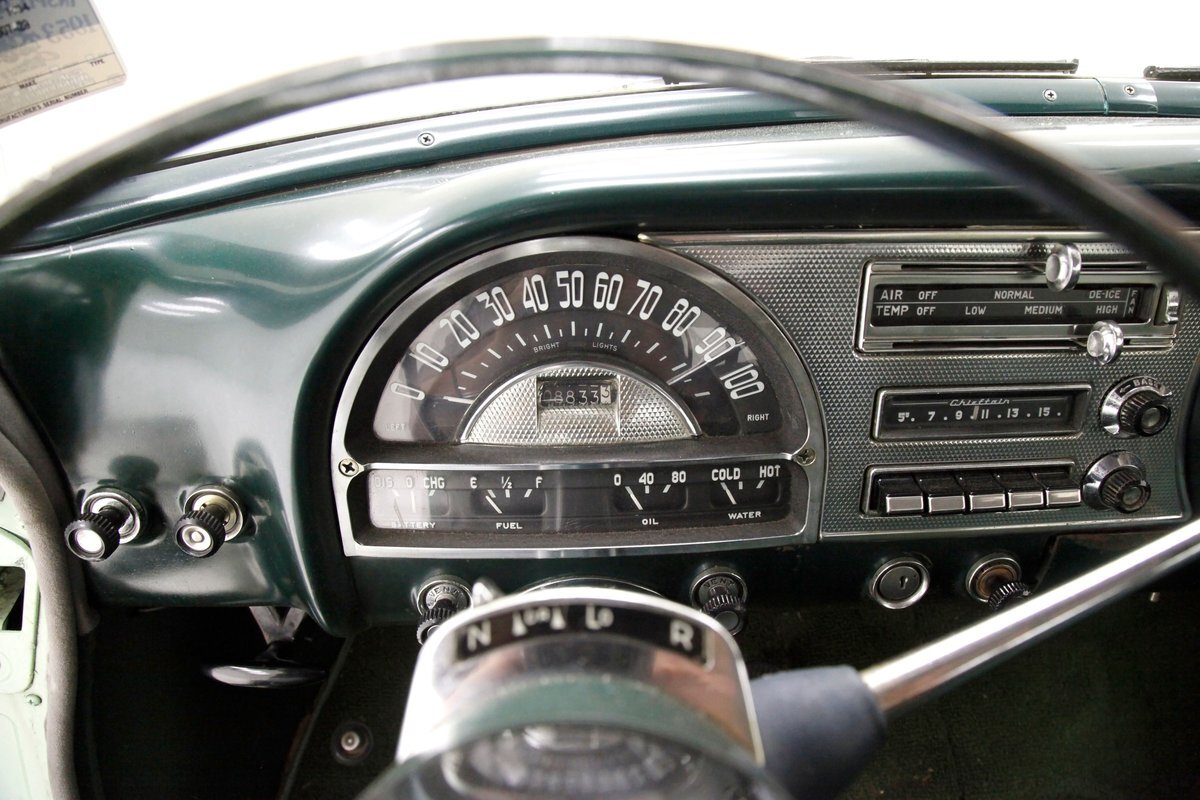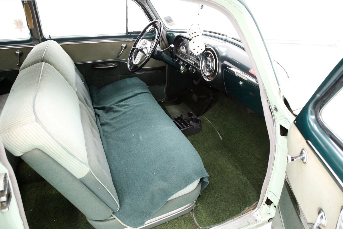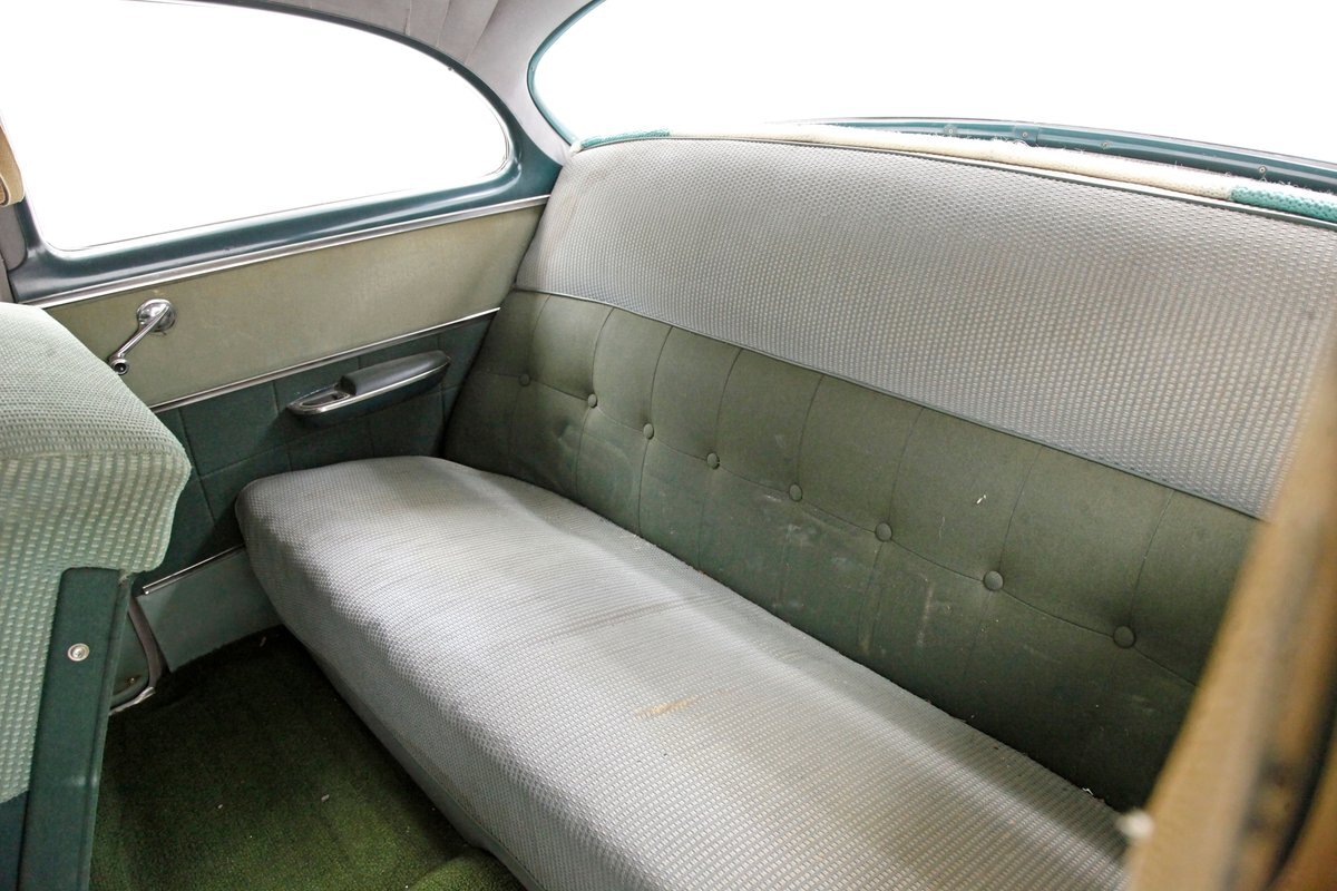 As we swing the door to enter, we are greeted with original interior door panels which present in excellent condition. They have metal green sills, a chrome trim piece delineating the lighter green vinyl uppers, then more chrome trimmings this time curved which frames a square stitched broadcloth dark green panel to hold the armrest. Lowers are a mild blue green vinyl to finish off the wonderful panels. Slipping inside, we freeze with a front split back bench that has cream and light green striped broadcloth uppers and darker green lowers all delineated by green piping. These chairs are nicely overstuffed and sit in a chrome edged tub. The driver's side has a hole in it. In back another matching bench is in featuring more striped cream uppers, buttoned dark green mids, and checked striped seats. A bit soiled but all good as to the condition. A full metal jacket dash features lots of chrome bezeled instruments, sliders and pulls and a round jet engine styled central clock and even a working radio. Spruce Green is the actual dash amidst all this chrome and all excellent. An original bakelite wheel is in with a central Chieftain hub front this early 50's design and green carpeting floods the floors and is good, as is the beautiful clean headliner floating tightly above.