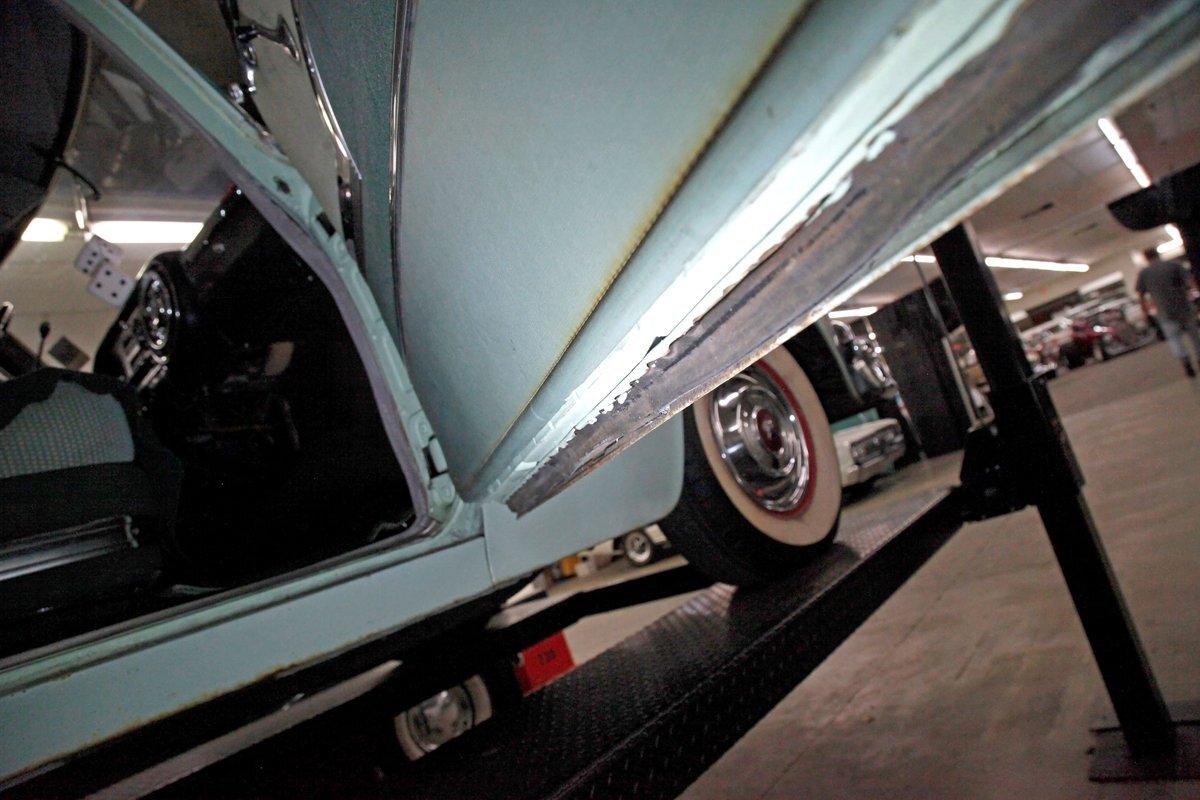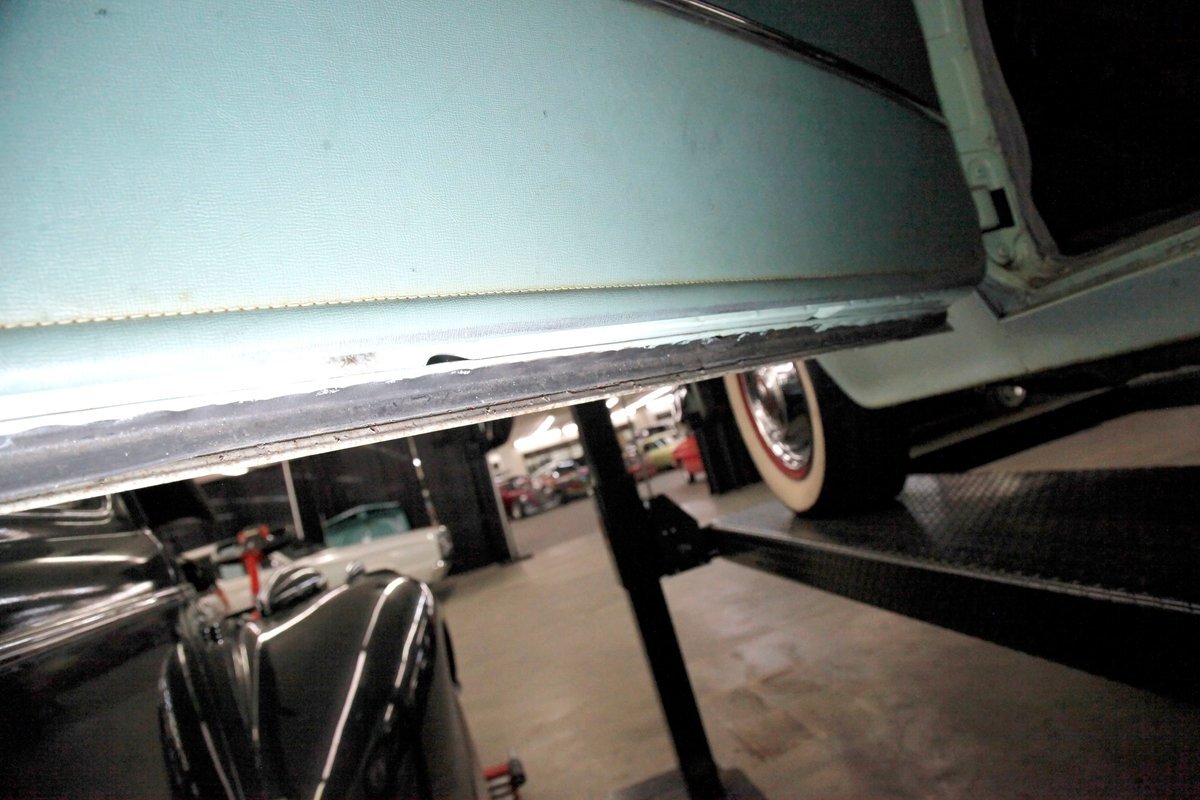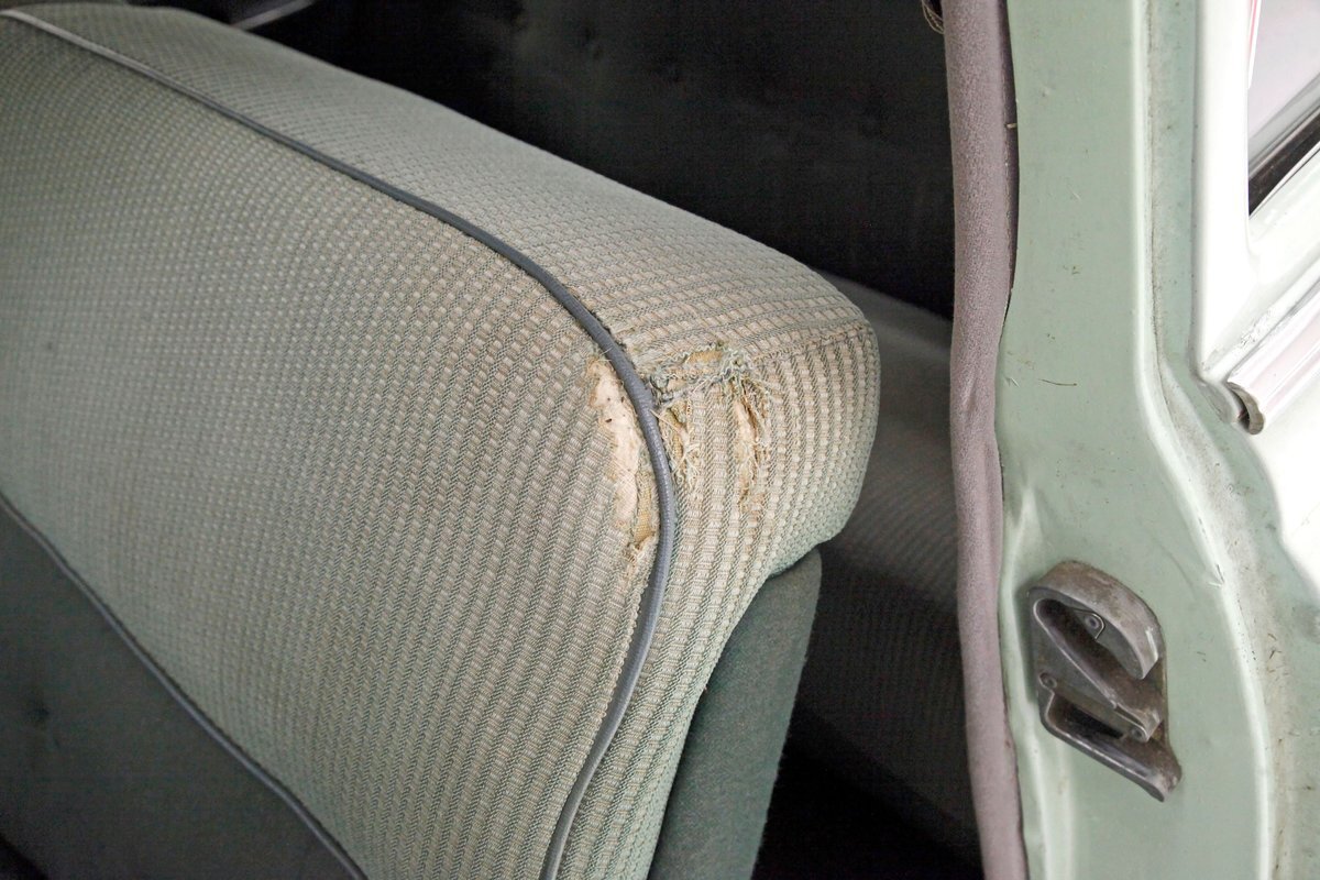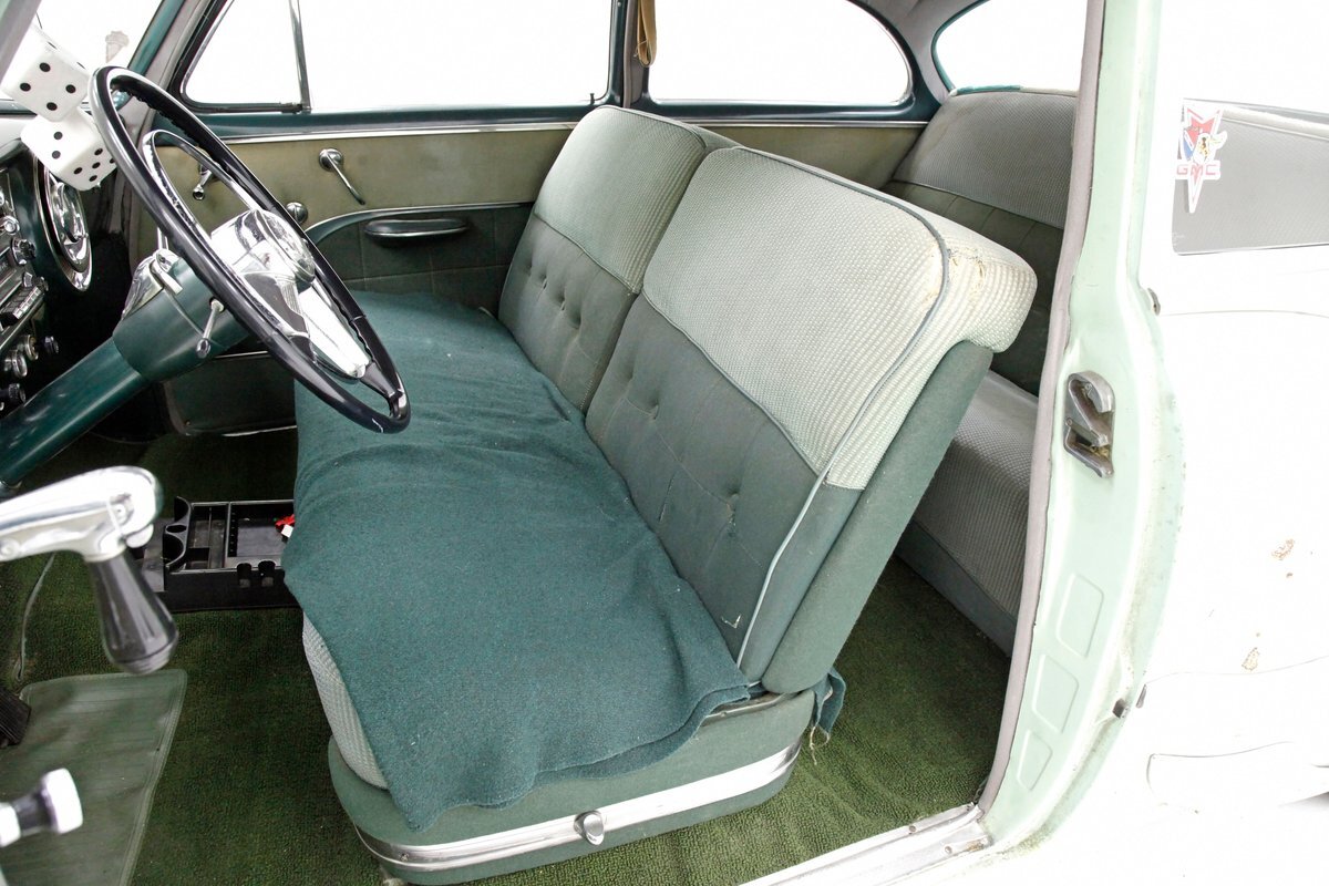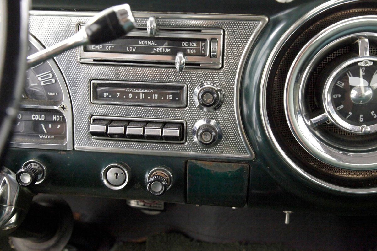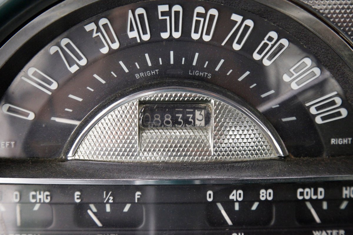 As we swing the door to enter, we are greeted with original interior door panels which present in excellent condition. They have metal green sills, a chrome trim piece delineating the lighter green vinyl uppers, then more chrome trimmings this time curved which frames a square stitched broadcloth dark green panel to hold the armrest. Lowers are a mild blue green vinyl to finish off the wonderful panels. Slipping inside, we freeze with a front split back bench that has cream and light green striped broadcloth uppers and darker green lowers all delineated by green piping. These chairs are nicely overstuffed and sit in a chrome edged tub. The driver's side has a hole in it. In back another matching bench is in featuring more striped cream uppers, buttoned dark green mids, and checked striped seats. A bit soiled but all good as to the condition. A full metal jacket dash features lots of chrome bezeled instruments, sliders and pulls and a round jet engine styled central clock and even a working radio. Spruce Green is the actual dash amidst all this chrome and all excellent. An original bakelite wheel is in with a central Chieftain hub front this early 50's design and green carpeting floods the floors and is good, as is the beautiful clean headliner floating tightly above.