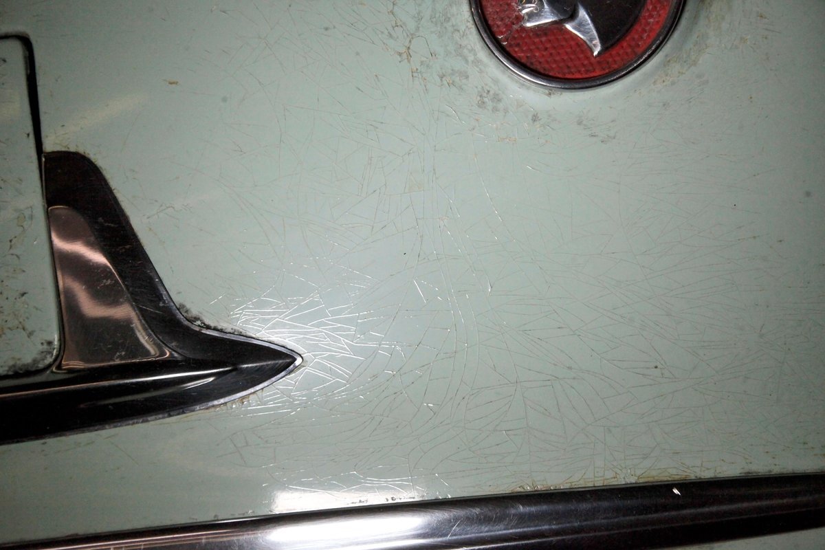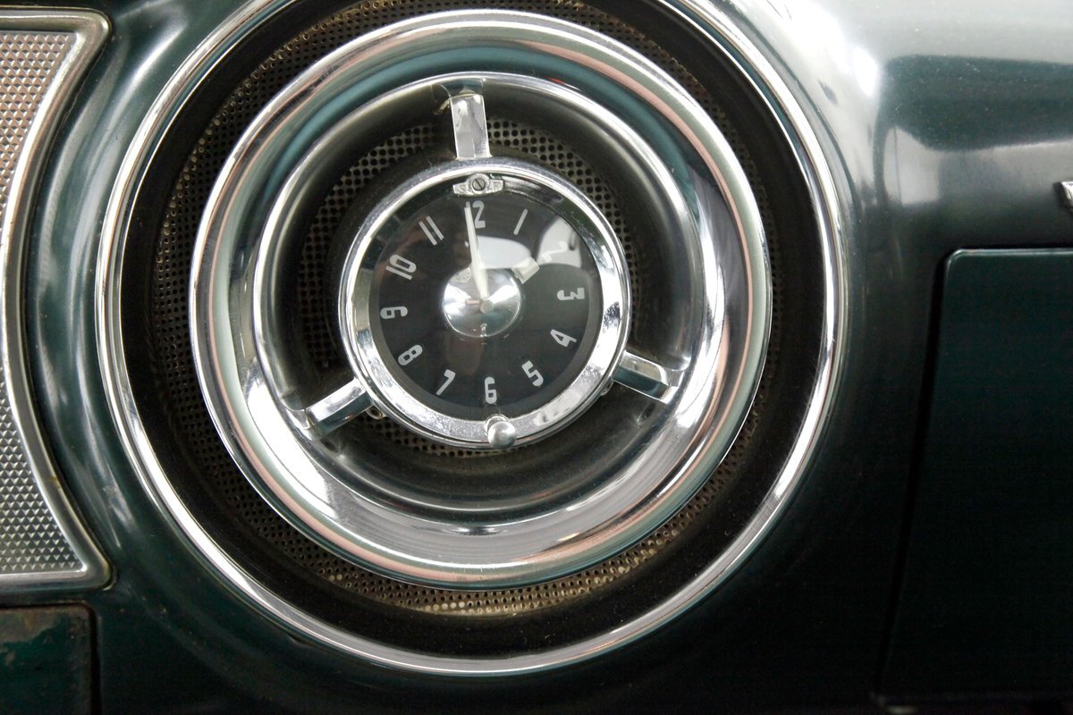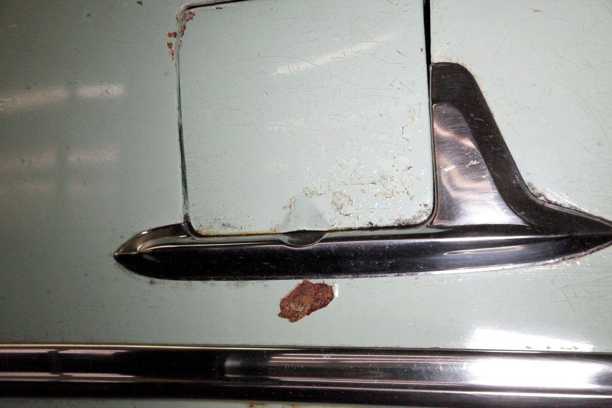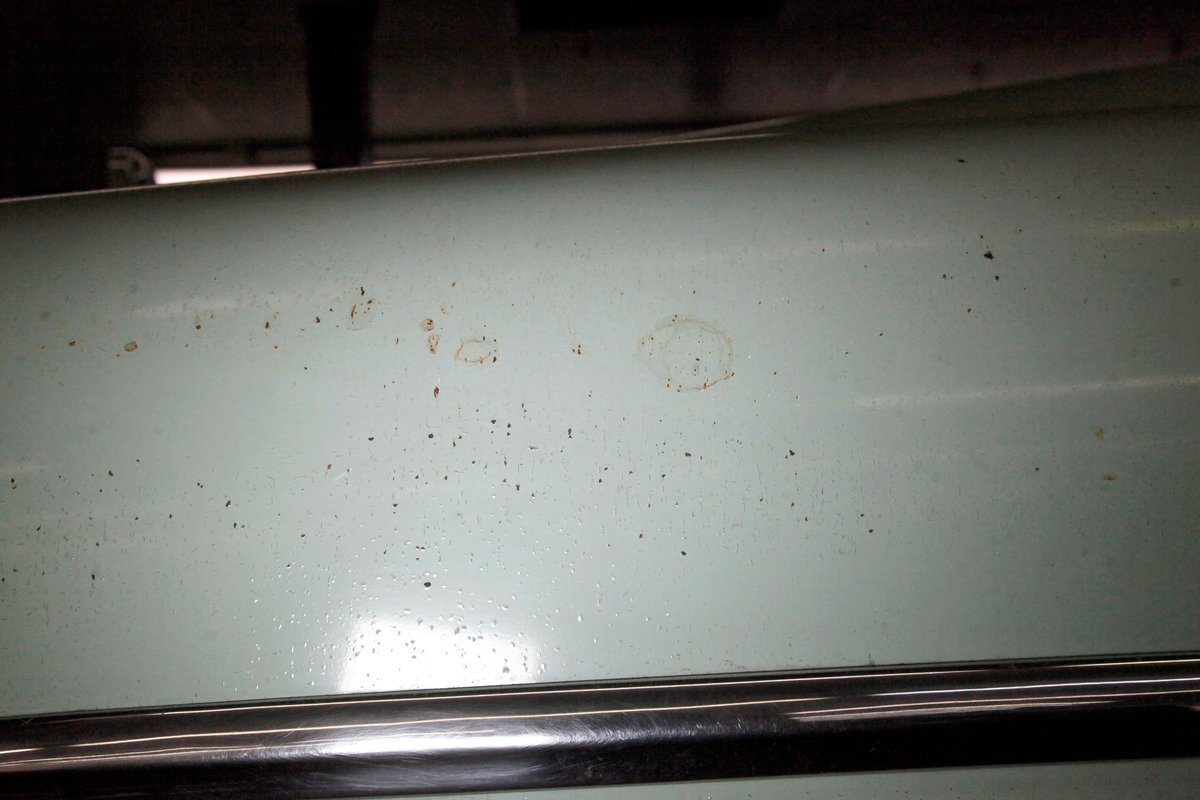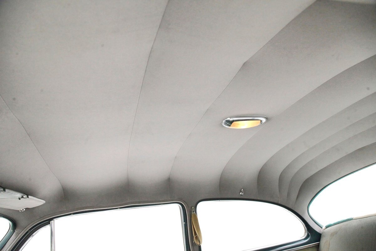 As we swing the door to enter, we are greeted with original interior door panels which present in excellent condition. They have metal green sills, a chrome trim piece delineating the lighter green vinyl uppers, then more chrome trimmings this time curved which frames a square stitched broadcloth dark green panel to hold the armrest. Lowers are a mild blue green vinyl to finish off the wonderful panels. Slipping inside, we freeze with a front split back bench that has cream and light green striped broadcloth uppers and darker green lowers all delineated by green piping. These chairs are nicely overstuffed and sit in a chrome edged tub. The driver's side has a hole in it. In back another matching bench is in featuring more striped cream uppers, buttoned dark green mids, and checked striped seats. A bit soiled but all good as to the condition. A full metal jacket dash features lots of chrome bezeled instruments, sliders and pulls and a round jet engine styled central clock and even a working radio. Spruce Green is the actual dash amidst all this chrome and all excellent. An original bakelite wheel is in with a central Chieftain hub front this early 50's design and green carpeting floods the floors and is good, as is the beautiful clean headliner floating tightly above.