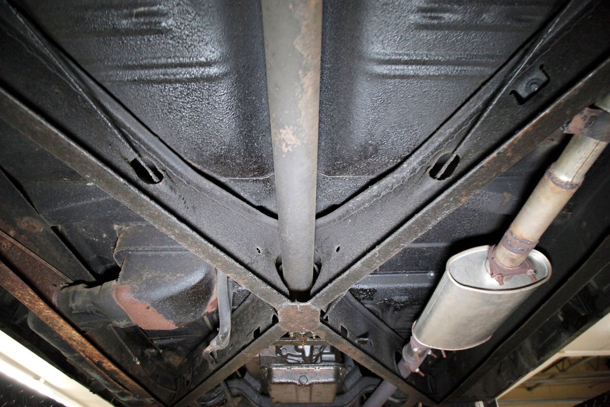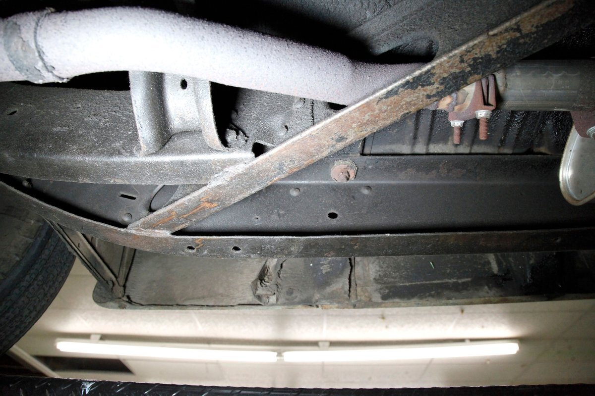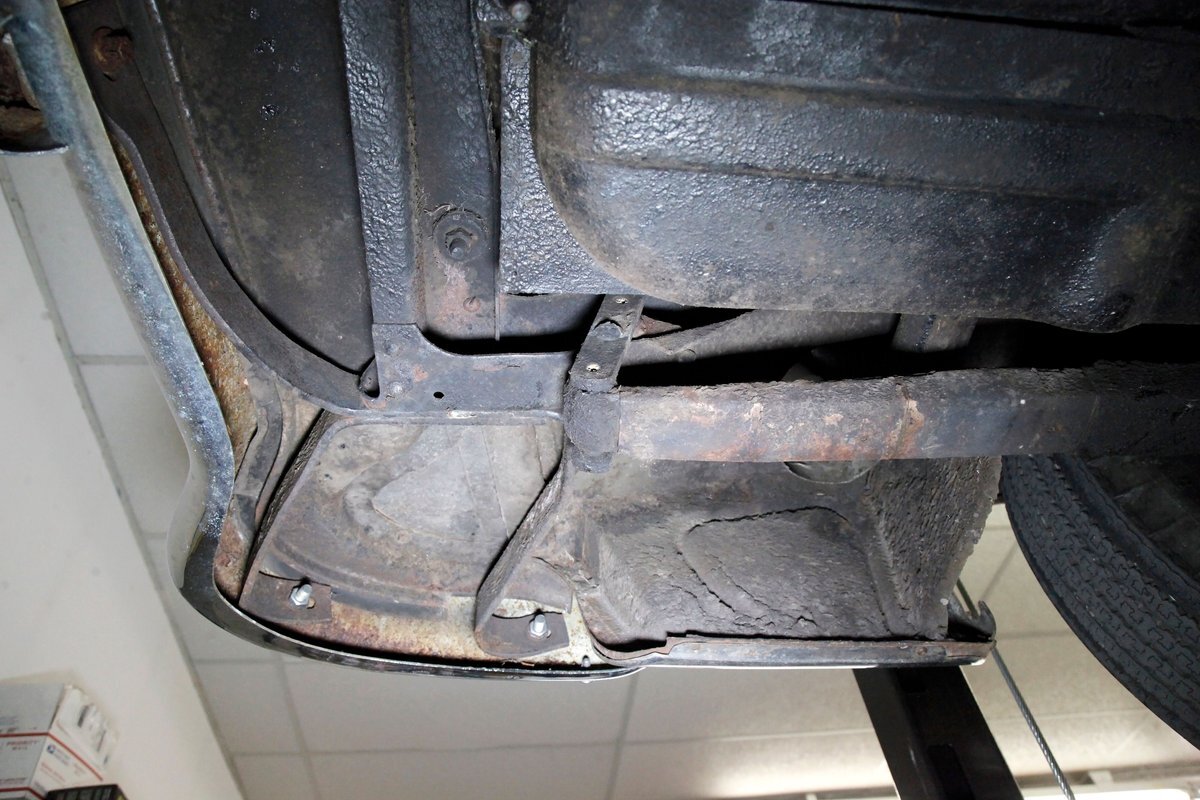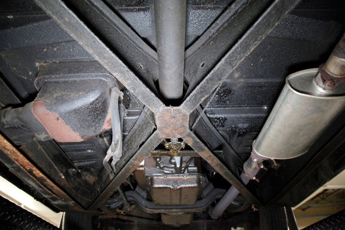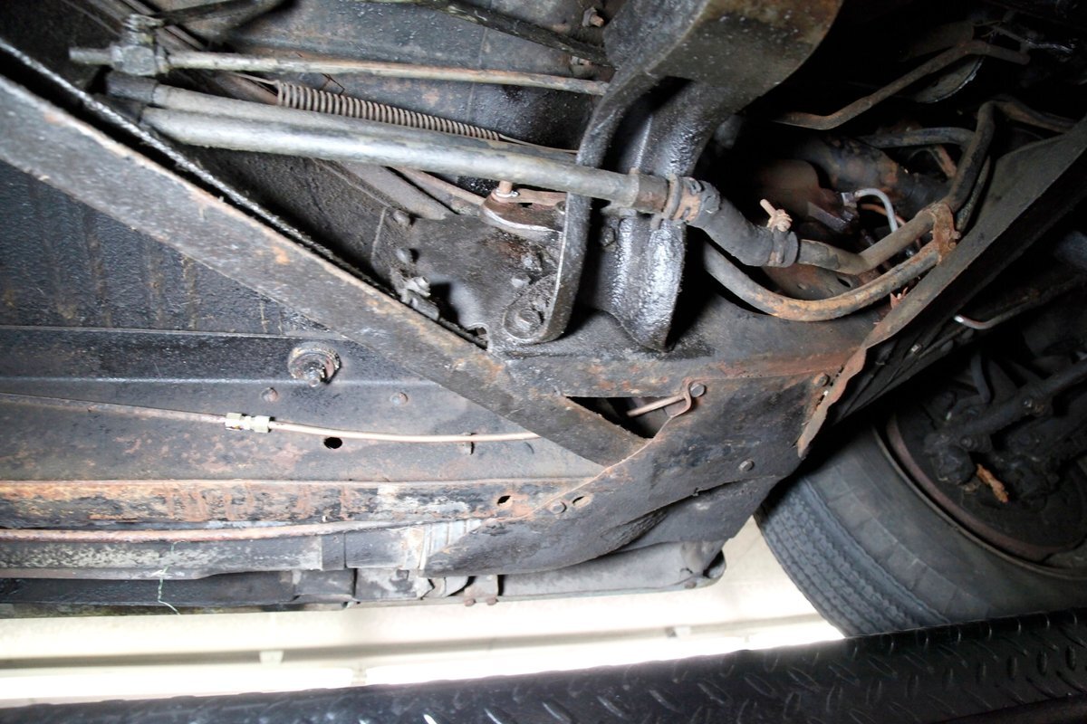 Appearing at one point to probably have been recoated with rustproofing and some rattle can touch up, we see a solid frame, slight surface rust on the edges of the inner bodywork, and an X frame. The suspension is independent coil springs in front, and on back we note leaf springs. Drum brakes are on all 4 corners. Pretty solid and mostly rust free under here.