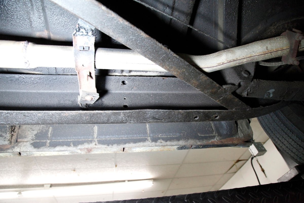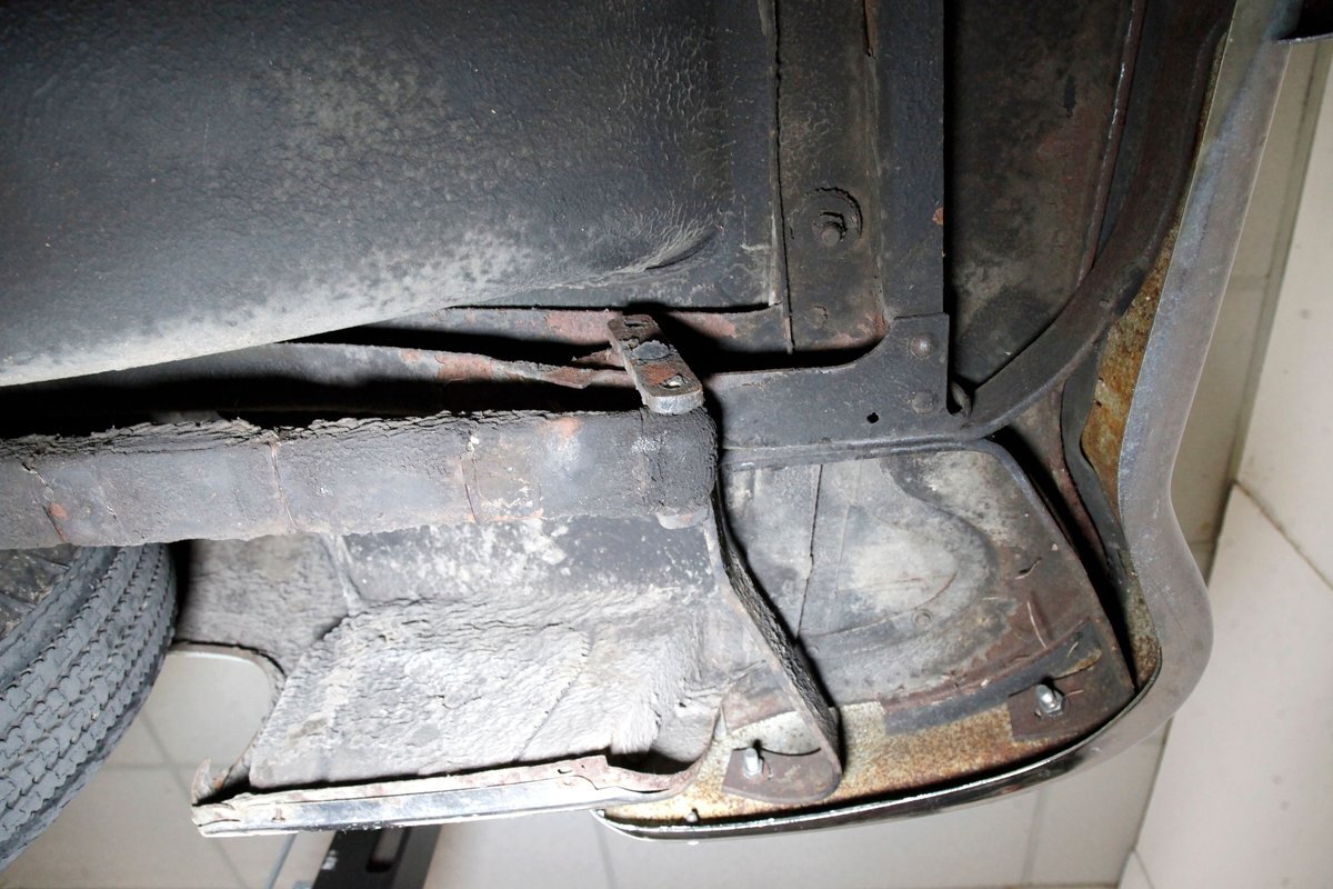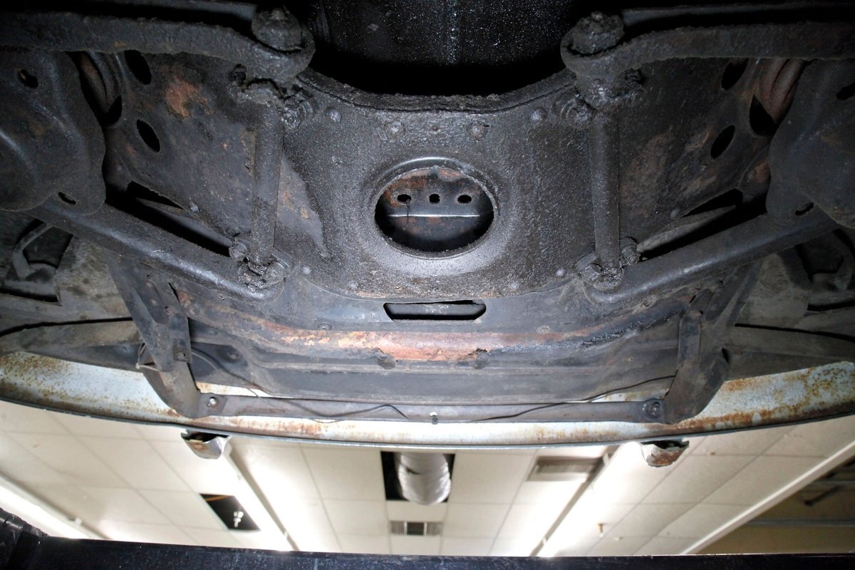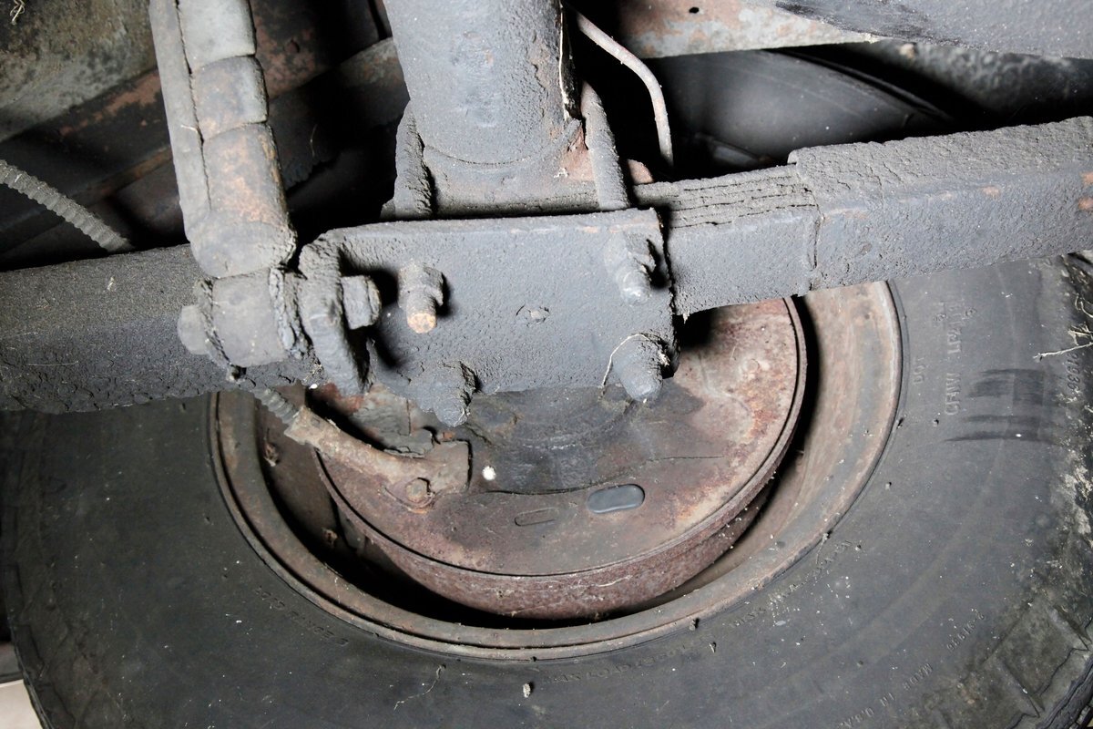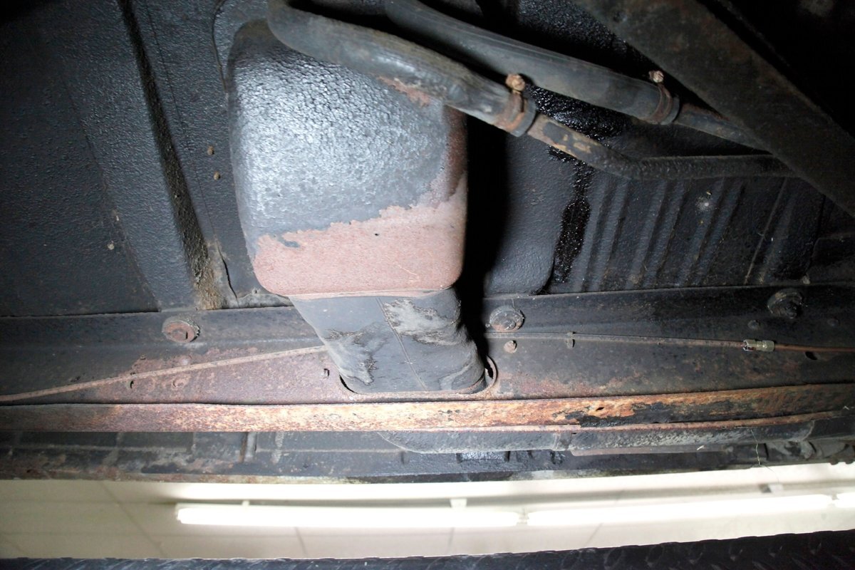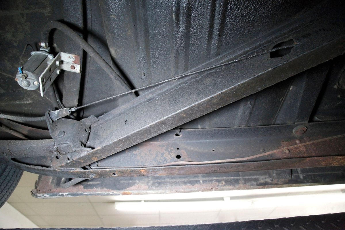 Appearing at one point to probably have been recoated with rustproofing and some rattle can touch up, we see a solid frame, slight surface rust on the edges of the inner bodywork, and an X frame. The suspension is independent coil springs in front, and on back we note leaf springs. Drum brakes are on all 4 corners. Pretty solid and mostly rust free under here.