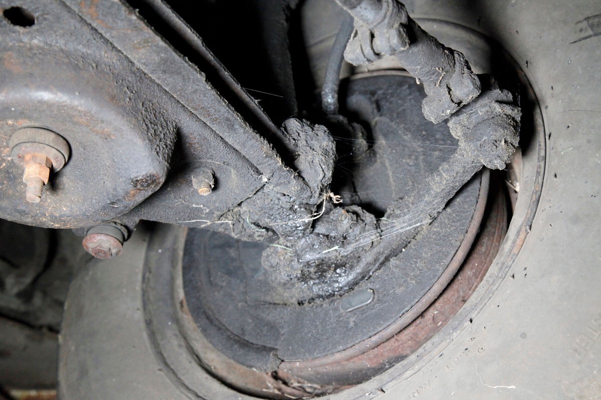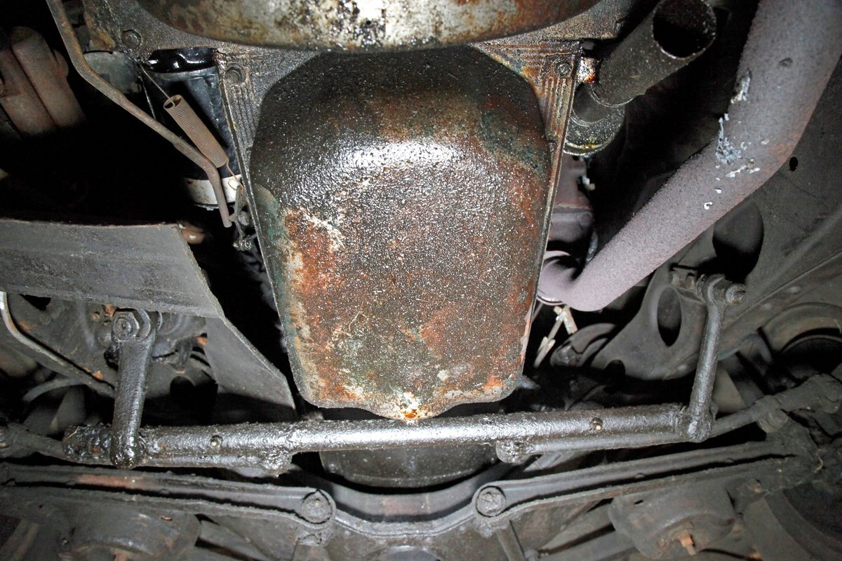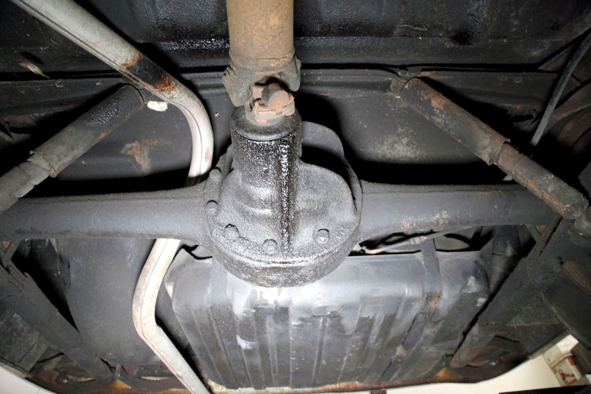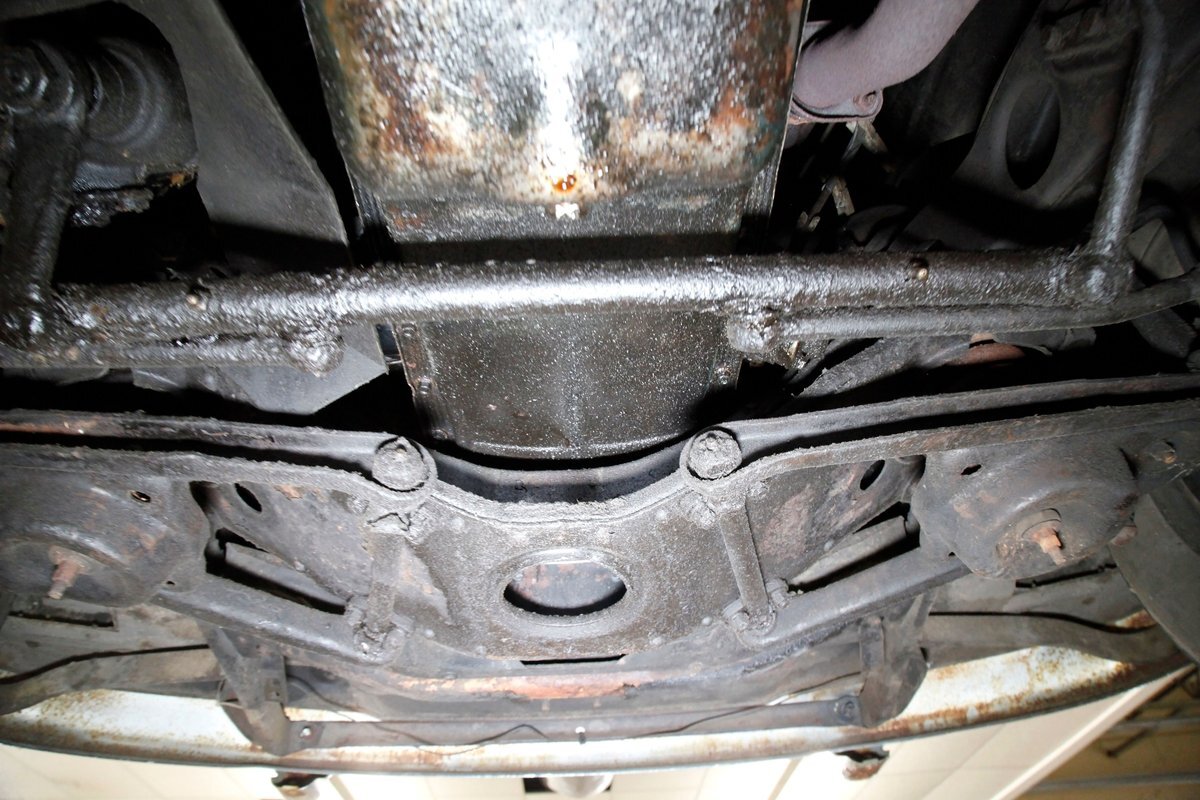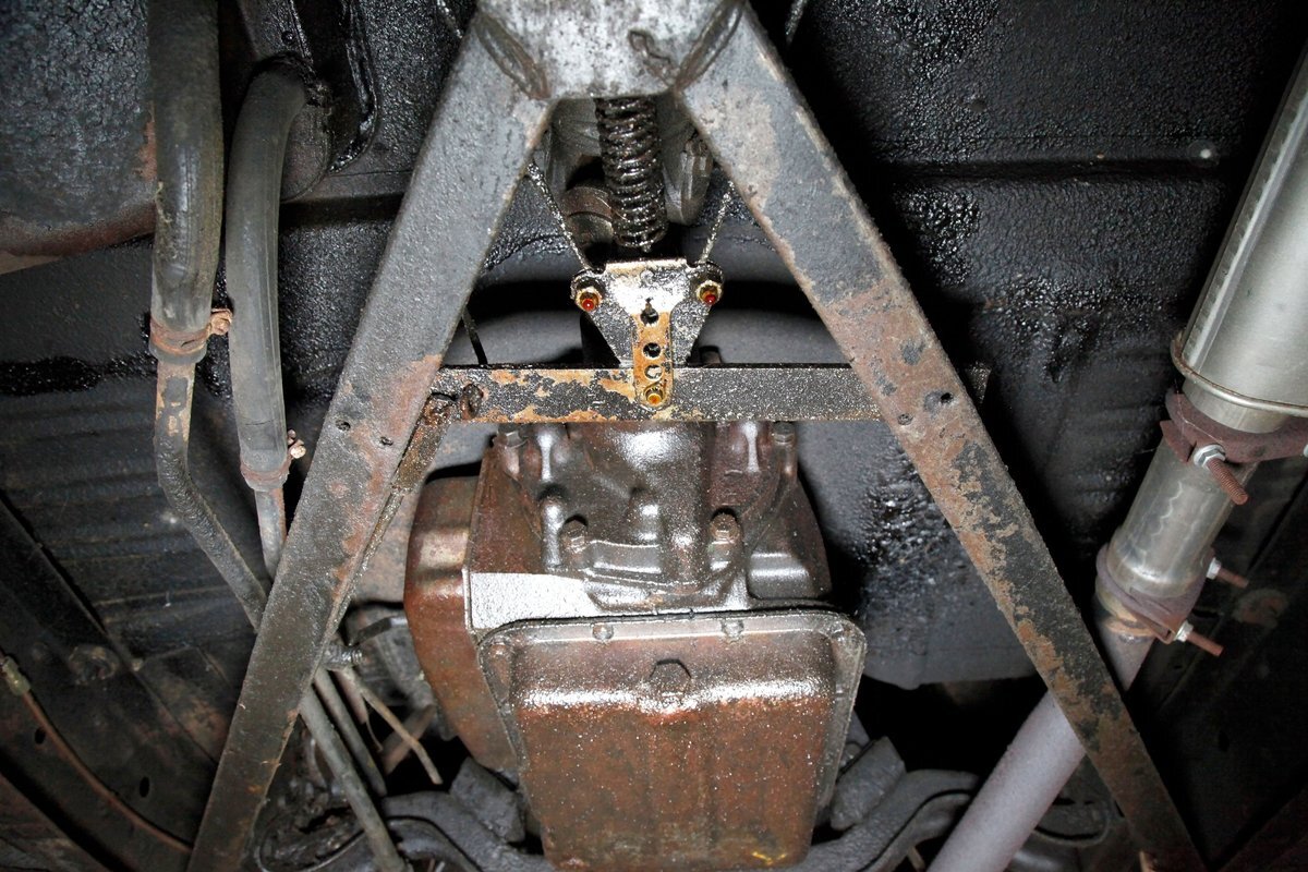 Appearing at one point to probably have been recoated with rustproofing and some rattle can touch up, we see a solid frame, slight surface rust on the edges of the inner bodywork, and an X frame. The suspension is independent coil springs in front, and on back we note leaf springs. Drum brakes are on all 4 corners. Pretty solid and mostly rust free under here.