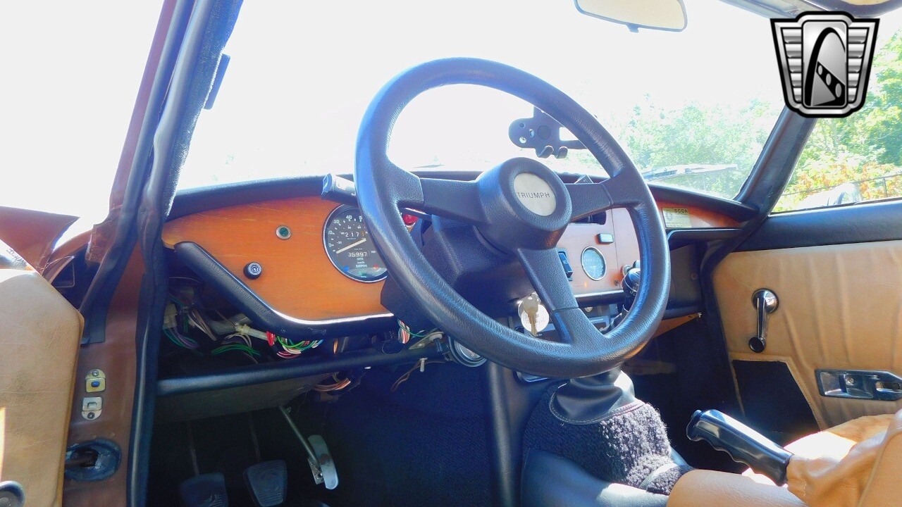 The interior of this Triumph Spitfire is designed with comfort and simplicity in mind for the size of the car. The tan cloth seats provide an inviting atmosphere. For entertainment, the car is equipped with an AM/FM radio.
