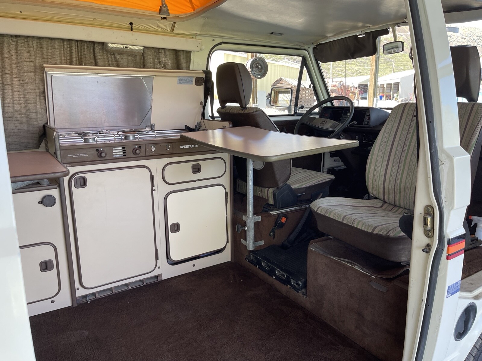 This Westfalia comes fully equipped with all interior and camping gear, all in perfect working order. A newer canvas top effortlessly pops up and down, revealing a well kep interior and practically rust-free undercarriage. The exterior stripes were professionally redone just a year ago.The front seats swivel and accommodate a second dining arrangement. While most of the interior is original, the back mattress if from another westy