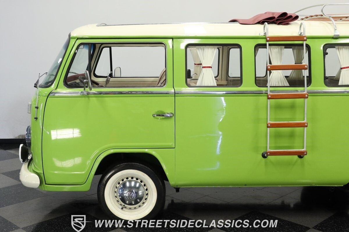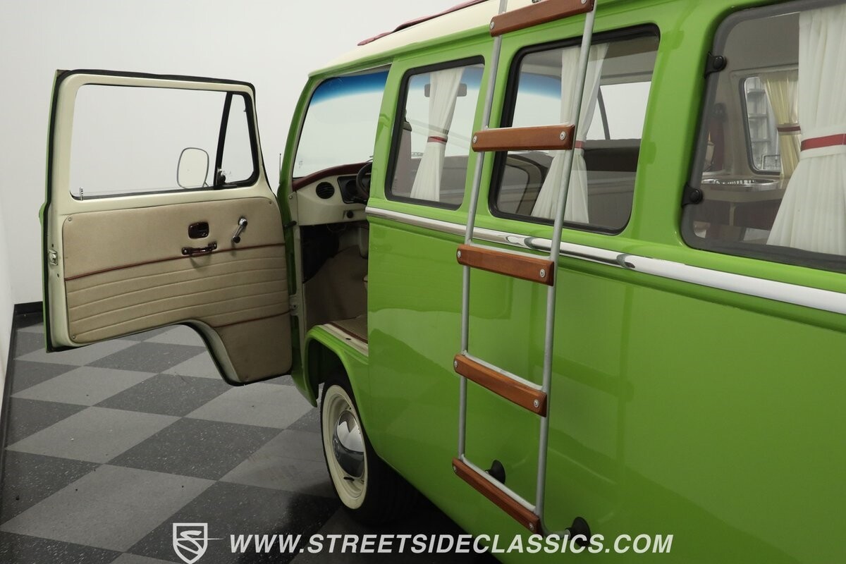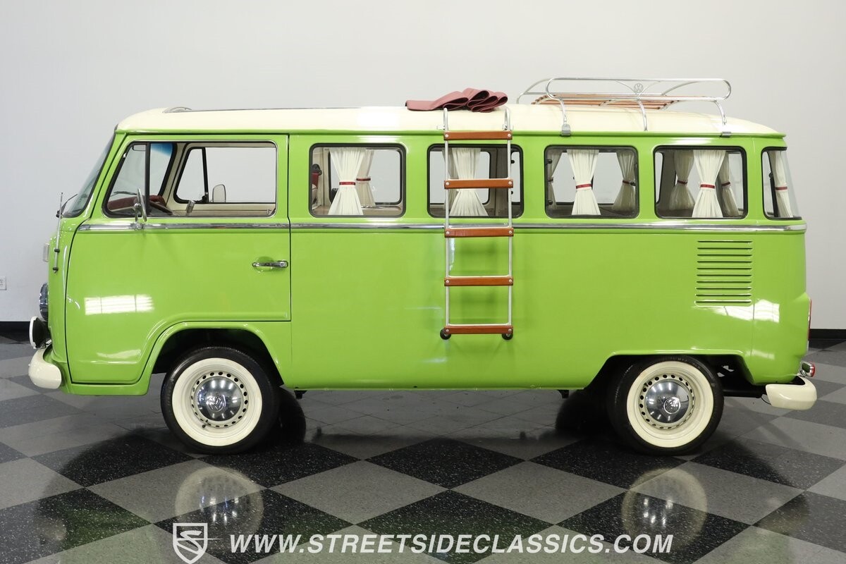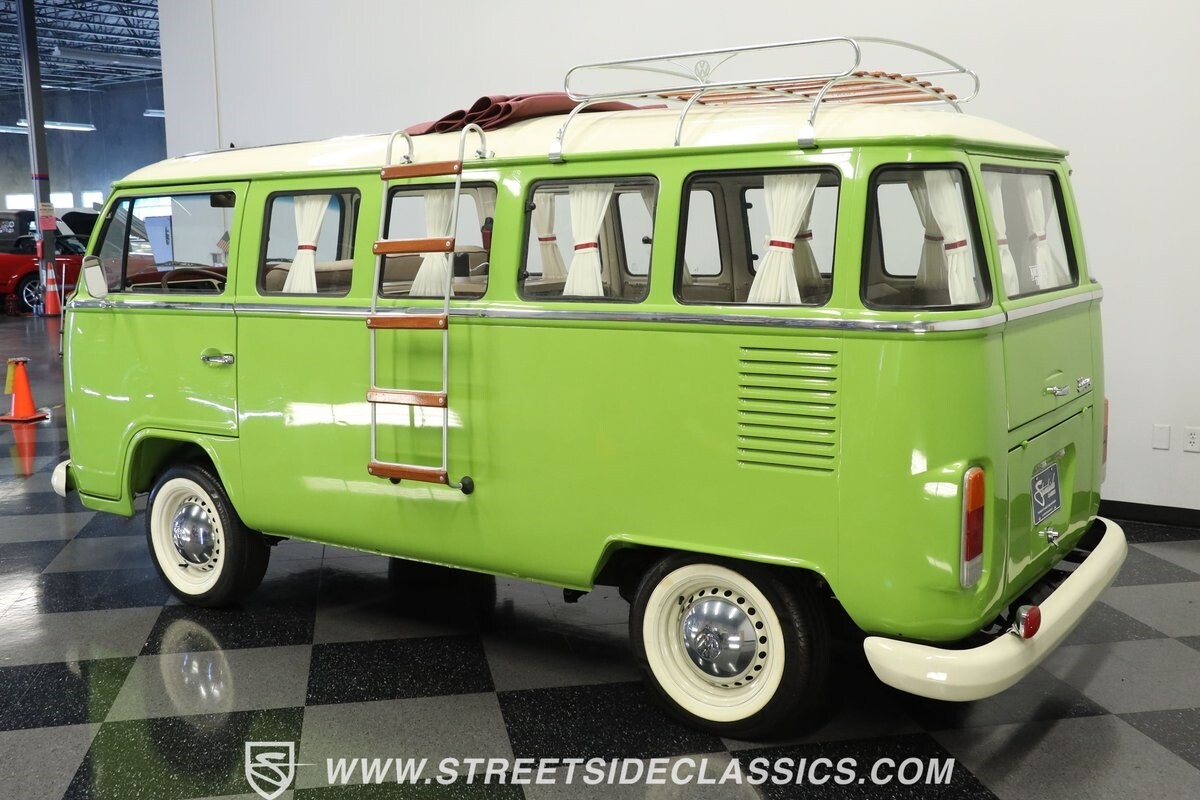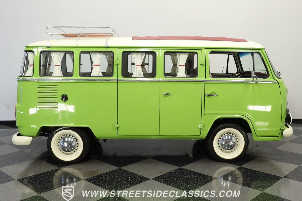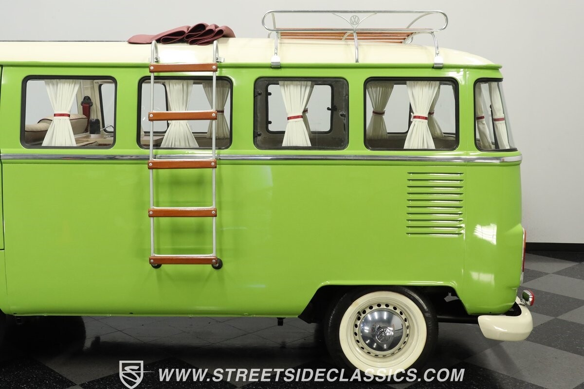 We like a South American VW Bus like this. They were able to incorporate some of the best early Type 2 features into the more efficient Breadvan design. It's basically like they used an icon to create an icon. That's why this is unmistakably a Type 2, and yet, it's also something distinct even in a crowd of VWs. And this one is done right with a high-gloss green paint that shows off the quality of the body panels. Bright chrome trim, fresh weather-stripping, and clean wheel wells all signal that this is a quality restoration. We especially like the white paint. It looks good on the roof, wheels, and bumpers. Plus, it coordinates with fun details like the white Hella light covers in front and the white curtains in all of the side windows. There are even thoughtful little things, like how the red in the curtain holders coordinates with the red canvas sunroof. And not only will you love the look of the vintage roof rack, but the sale also comes with a coordinating aluminum and wood side ladder. So if you do take this one to a campground, you may need to park a little further away for privacy because this detailed Bus attracts plenty of attention.