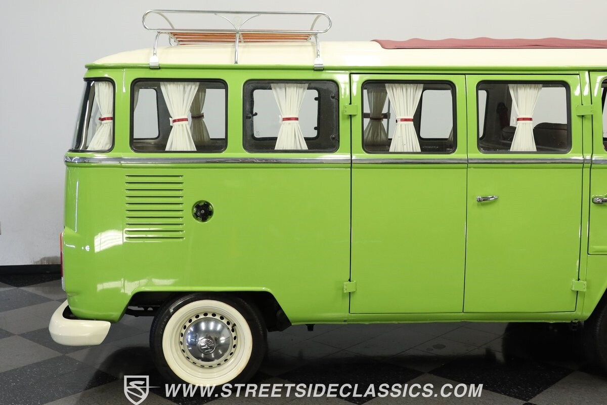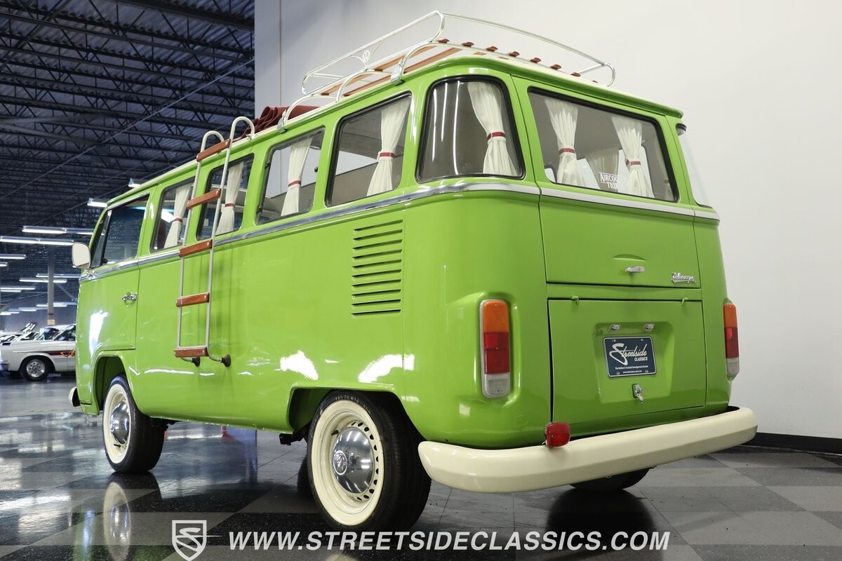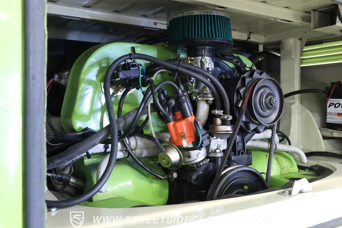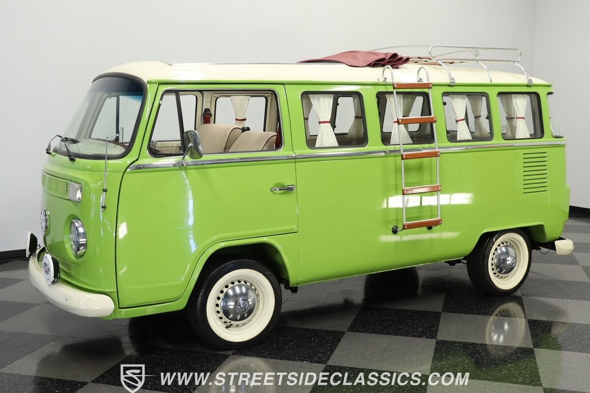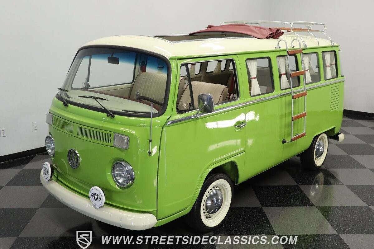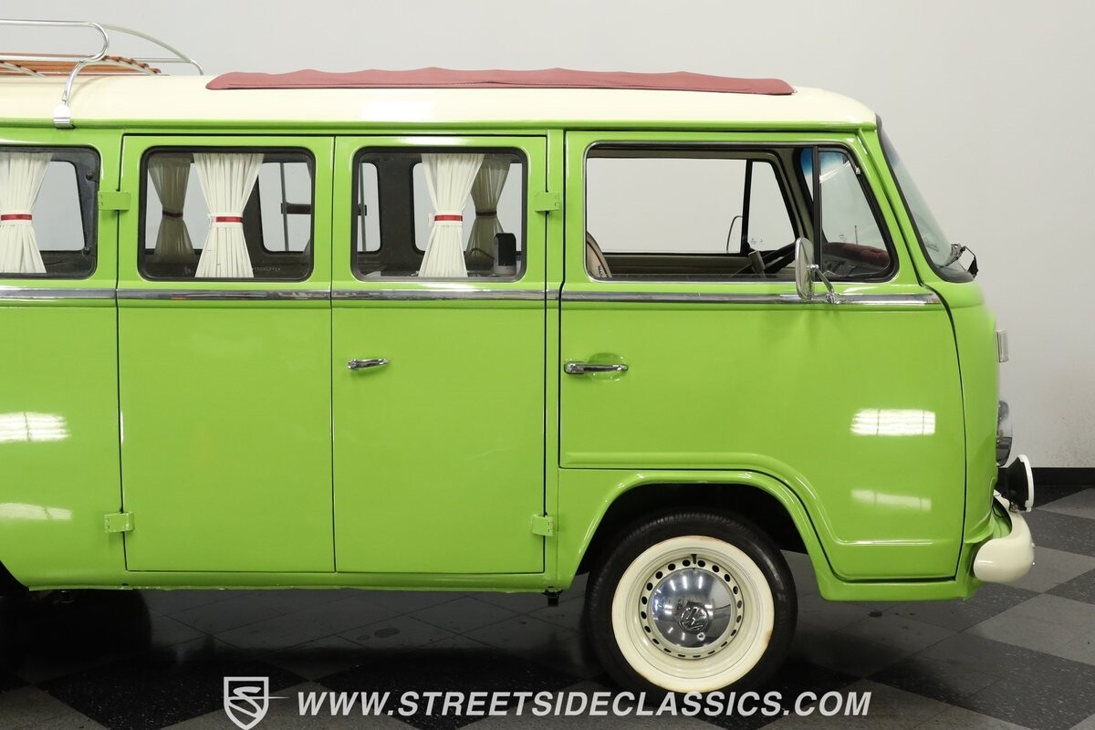 We like a South American VW Bus like this. They were able to incorporate some of the best early Type 2 features into the more efficient Breadvan design. It's basically like they used an icon to create an icon. That's why this is unmistakably a Type 2, and yet, it's also something distinct even in a crowd of VWs. And this one is done right with a high-gloss green paint that shows off the quality of the body panels. Bright chrome trim, fresh weather-stripping, and clean wheel wells all signal that this is a quality restoration. We especially like the white paint. It looks good on the roof, wheels, and bumpers. Plus, it coordinates with fun details like the white Hella light covers in front and the white curtains in all of the side windows. There are even thoughtful little things, like how the red in the curtain holders coordinates with the red canvas sunroof. And not only will you love the look of the vintage roof rack, but the sale also comes with a coordinating aluminum and wood side ladder. So if you do take this one to a campground, you may need to park a little further away for privacy because this detailed Bus attracts plenty of attention.