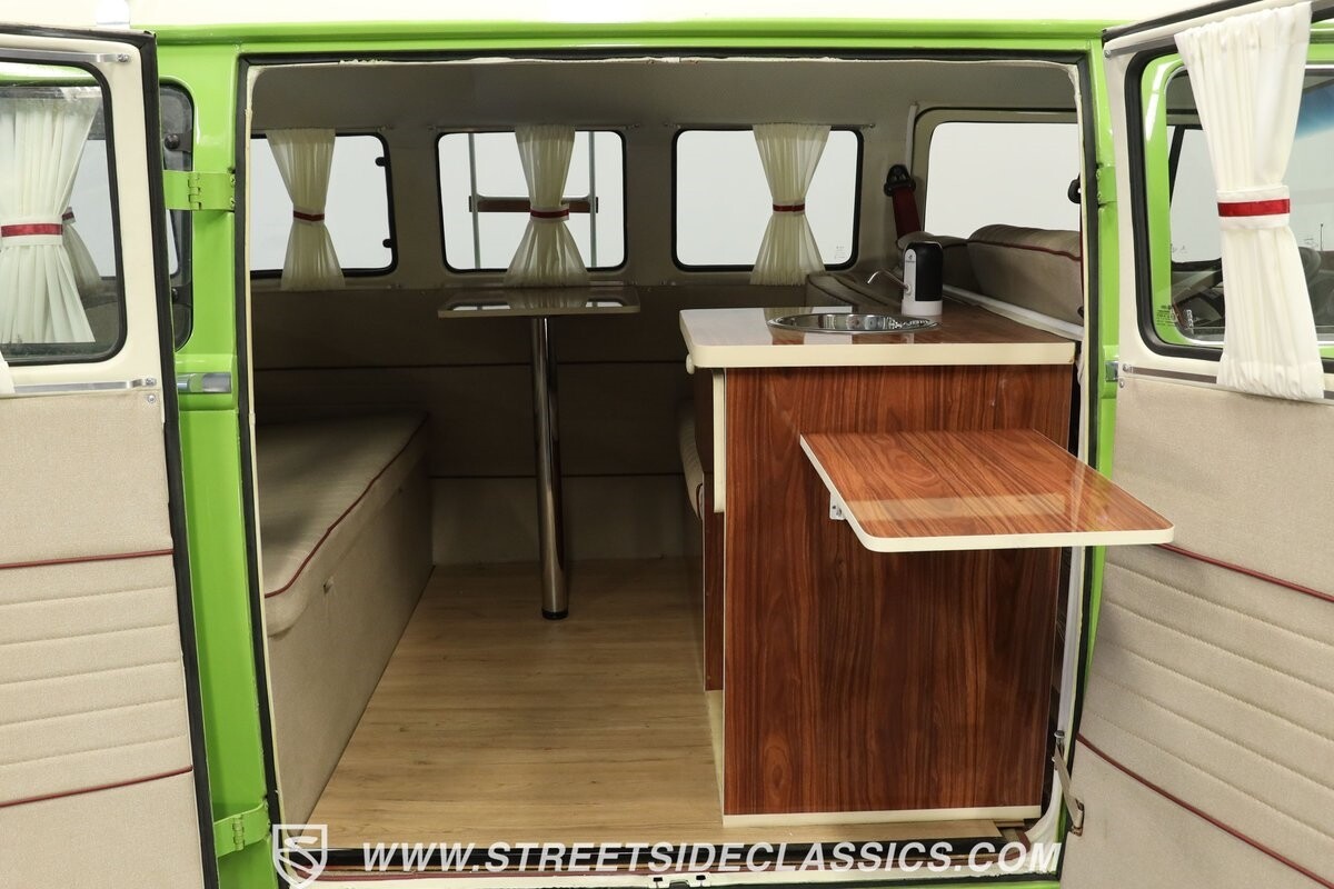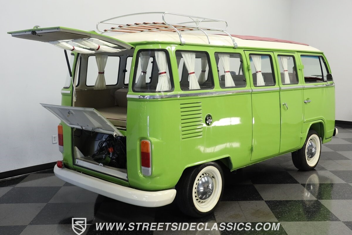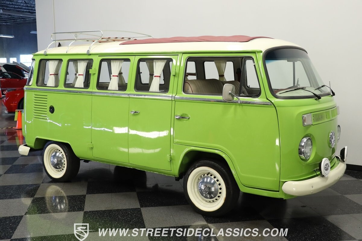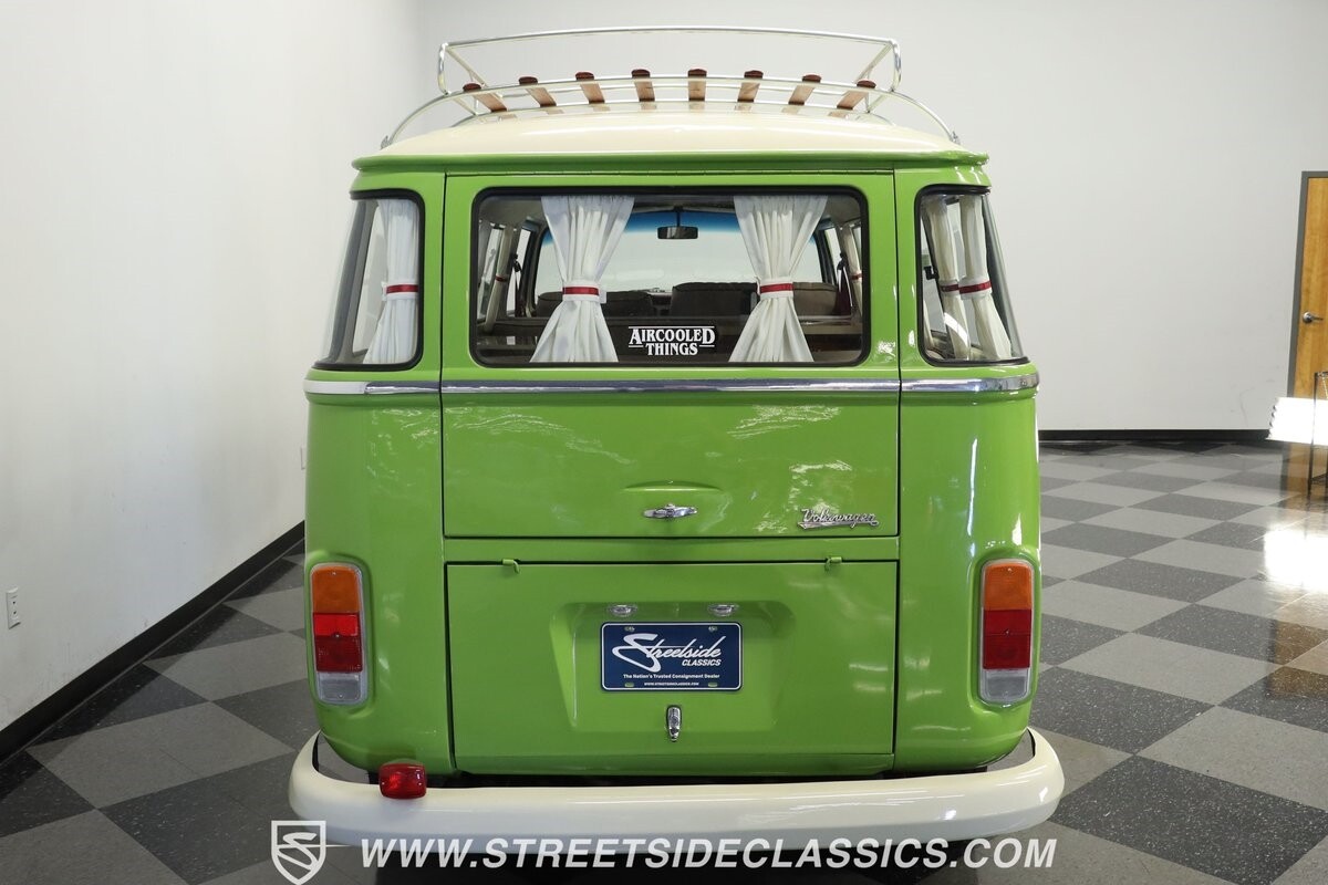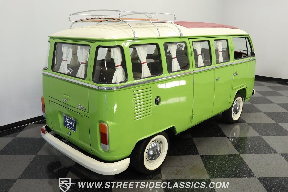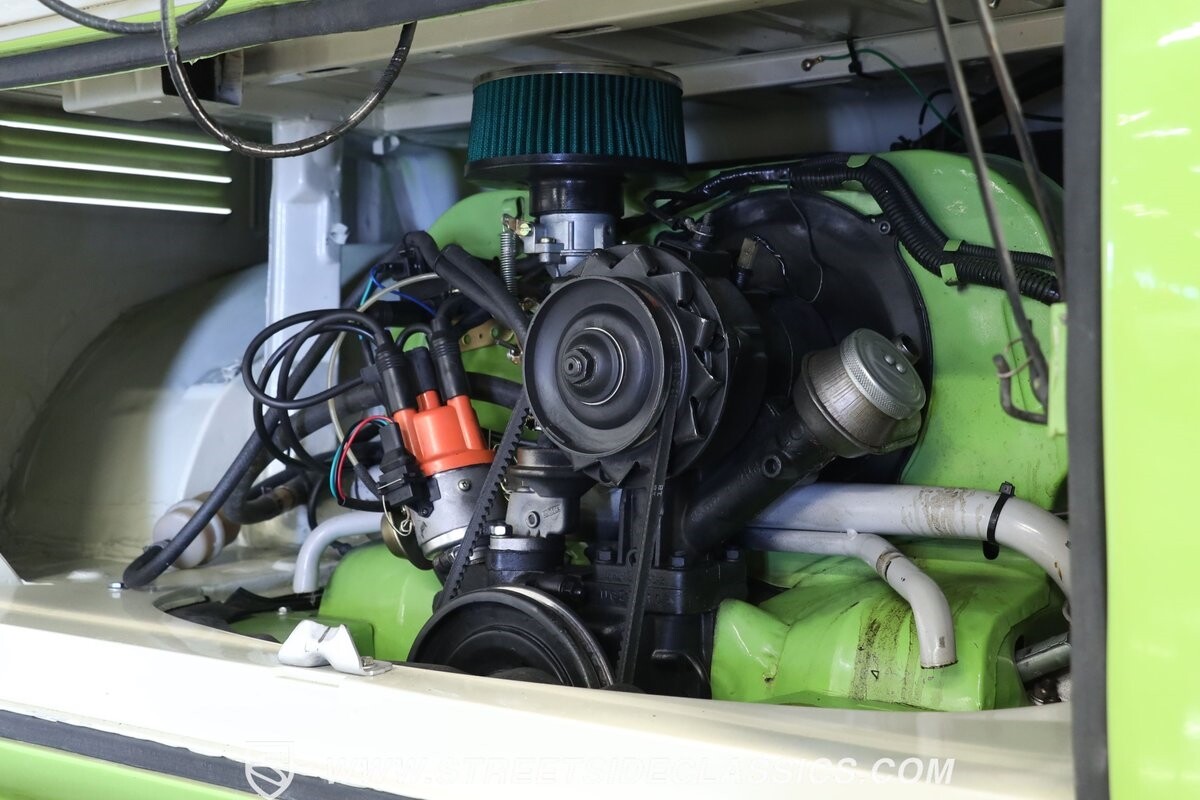 We like a South American VW Bus like this. They were able to incorporate some of the best early Type 2 features into the more efficient Breadvan design. It's basically like they used an icon to create an icon. That's why this is unmistakably a Type 2, and yet, it's also something distinct even in a crowd of VWs. And this one is done right with a high-gloss green paint that shows off the quality of the body panels. Bright chrome trim, fresh weather-stripping, and clean wheel wells all signal that this is a quality restoration. We especially like the white paint. It looks good on the roof, wheels, and bumpers. Plus, it coordinates with fun details like the white Hella light covers in front and the white curtains in all of the side windows. There are even thoughtful little things, like how the red in the curtain holders coordinates with the red canvas sunroof. And not only will you love the look of the vintage roof rack, but the sale also comes with a coordinating aluminum and wood side ladder. So if you do take this one to a campground, you may need to park a little further away for privacy because this detailed Bus attracts plenty of attention.