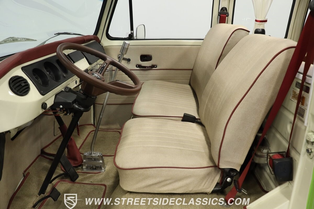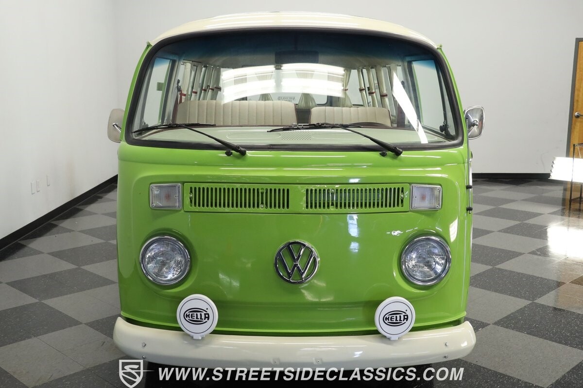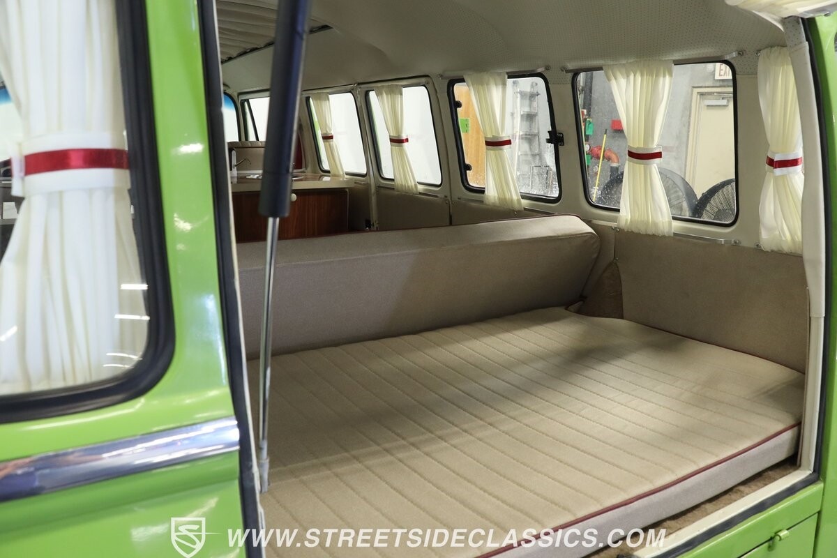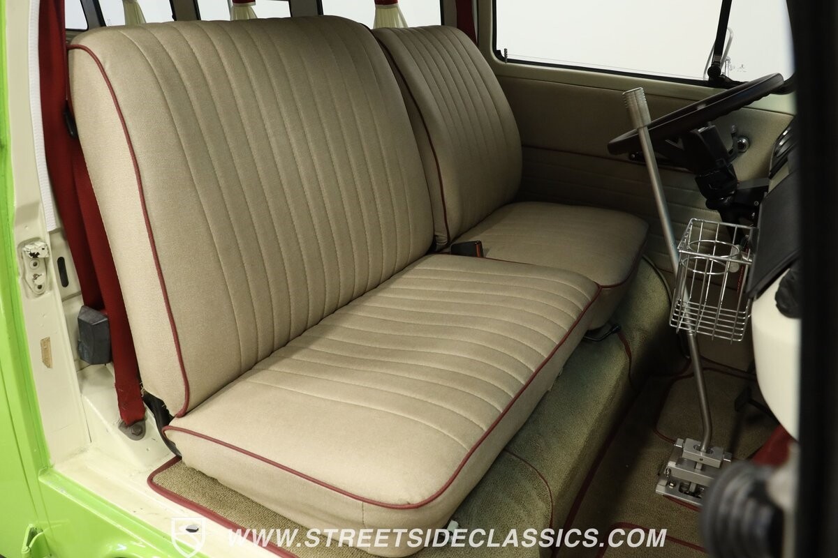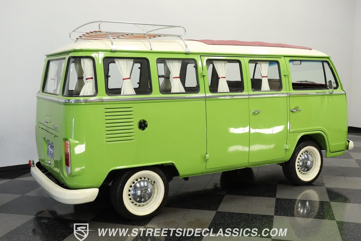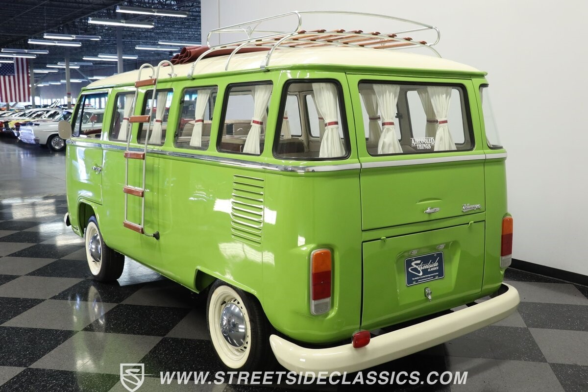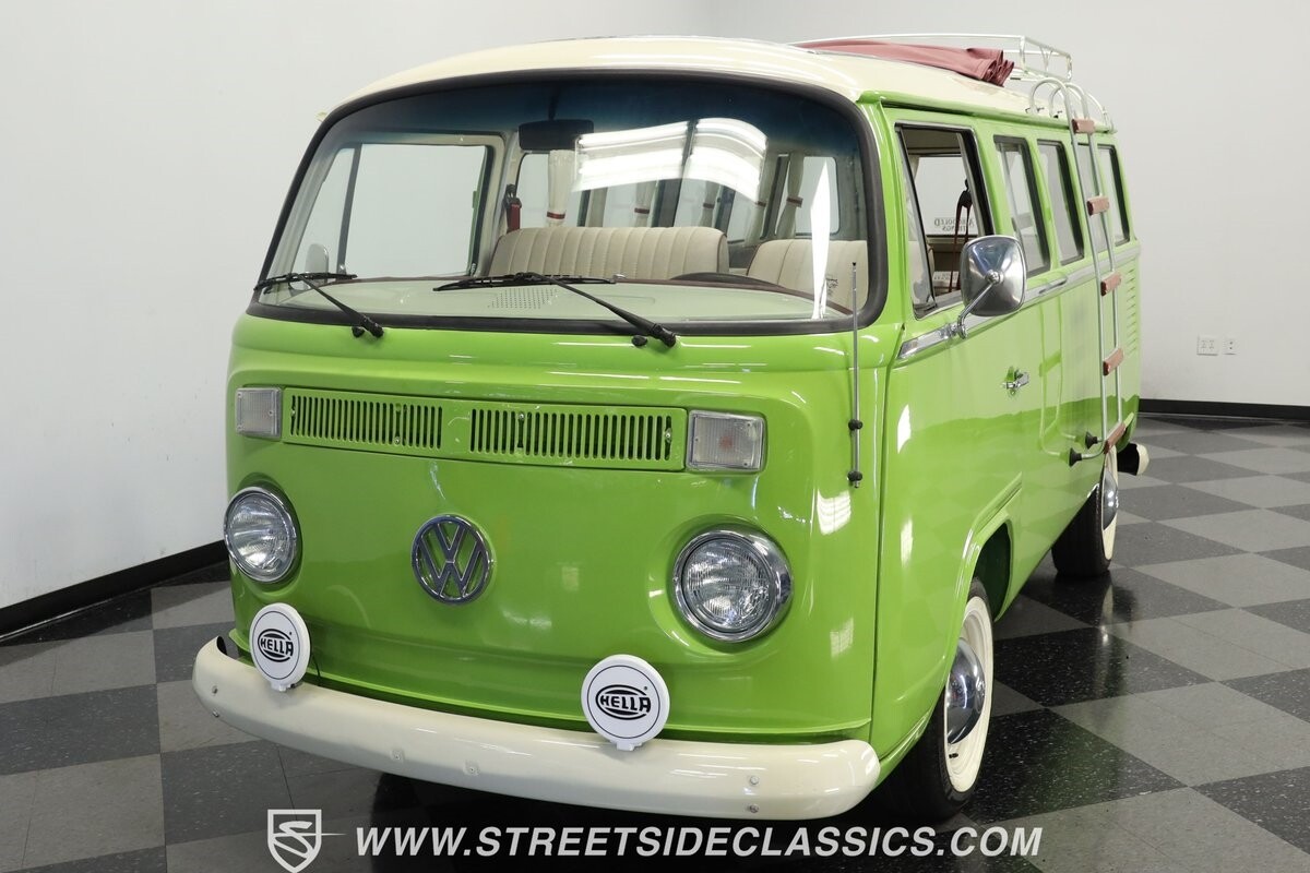 We like a South American VW Bus like this. They were able to incorporate some of the best early Type 2 features into the more efficient Breadvan design. It's basically like they used an icon to create an icon. That's why this is unmistakably a Type 2, and yet, it's also something distinct even in a crowd of VWs. And this one is done right with a high-gloss green paint that shows off the quality of the body panels. Bright chrome trim, fresh weather-stripping, and clean wheel wells all signal that this is a quality restoration. We especially like the white paint. It looks good on the roof, wheels, and bumpers. Plus, it coordinates with fun details like the white Hella light covers in front and the white curtains in all of the side windows. There are even thoughtful little things, like how the red in the curtain holders coordinates with the red canvas sunroof. And not only will you love the look of the vintage roof rack, but the sale also comes with a coordinating aluminum and wood side ladder. So if you do take this one to a campground, you may need to park a little further away for privacy because this detailed Bus attracts plenty of attention.