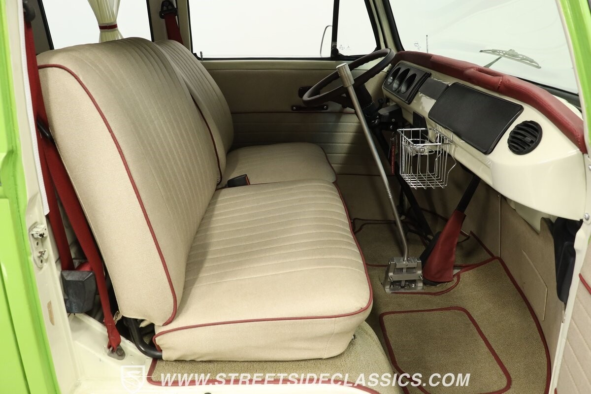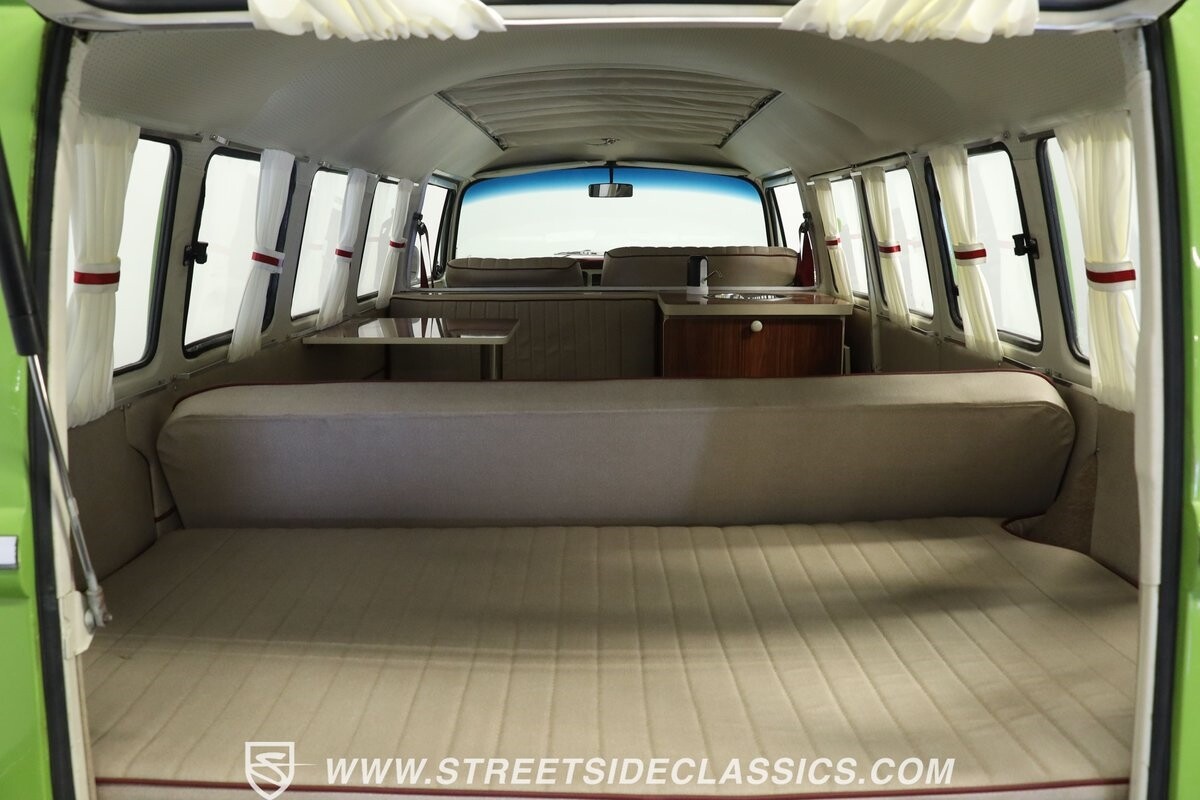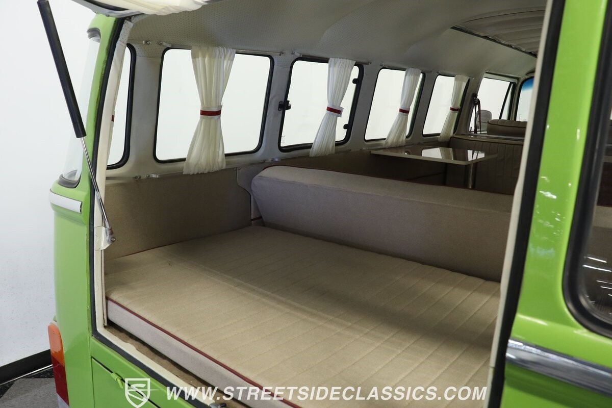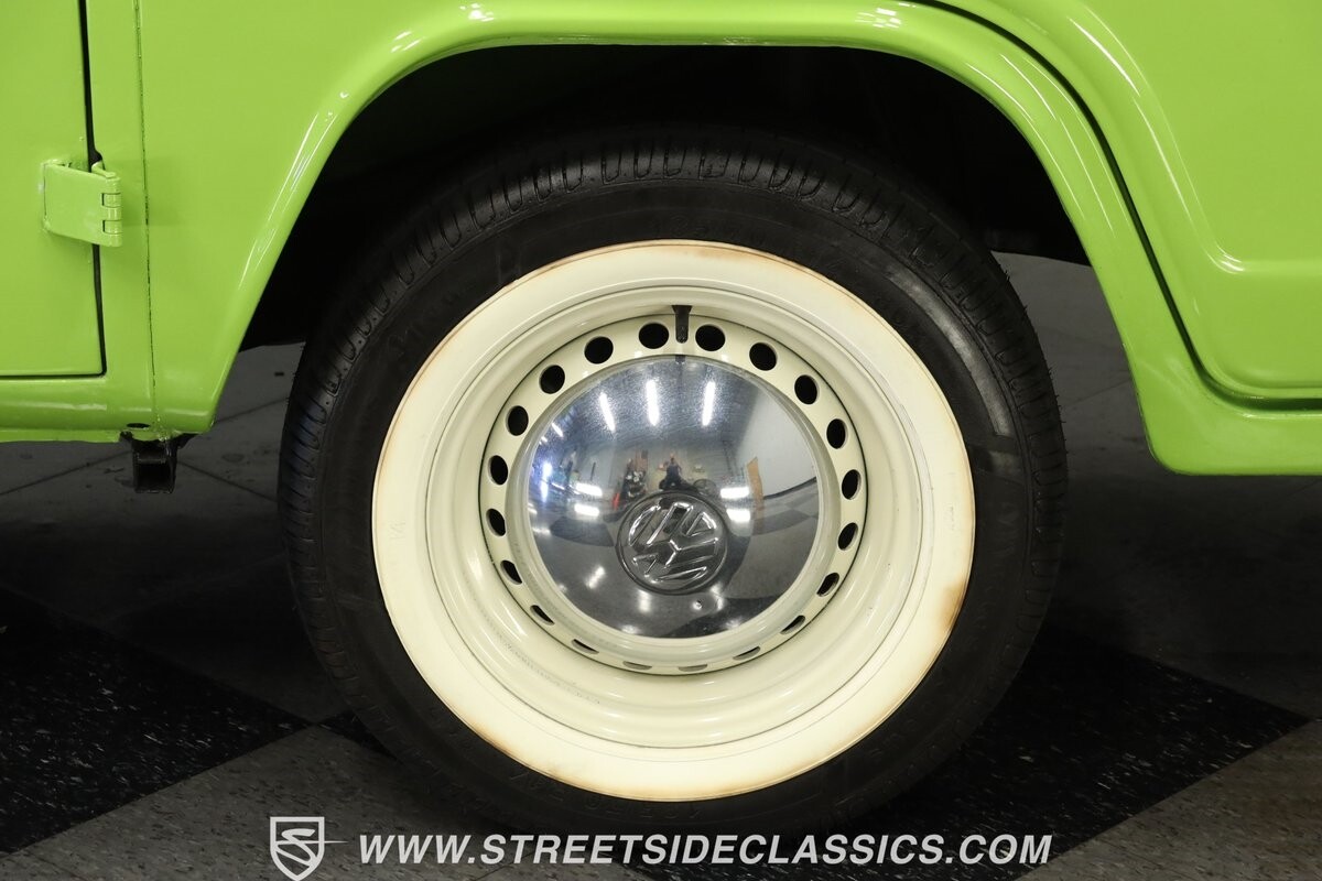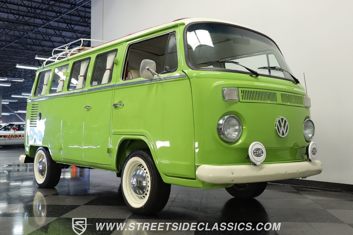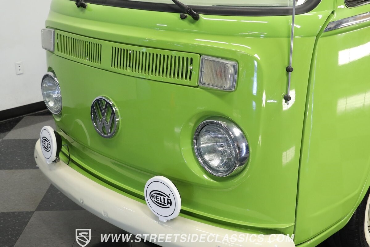We like a South American VW Bus like this. They were able to incorporate some of the best early Type 2 features into the more efficient Breadvan design. It's basically like they used an icon to create an icon. That's why this is unmistakably a Type 2, and yet, it's also something distinct even in a crowd of VWs. And this one is done right with a high-gloss green paint that shows off the quality of the body panels. Bright chrome trim, fresh weather-stripping, and clean wheel wells all signal that this is a quality restoration. We especially like the white paint. It looks good on the roof, wheels, and bumpers. Plus, it coordinates with fun details like the white Hella light covers in front and the white curtains in all of the side windows. There are even thoughtful little things, like how the red in the curtain holders coordinates with the red canvas sunroof. And not only will you love the look of the vintage roof rack, but the sale also comes with a coordinating aluminum and wood side ladder. So if you do take this one to a campground, you may need to park a little further away for privacy because this detailed Bus attracts plenty of attention.