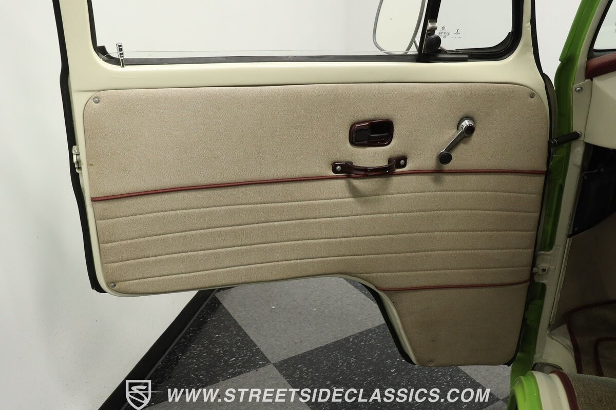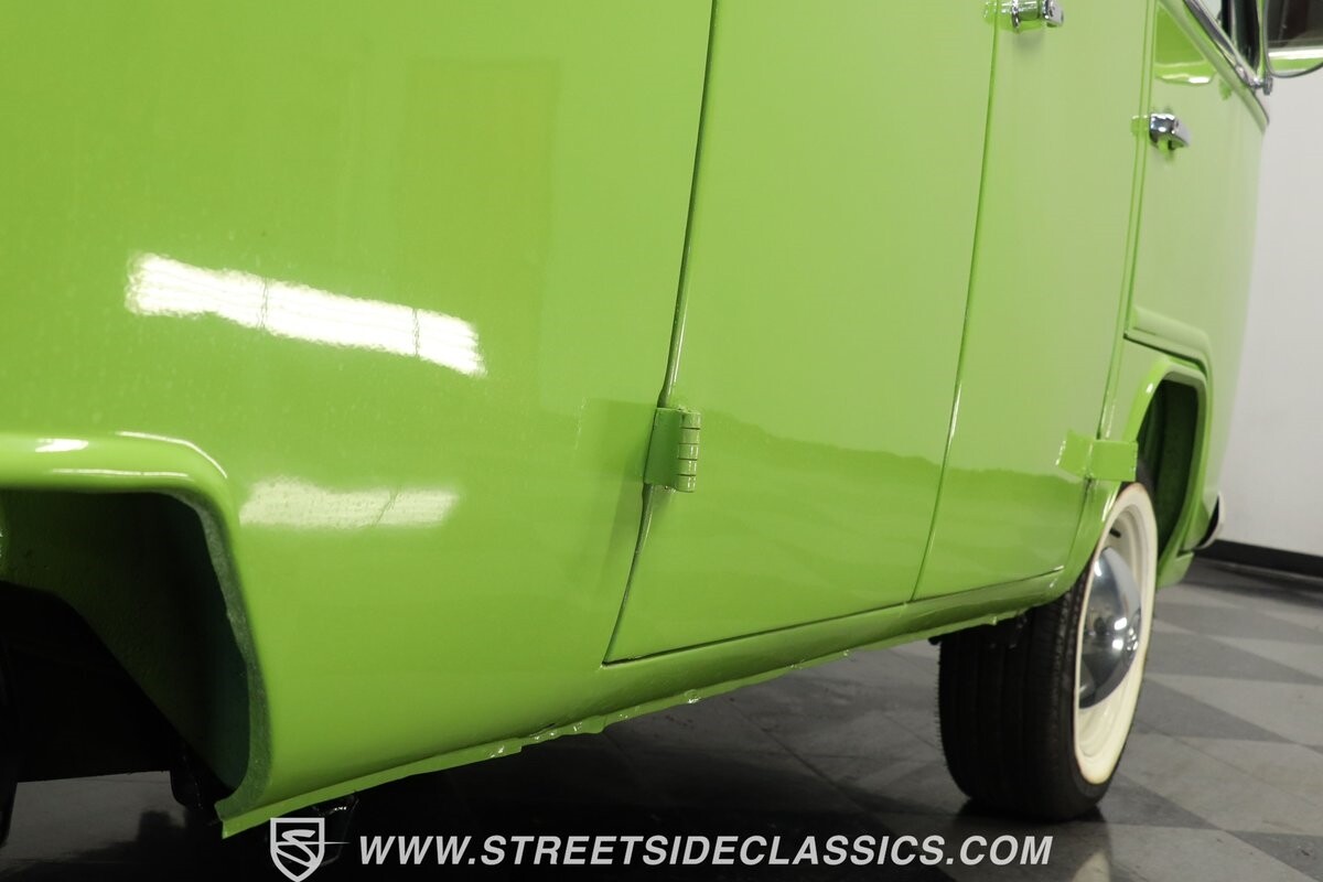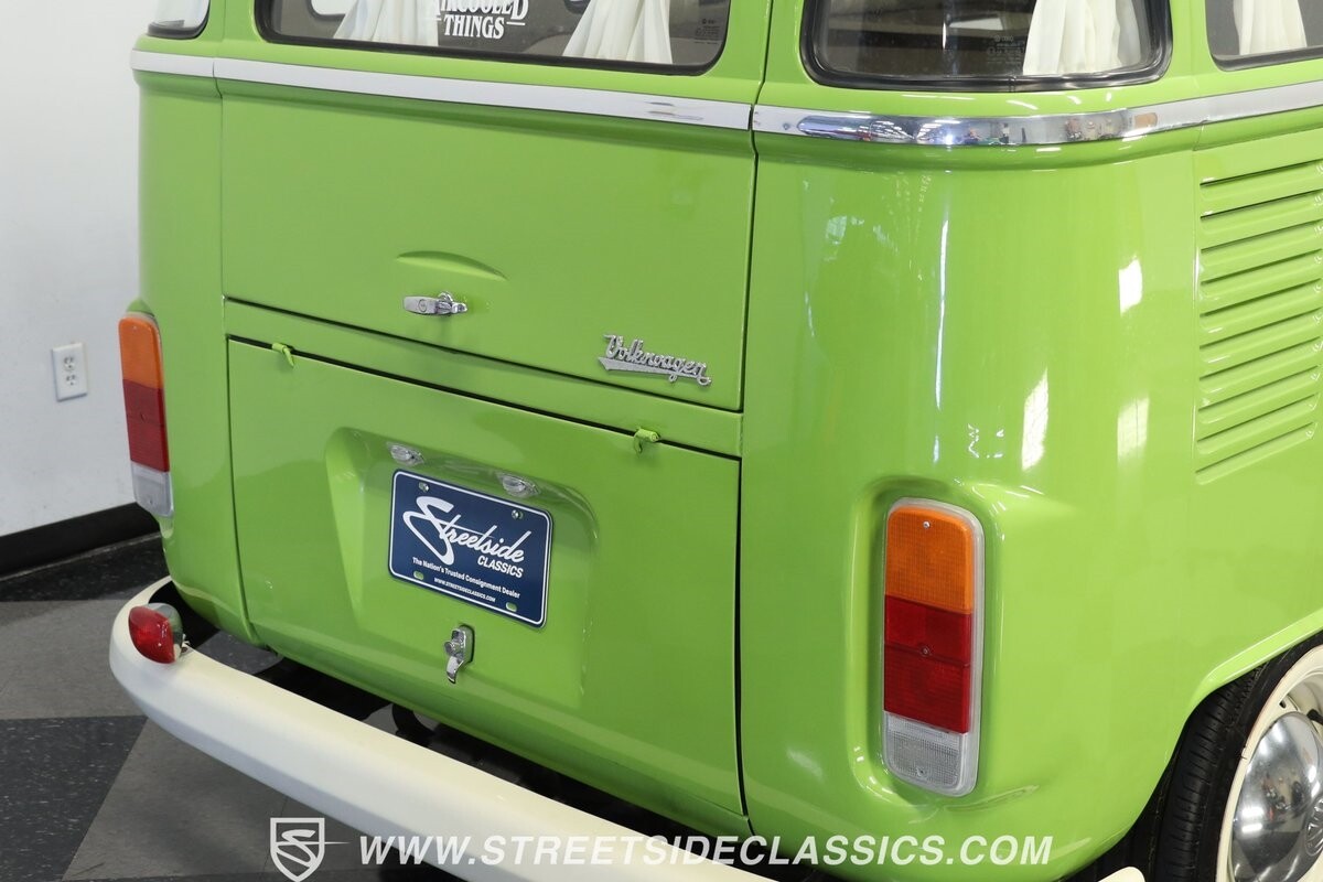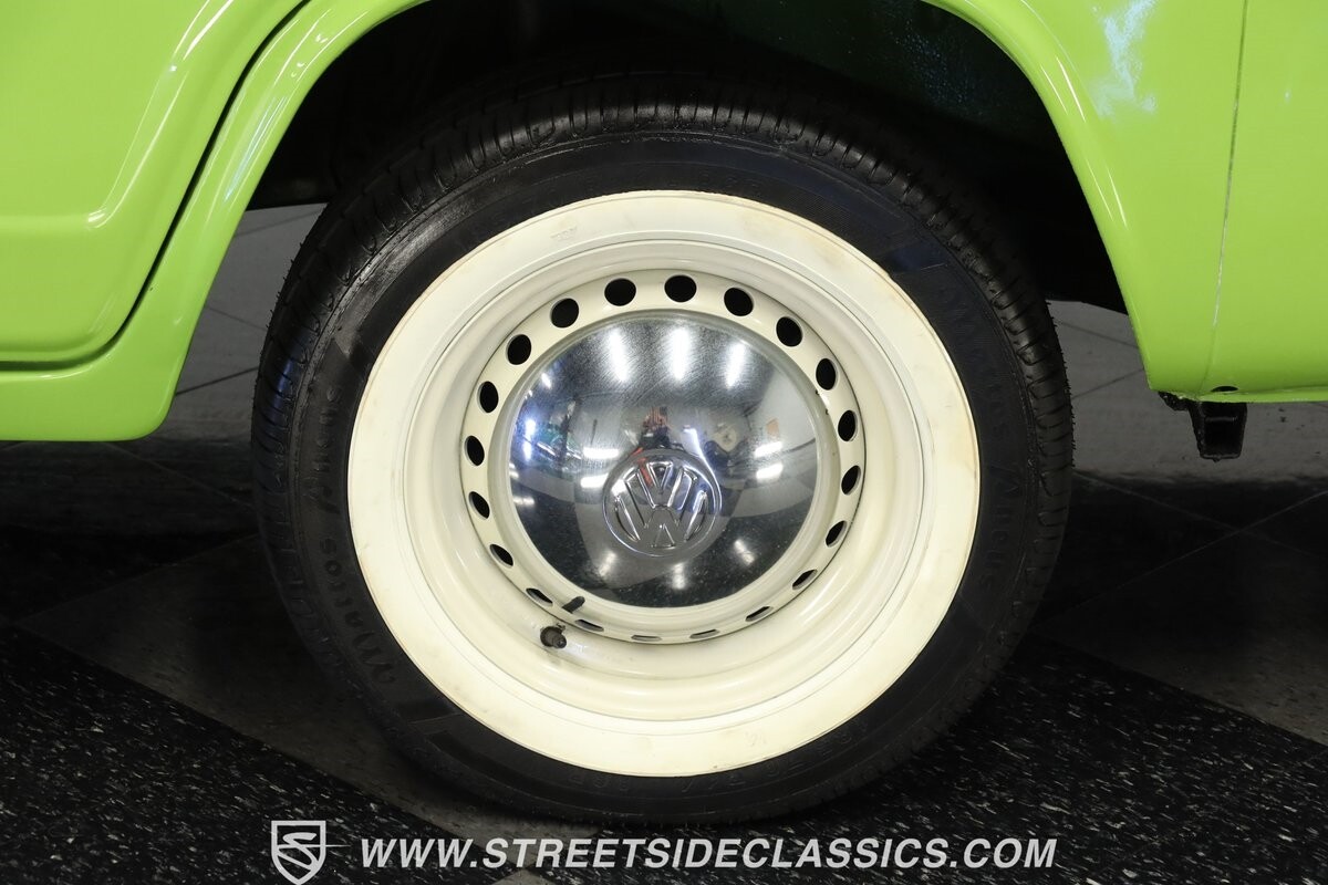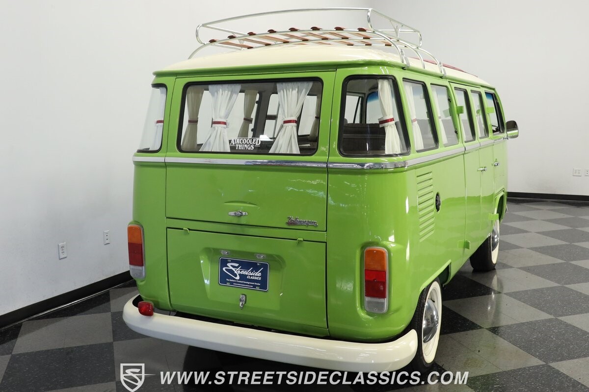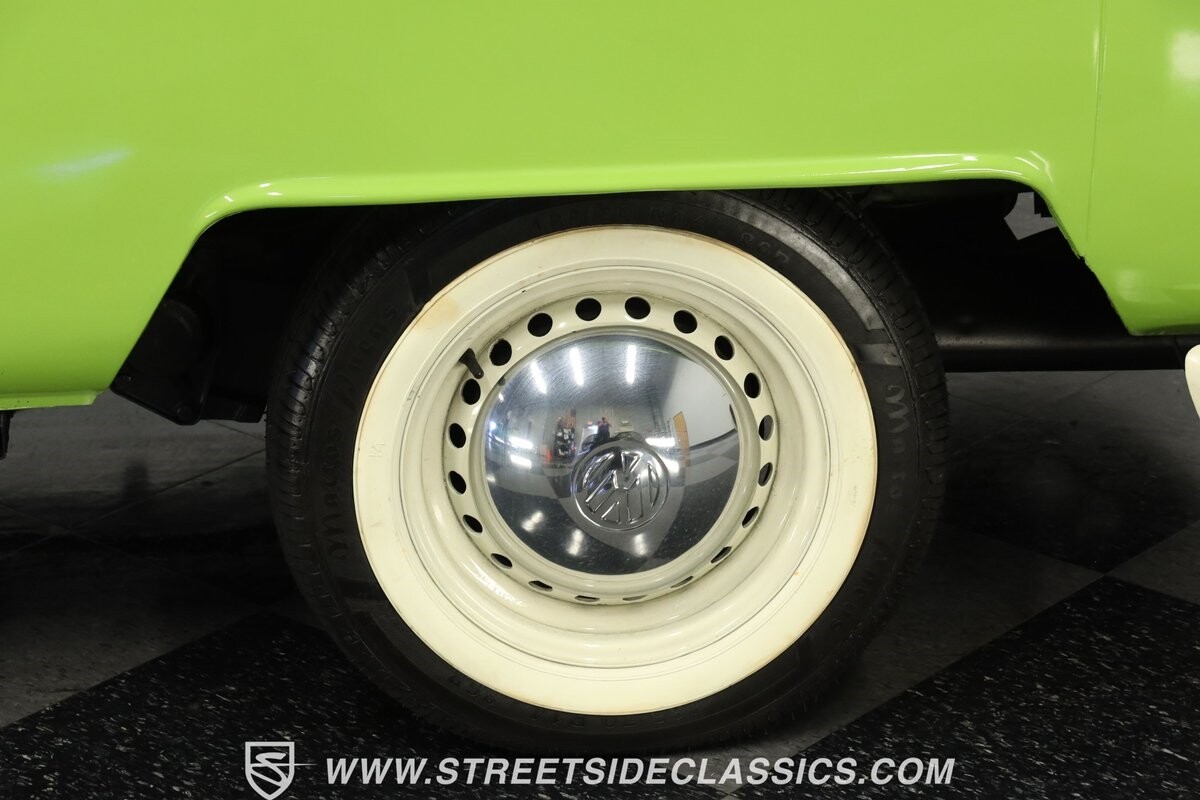We like a South American VW Bus like this. They were able to incorporate some of the best early Type 2 features into the more efficient Breadvan design. It's basically like they used an icon to create an icon. That's why this is unmistakably a Type 2, and yet, it's also something distinct even in a crowd of VWs. And this one is done right with a high-gloss green paint that shows off the quality of the body panels. Bright chrome trim, fresh weather-stripping, and clean wheel wells all signal that this is a quality restoration. We especially like the white paint. It looks good on the roof, wheels, and bumpers. Plus, it coordinates with fun details like the white Hella light covers in front and the white curtains in all of the side windows. There are even thoughtful little things, like how the red in the curtain holders coordinates with the red canvas sunroof. And not only will you love the look of the vintage roof rack, but the sale also comes with a coordinating aluminum and wood side ladder. So if you do take this one to a campground, you may need to park a little further away for privacy because this detailed Bus attracts plenty of attention.