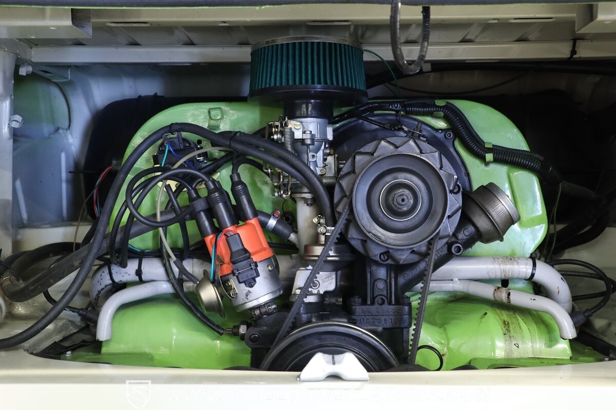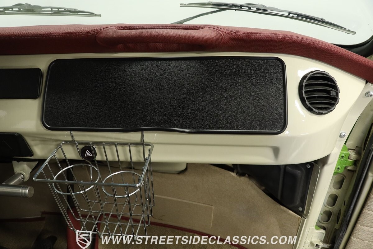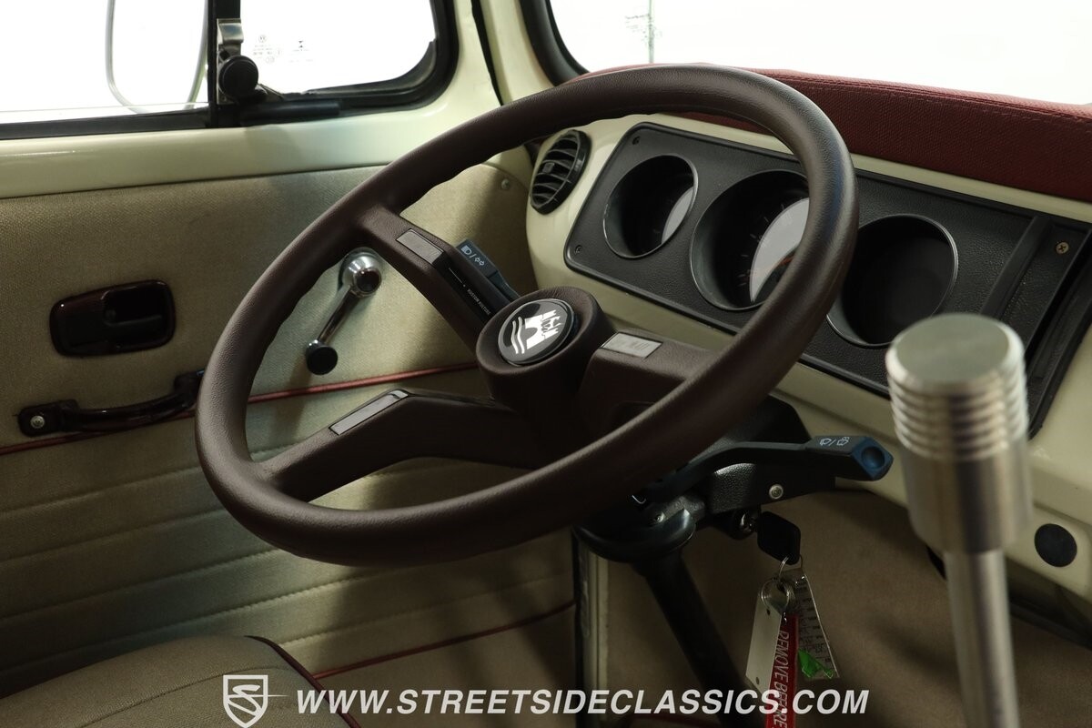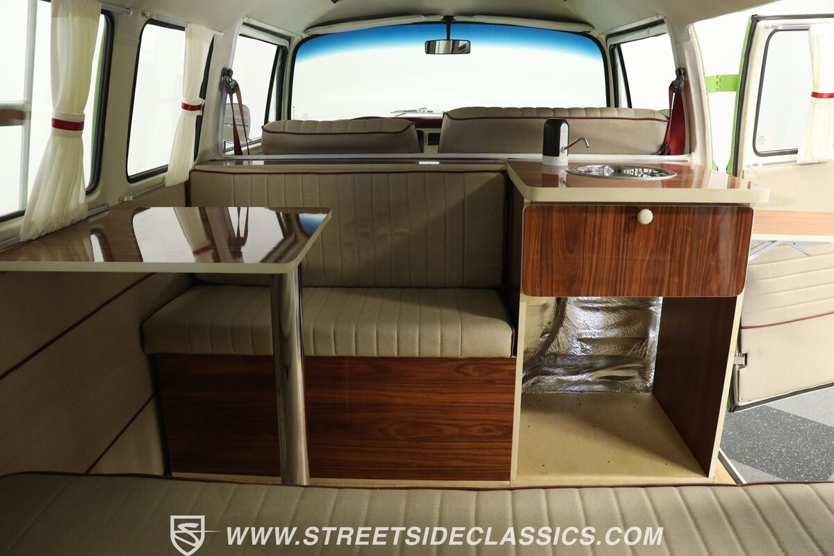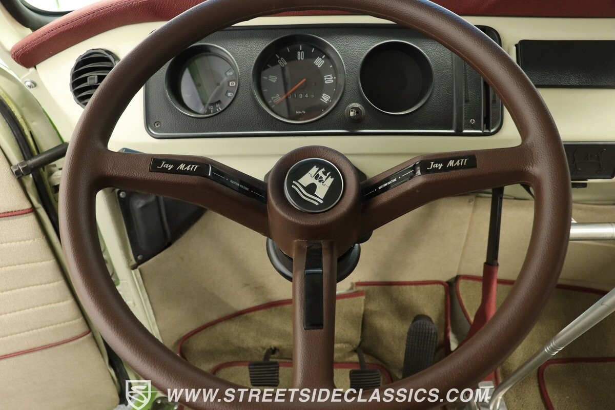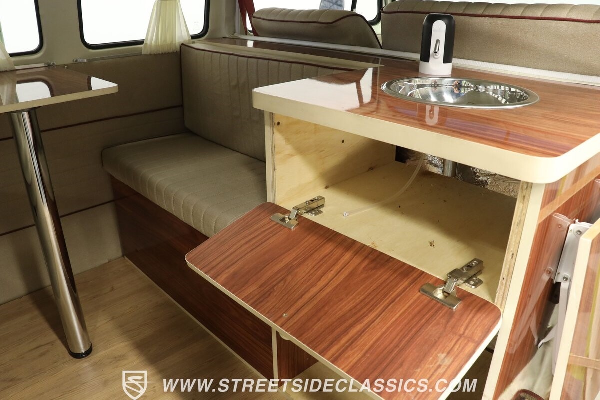 The interior has a fresh look done in a bright and clean beige. The hint of red you saw on the outside also works inside. It's on the dash pad, carpet piping, seat belts, and seat piping for a thoughtful and uniform style throughout this VW. The front offers a wide spit bench that gives the driver individual bucket-like comfort. The driver also gets a Jay Matt sports steering wheel ( a nice Brazilian piece), a shoulder seatbelt, and an upgraded four-speed shifter with a confident mechanical action. So it feels like a road-ready journeyman, and what's behind the front seats confirms this is ready for a road trip. This is a proper camper setup where the rear is a living room and kitchen thanks to a center table (removable), wood flooring, extra storage, comfy seating, and a sink basin. And yes, the rear seat folds flat into a bed. So you can just imagine opening up the large roof and laying down to see a starry night sky.