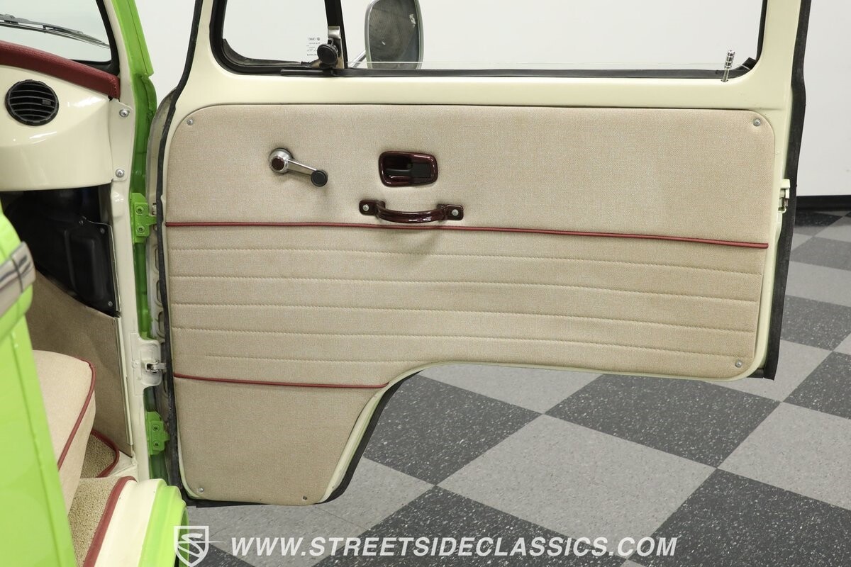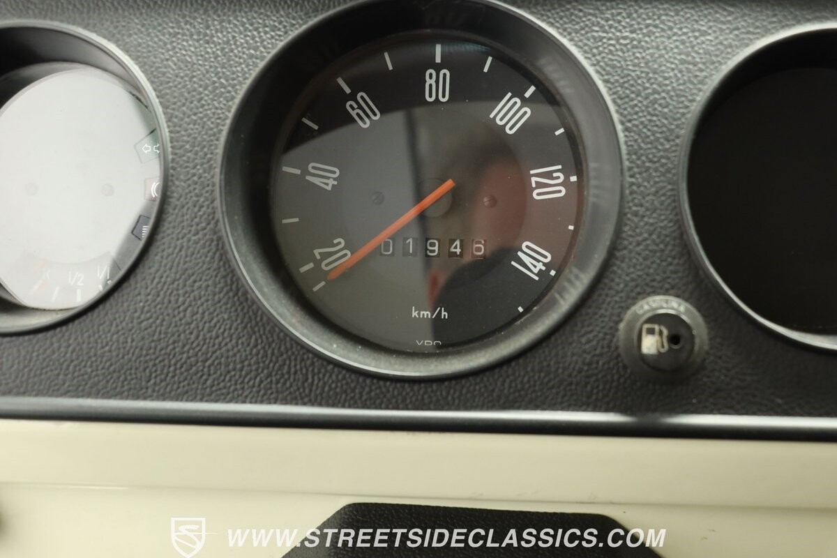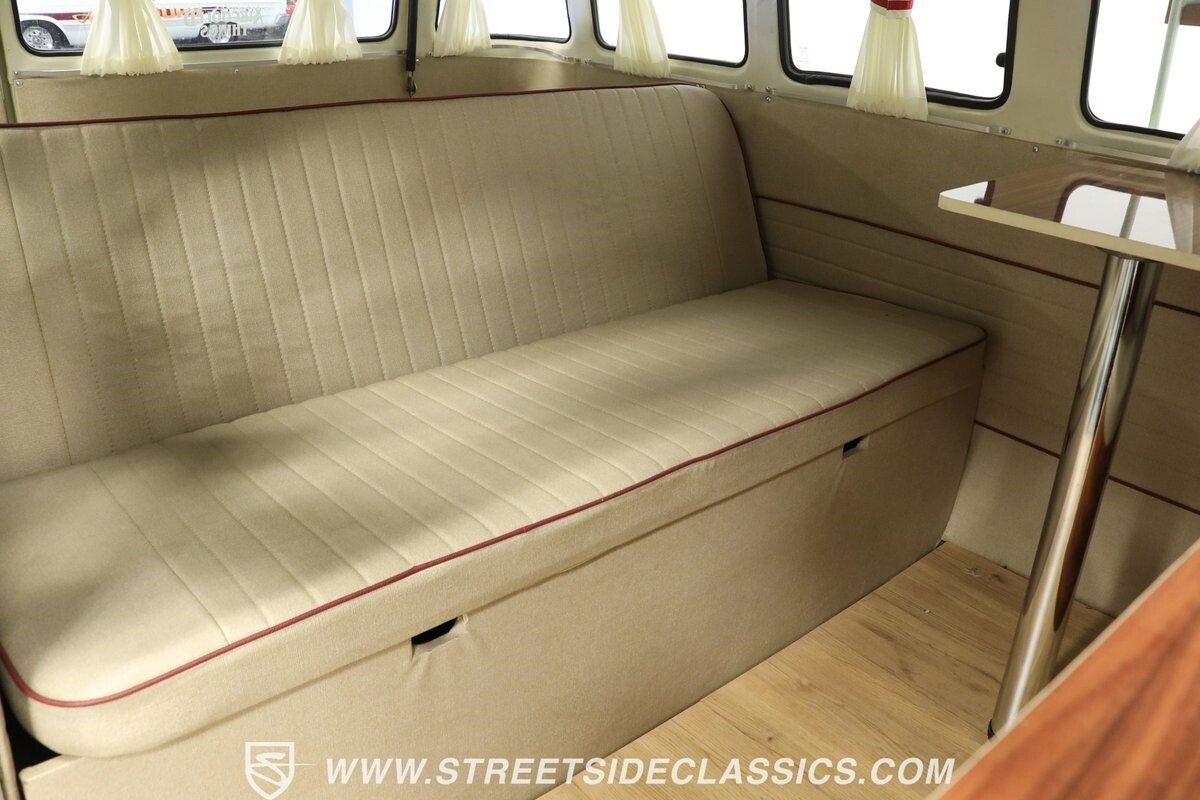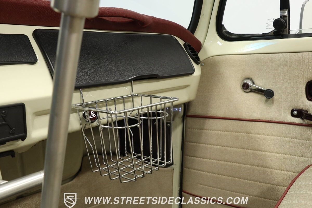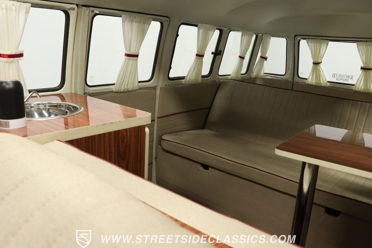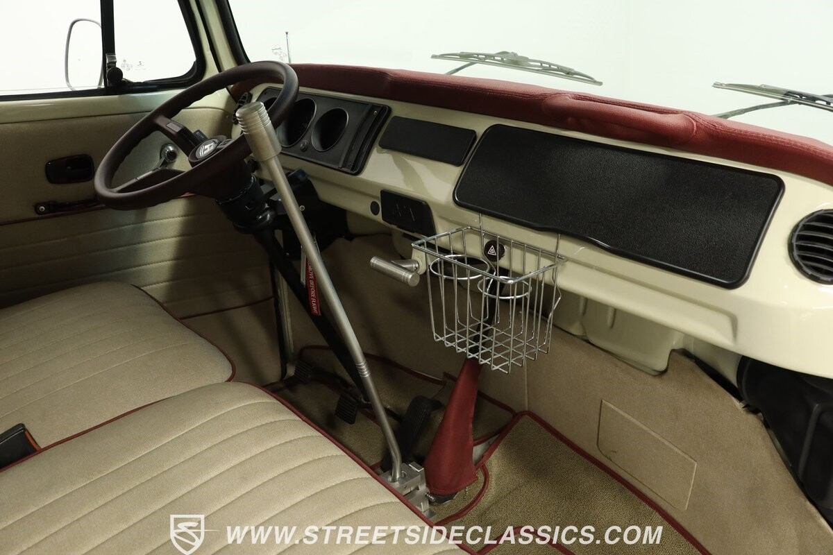 The interior has a fresh look done in a bright and clean beige. The hint of red you saw on the outside also works inside. It's on the dash pad, carpet piping, seat belts, and seat piping for a thoughtful and uniform style throughout this VW. The front offers a wide spit bench that gives the driver individual bucket-like comfort. The driver also gets a Jay Matt sports steering wheel ( a nice Brazilian piece), a shoulder seatbelt, and an upgraded four-speed shifter with a confident mechanical action. So it feels like a road-ready journeyman, and what's behind the front seats confirms this is ready for a road trip. This is a proper camper setup where the rear is a living room and kitchen thanks to a center table (removable), wood flooring, extra storage, comfy seating, and a sink basin. And yes, the rear seat folds flat into a bed. So you can just imagine opening up the large roof and laying down to see a starry night sky.