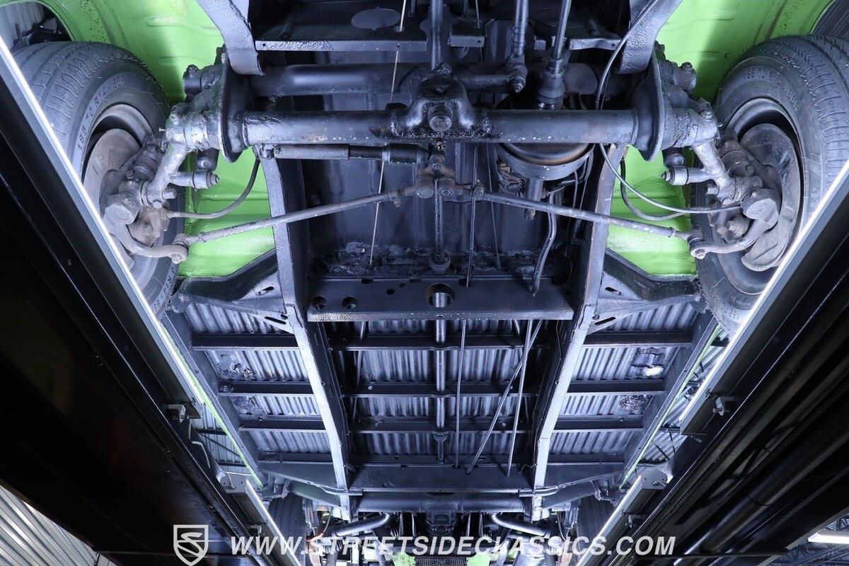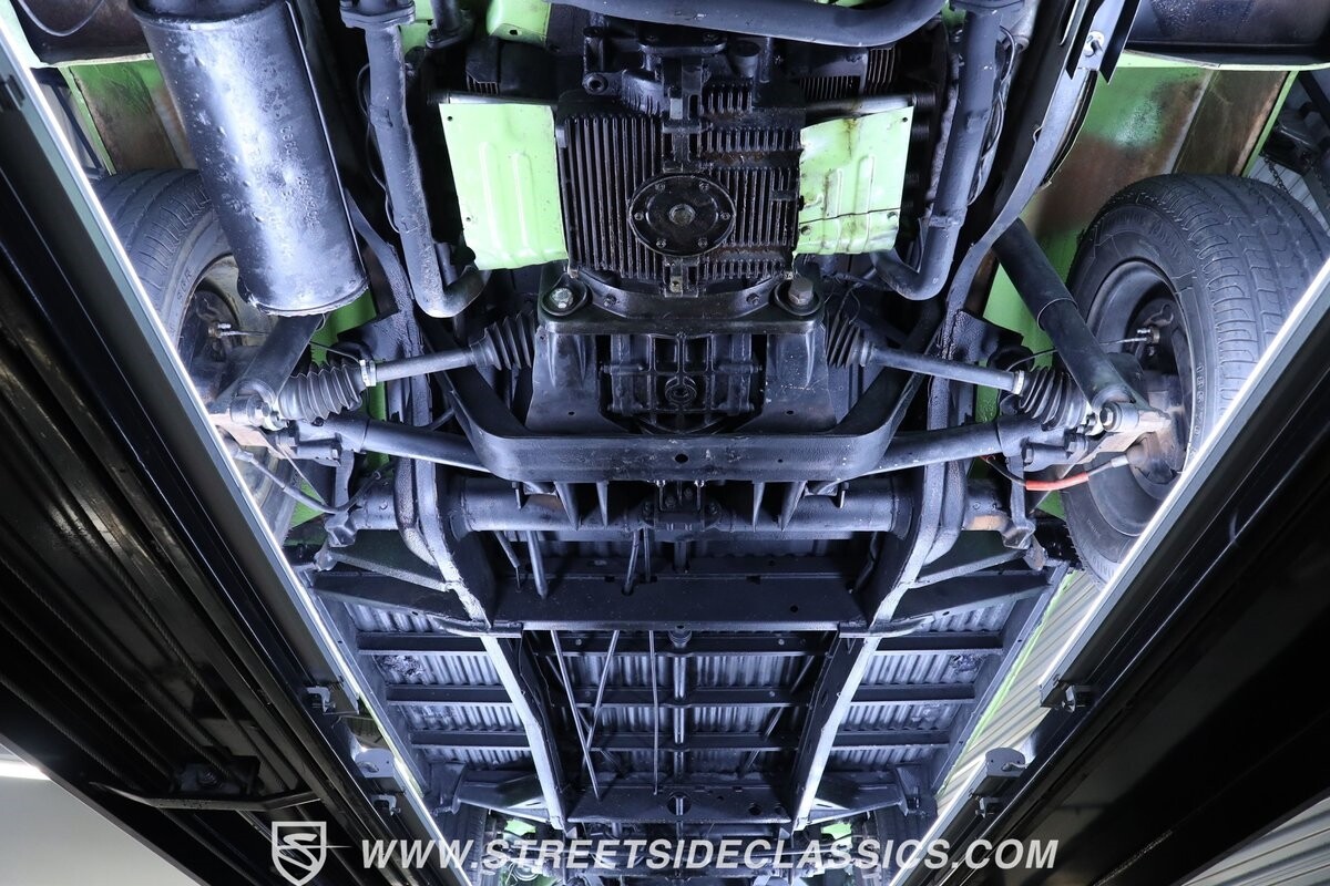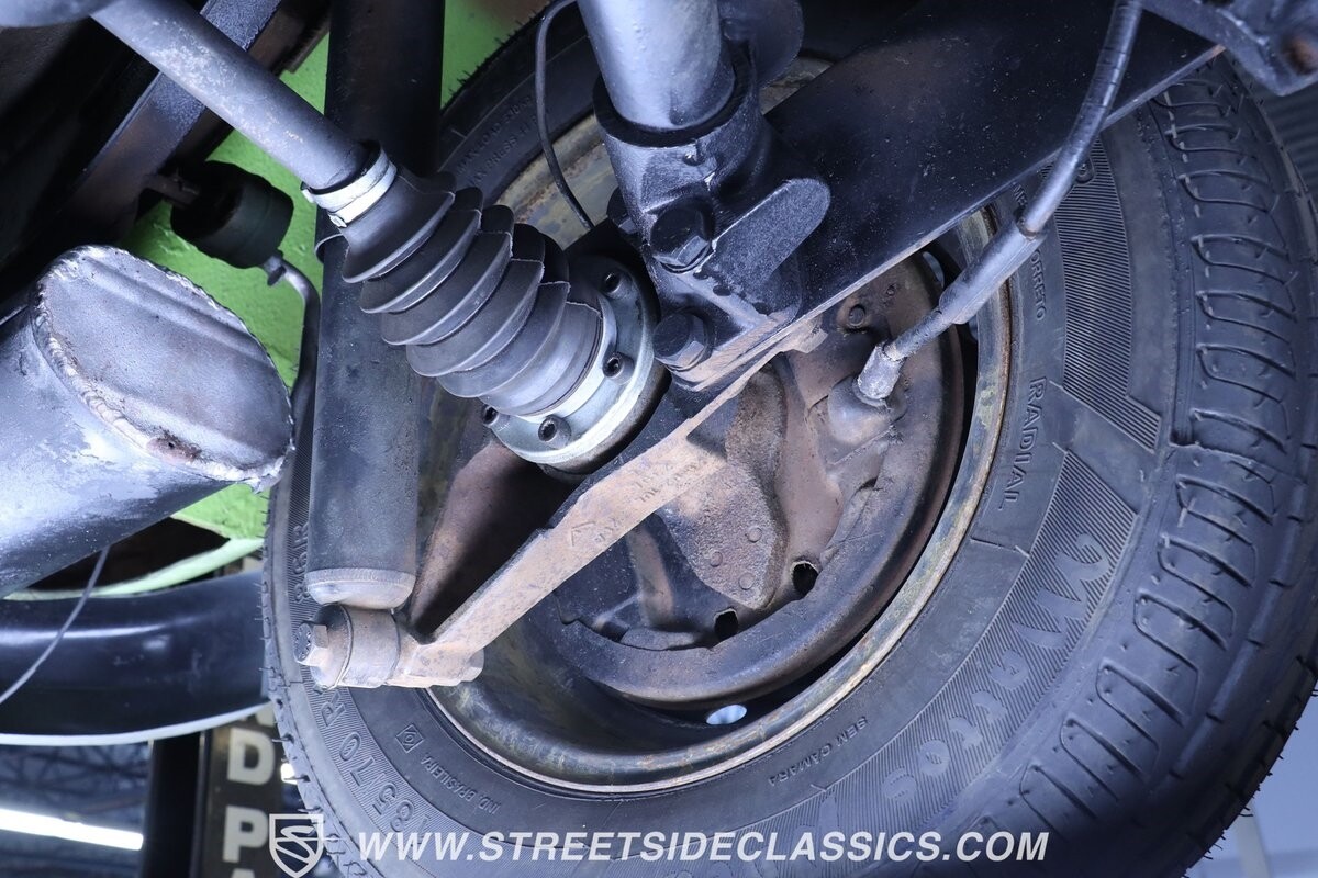 The rear hatch shows off an exceptionally clean powerhouse, which is a reminder that they paid attention to every inch of this VW during its restoration. It's a 1600cc motor that runs with the eager and hardy nature you want in a well-kept Volkswagen. As you look underneath this Type 2, you can see a fresh and clean suspension, which gives you the right confidence to hit the road. That's also why you have good cruising features like power brakes, front discs, and modern touring tires.