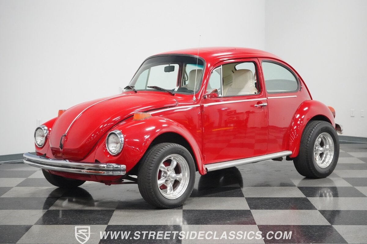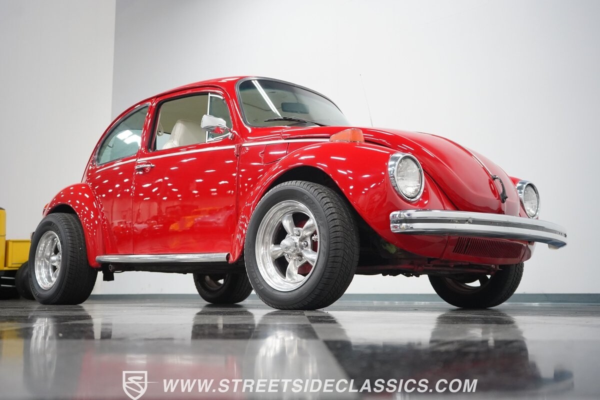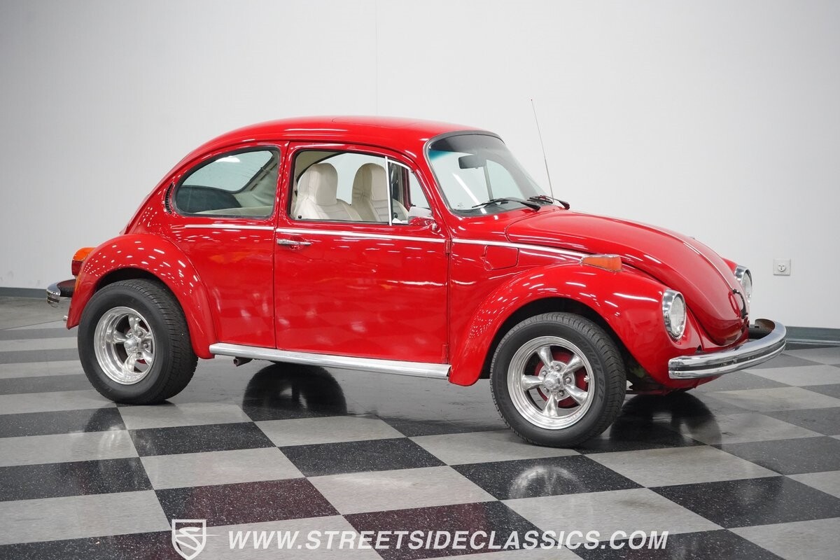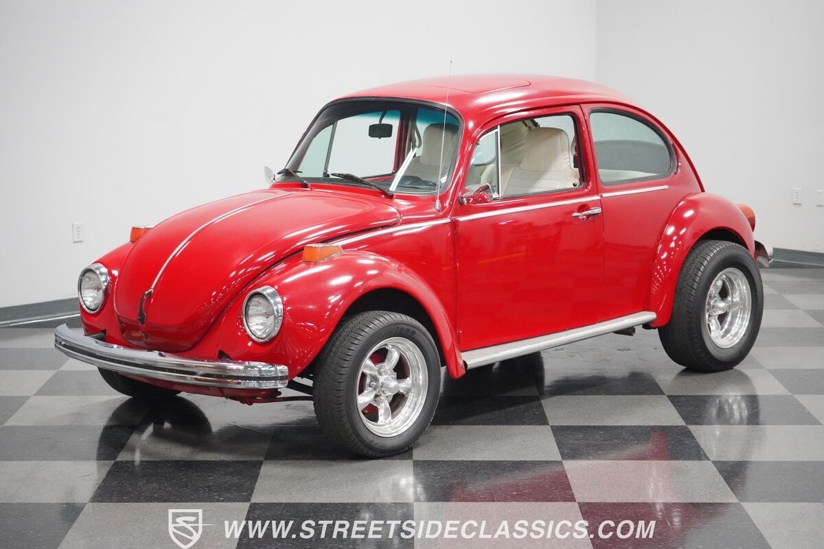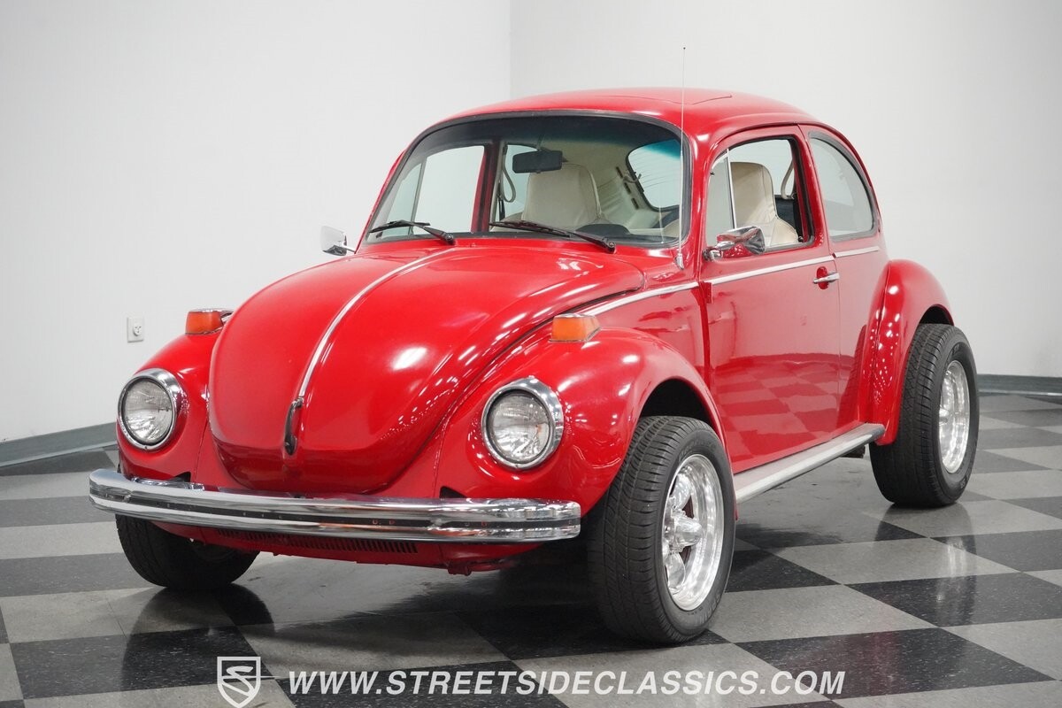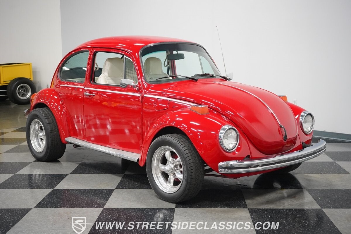 A fun stance, a fresh interior, useful features (like a sunroof and Bluetooth radio,) and a strong powerhouse make this 1975 Volkswagen Super Beetle a distinct and fun classic.