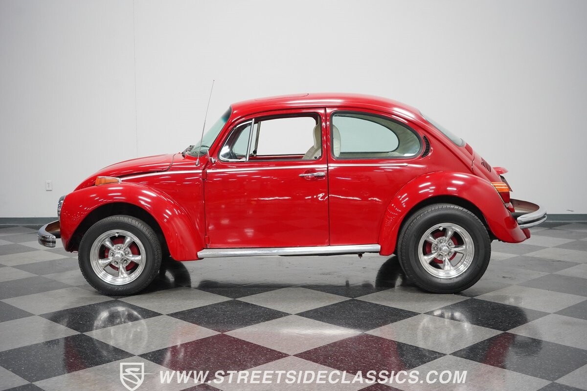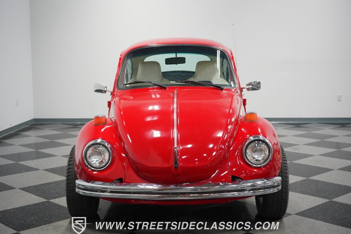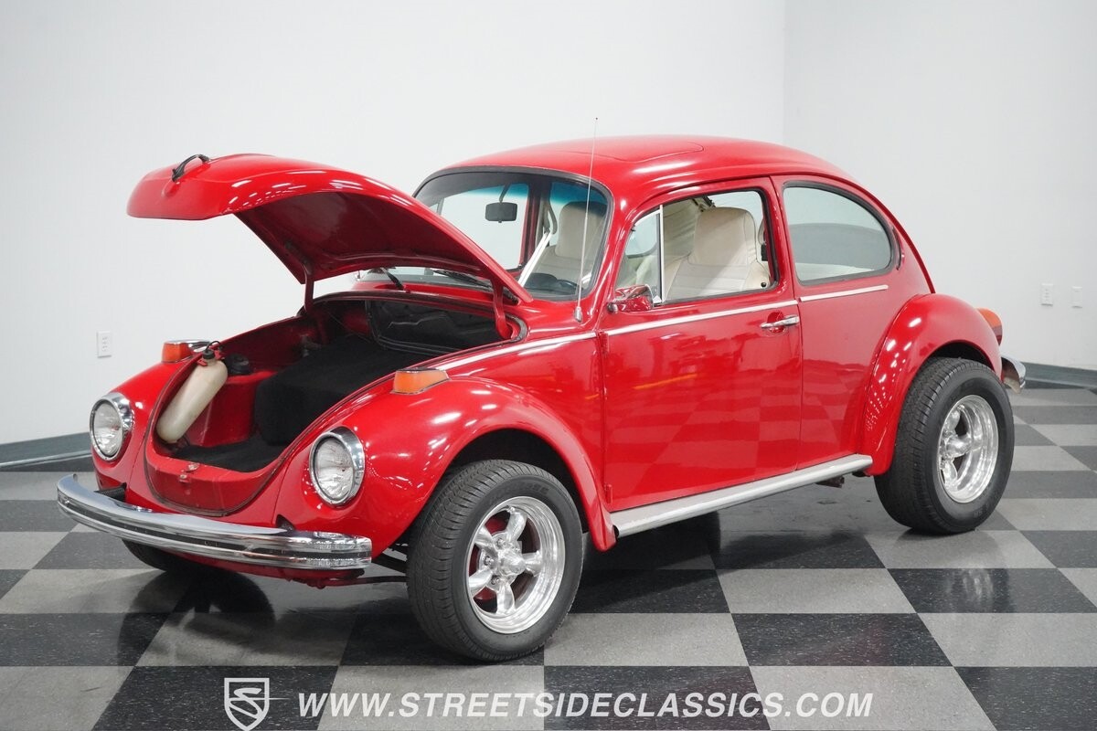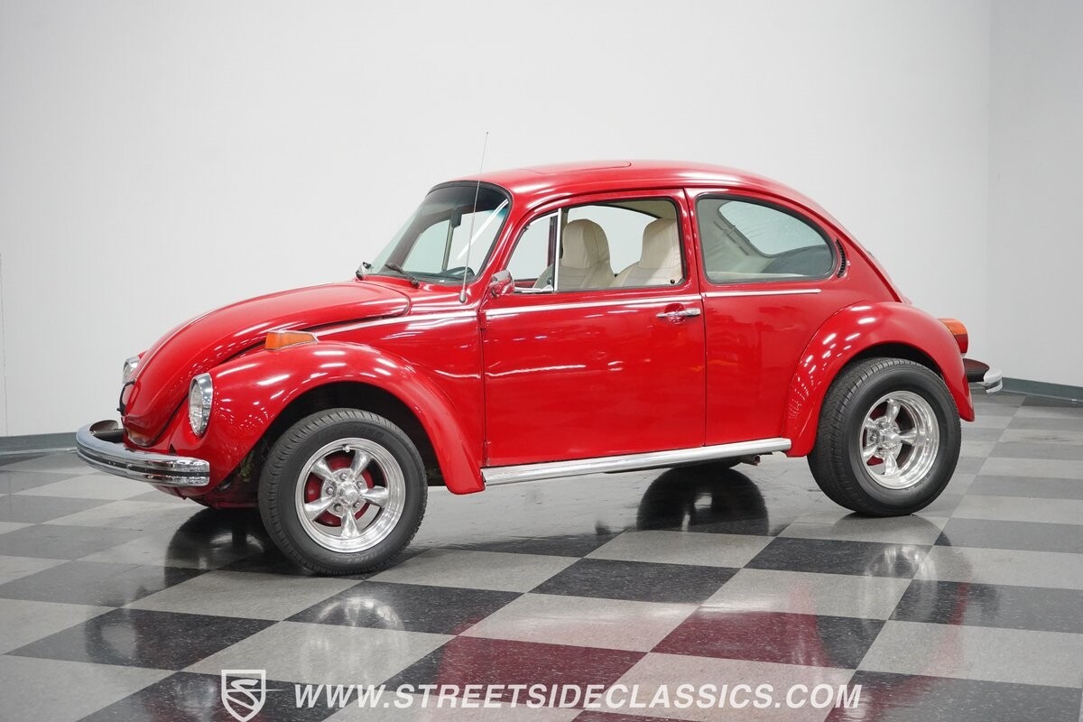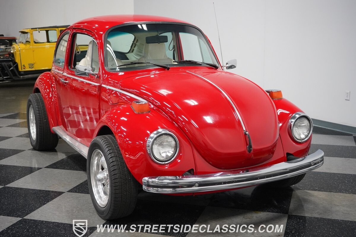 A fun stance, a fresh interior, useful features (like a sunroof and Bluetooth radio,) and a strong powerhouse make this 1975 Volkswagen Super Beetle a distinct and fun classic.
