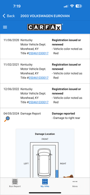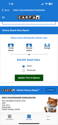 "PLEASE SCROLL TO BOTTOM OF LISTING AND CLICK "SEE FULL ITEM DESCRIPTION" TO VIEW ALL 50+ PHOTOS!!!" "I WILL HELP YOU ARRANGE SHIPPING AND WILL MATCH OR BEAT YOUR QUOTE" UP FOR SALE IS THIS VERY NICE 2003 VW EUROVAN MINIVAN WITH TABLE BED AND CURTANS, ONE OWNER CLEAN CARFAX WITH SERVICE RECORDS AND ONLY 64K MILES, RUST FREE, NON SMOKER AND PRICED TO SELL!!! THIS VAN IS OVERALL IN GREAT CONDITION INSIDE AND OUT. THE EXTERIOR SHOWS NO MAJOR DENTS, DINGS OR SCRATCHES. THE INTERIOR ALSO SHOWS NO SIGNS OF ABUSE (SEE ALL PICTURES FOR MORE DETAILS.) THE ENGINE RUNS STRONG AND THE TRANSMISSION IS SMOOTH. FEEL FREE TO CALL ME ANY TIME IF YOU LIKE TO MAKE A DEAL TODAY! THANK YOU FOR YOUR INTEREST267-828-0460 Arsen Please keep in mind you are bidding on a pre-owned vehicle. Everyday driving can cause minor chips, dings or scratches on a vehicle. Unless otherwise noted in our photos or description these items are minimal, but may exist in some cases. Our photos are designed to be a visual description of this vehicle, please look at them carefully and use them to make a confident decision to bid on our vehicle. Get a great vehicle at a great price!!! Bid Now! If you have any questions about this or any of my other auctions please feel free to contact me via e-mail at or you can call me at 267-828-0460 ask for Arsen. Thank you for your interests and we look forward to hearing from you...