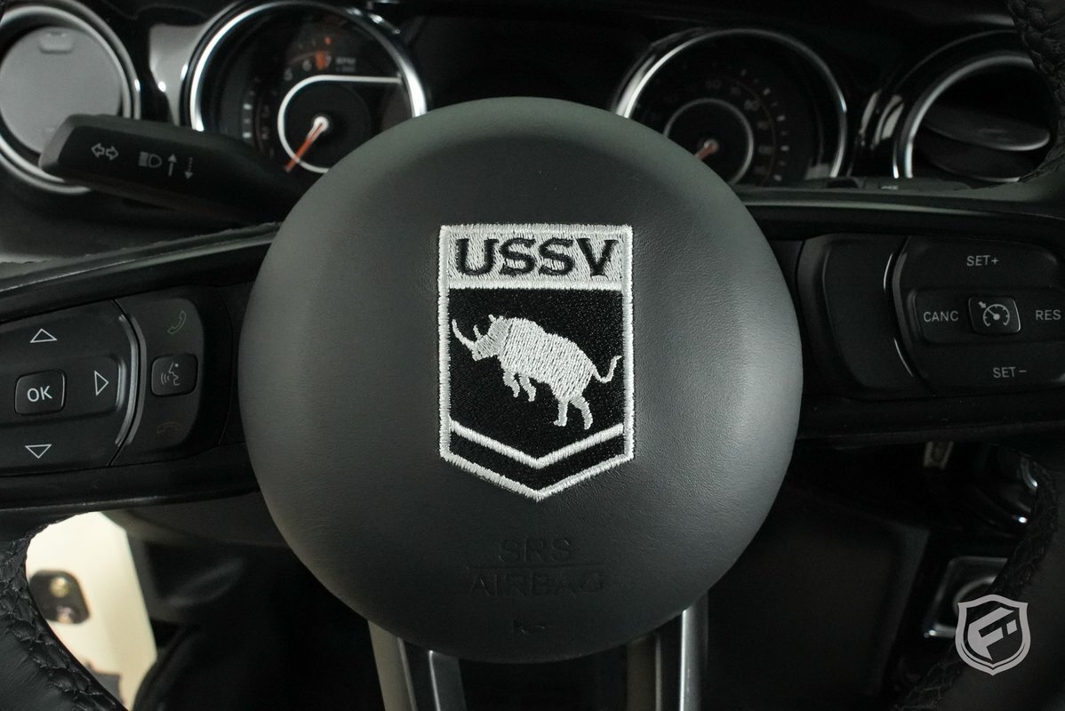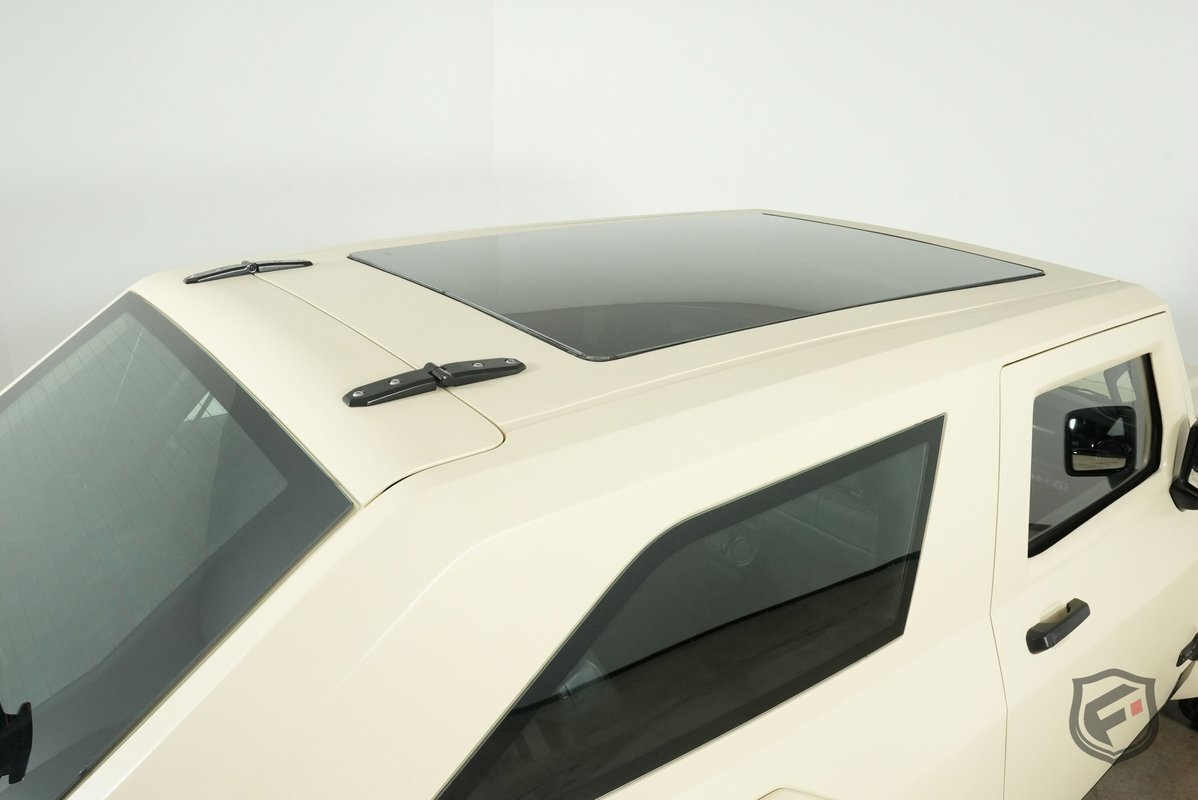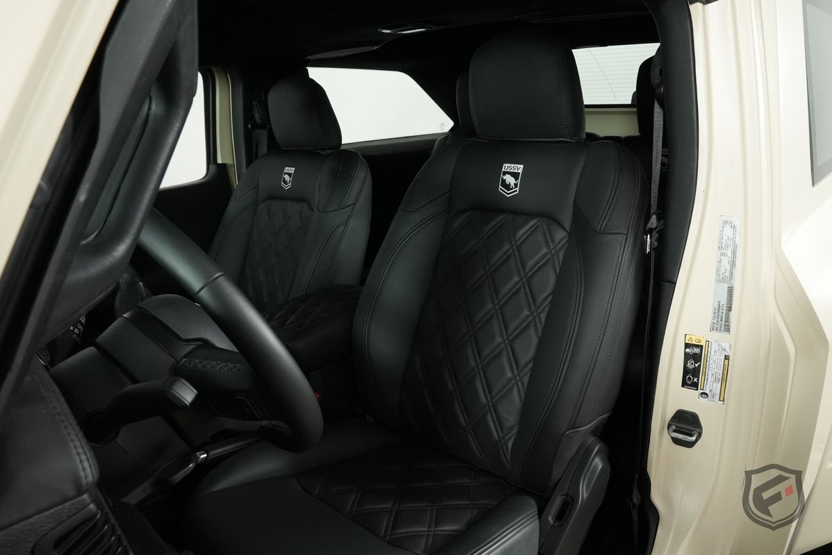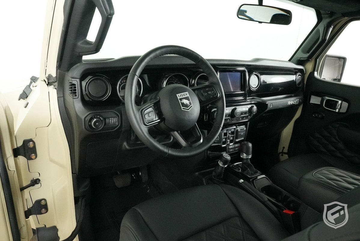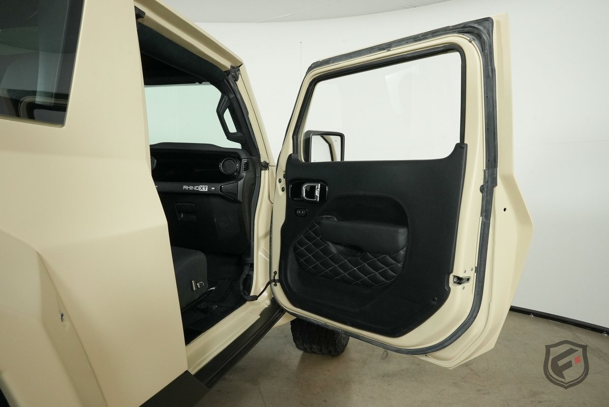 This 2021 US Specialty Vehicles Rhino XT is derived from the modern Jeep Wrangler platform and is equipped with a 3.6L V6 24-valve WT eTorque engine paired with an 8-speed automatic transmission. The exterior is painted in sand complemented by black leather upholstery, and it showcases distinctive custom dual-layer steel bodywork.