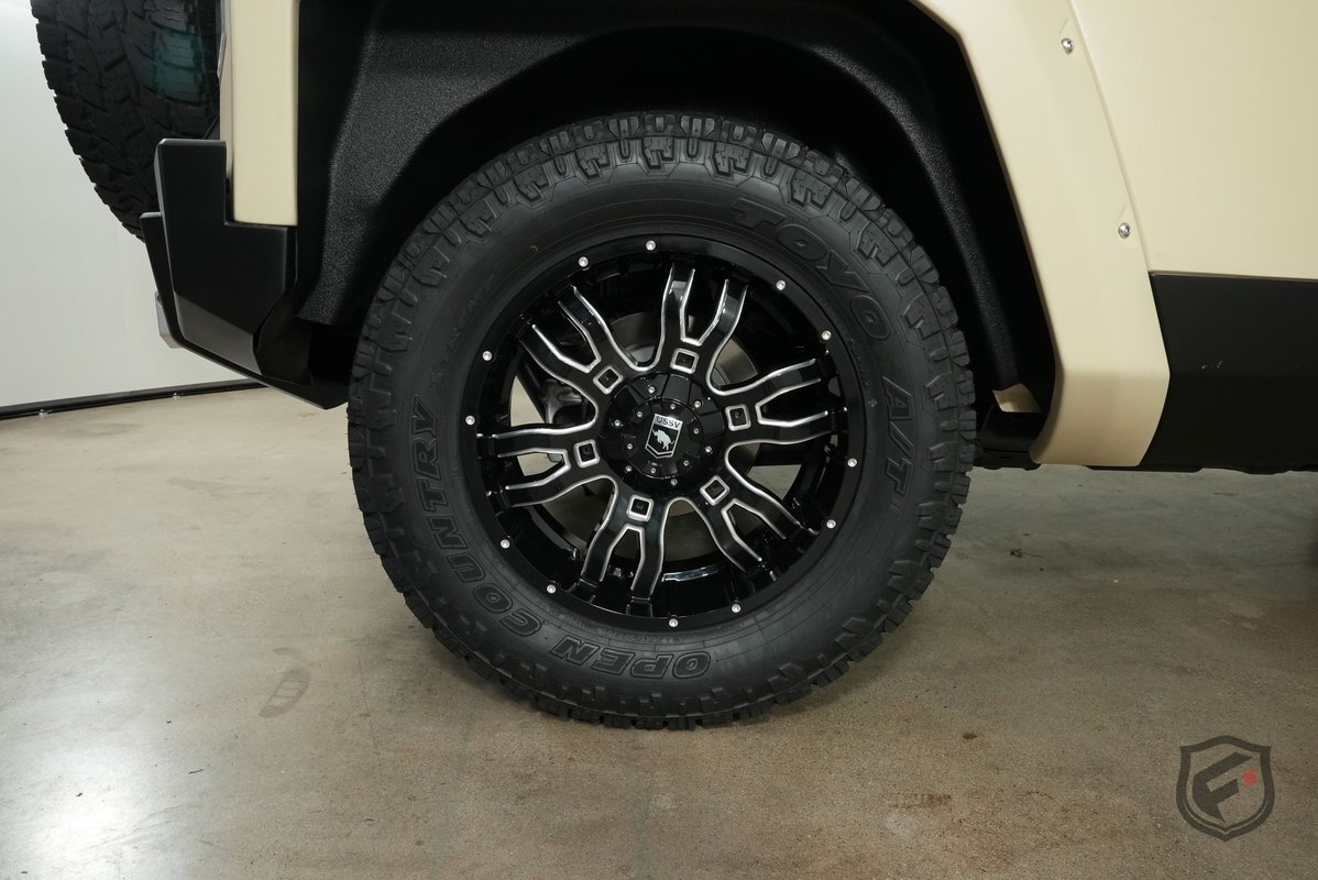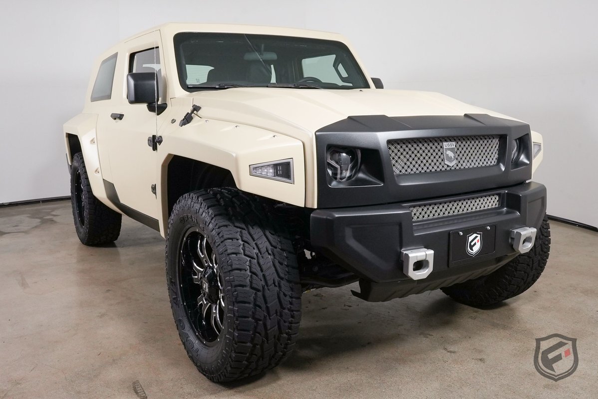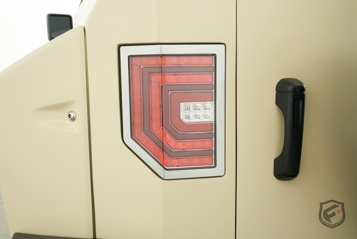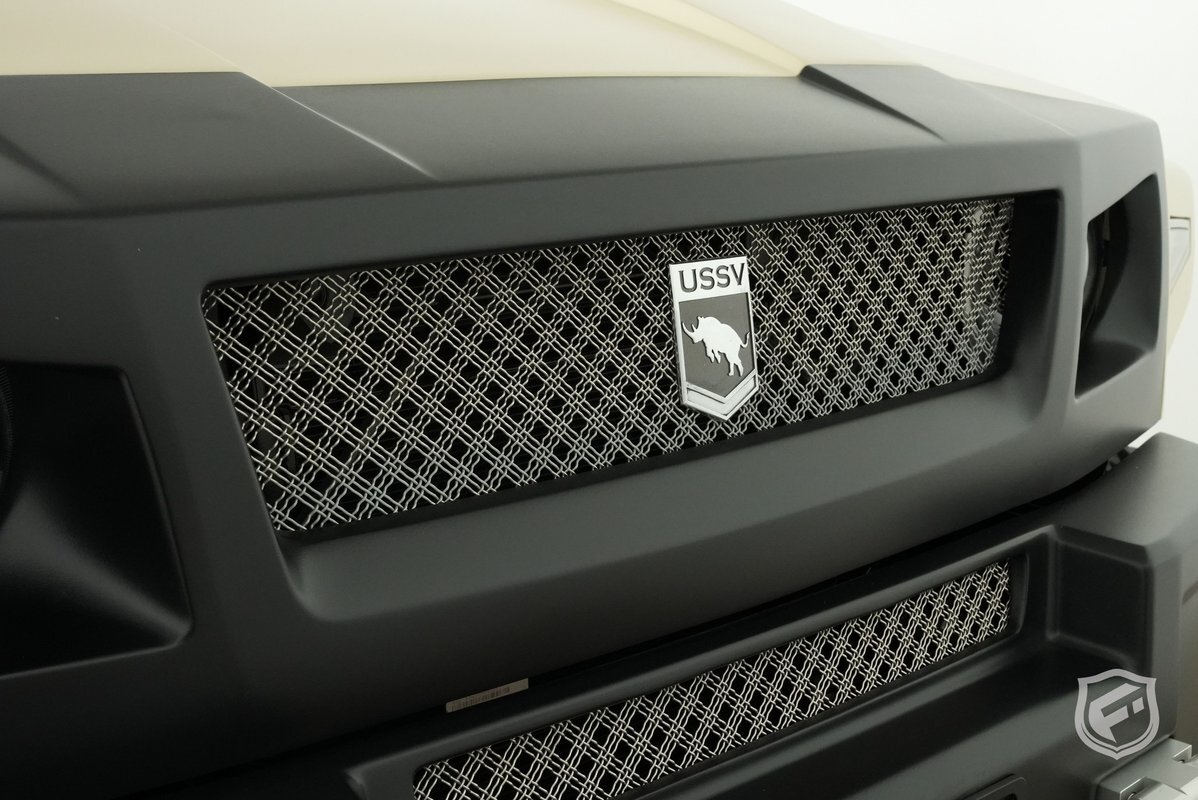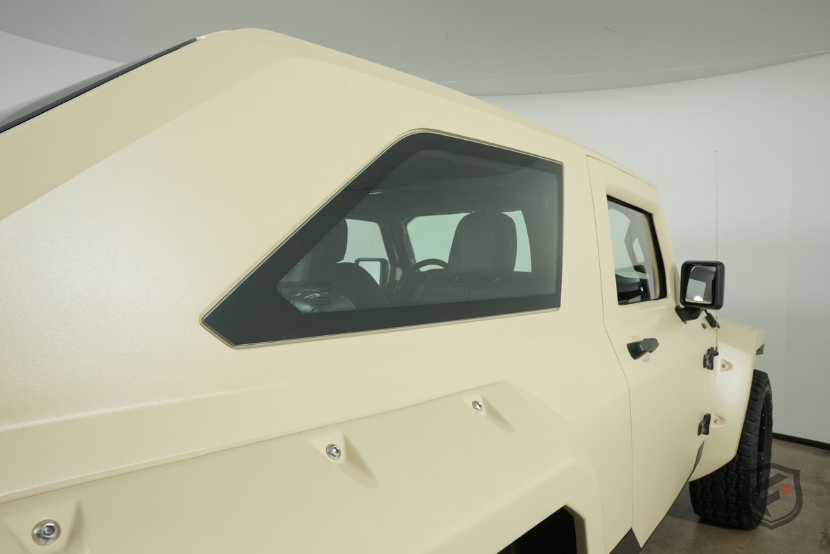 This 2021 US Specialty Vehicles Rhino XT is derived from the modern Jeep Wrangler platform and is equipped with a 3.6L V6 24-valve WT eTorque engine paired with an 8-speed automatic transmission. The exterior is painted in sand complemented by black leather upholstery, and it showcases distinctive custom dual-layer steel bodywork.