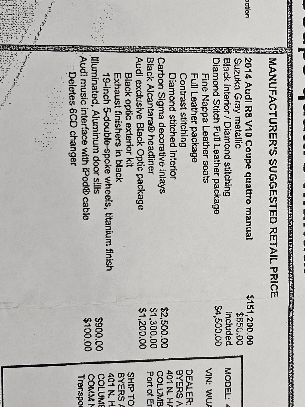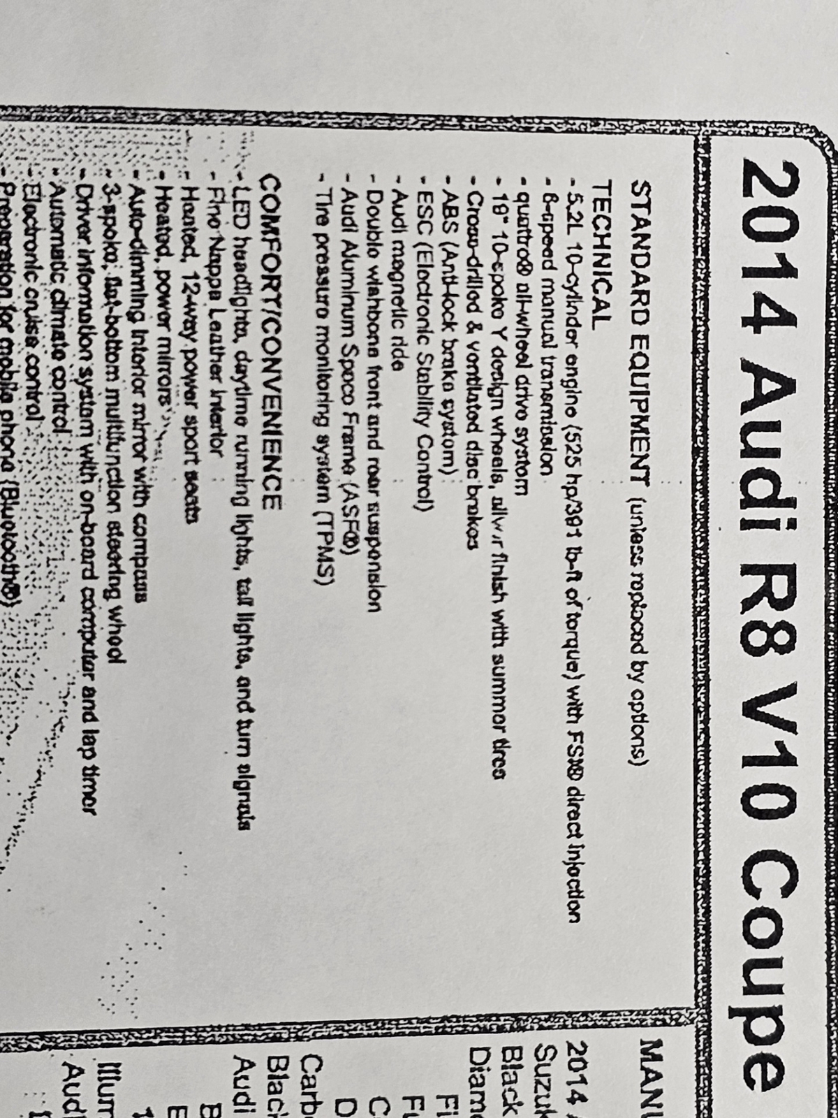 * Flashy. Exotic. Fun. The 2014 Audi R8 has a bold body color selection to highlight its 19-inch wheels, Singleframe grille, and three engine options ranging from a V8 with a six-speed manual transmission to a V10 plus. At 430hp, one is taken from 0-60mph in what feels like the blink of an eye: 4.4 seconds. With 317lb-ft torque and Audi's signature quattro AWD, one can see this is no ordinary car as steering is hydraulically assisted. This gorgeous two-seater has the whole nine yards when it comes to LED: automatic headlights, taillights, indicators, and engine compartment lights. The aluminum-trimmed exterior mirrors are heated as are the windshield wiper nozzles. Around back, an adaptive rear spoiler and chrome-tipped dual exhaust even out the sleek body. Luxury does not halt once inside as driver and passenger are wrapped in the comfort of leather, heated, eight-way power and four-way lumbar adjustable seats. There are two beverage holders, an illuminated, locking glove compartment, fastened front floor mats, a sporty steering wheel and sleek black interior touches. The R8 also rocks out with Audi concert radio featuring seven speakers, single CD player, mp3 playback capability, and optional iPod integration. Drivers can also enjoy Homelink garage door opener, BLUETOOTH capabilities, and cruise control while feeling comfortable knowing airbags surround the drive. In addition, hill hold assist, occupant detection, safety belt reminders, tire pressure monitoring and an alarm with panic function round out the safety of this exquisite driving experience. Source: The Manufacturer Summary