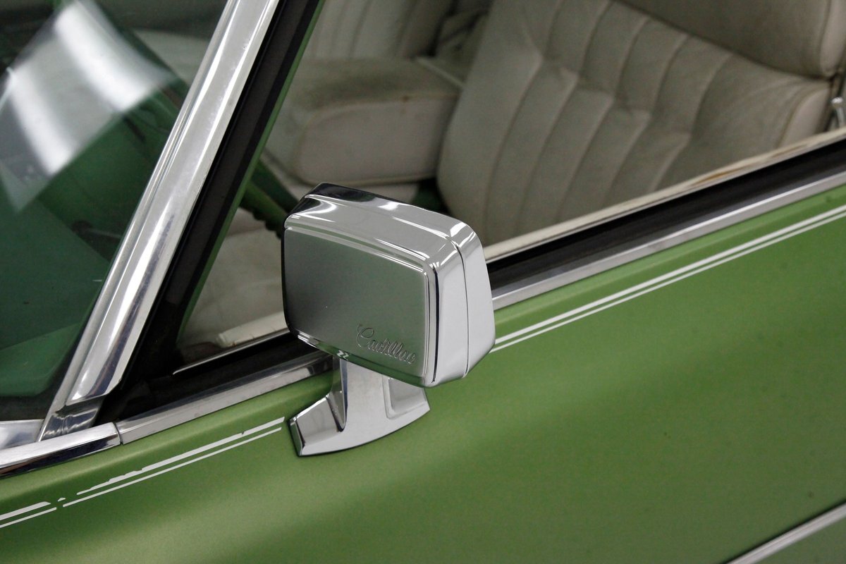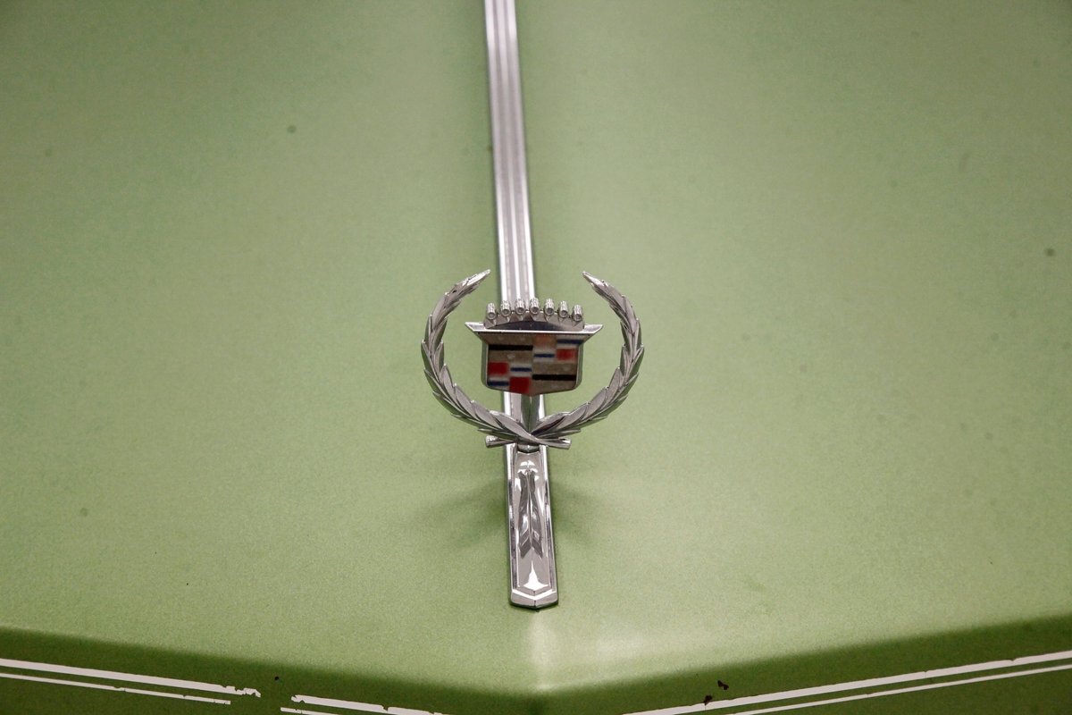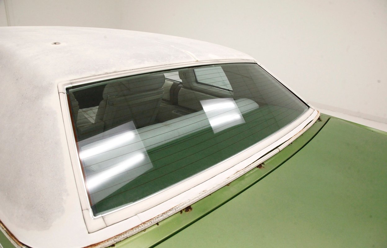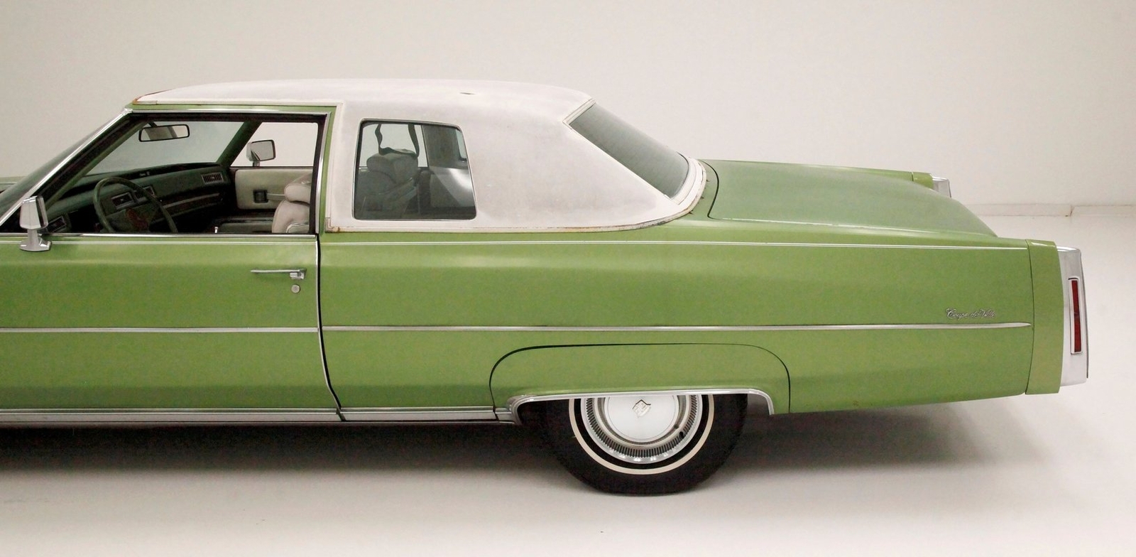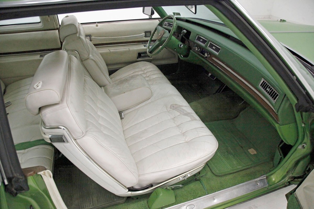 Dual headlights find either side and flank a wide square pattern egg crate grille and have a big bumper below in a match the hood outward V. Signal lighting wraps around the front quarters from the dual duals and a fine trim spear runs the gamut to the back of the car. Large doors provide access to the passenger compartment and this is topped by a white vinyl top. This shows some invasive rusting on its edges, a hole in the vinyl in the center and rust in the white trimming surrounding the top. This rust has migrated to the body and a few other areas where the roof meets the body. The remainder of the Persian Lime Firemist paint is still good and holding the shine. In the back of this big beauty are vertical tail lights and large vertical Caddy iconic bezels just off the backside of the rear quarters. Horizontal tail lights also run across the rear just below the trunk lid. A shiny bumper below, and some Caddy Badging around the entirety of this car, and we have an exterior ladies and gentlemen.