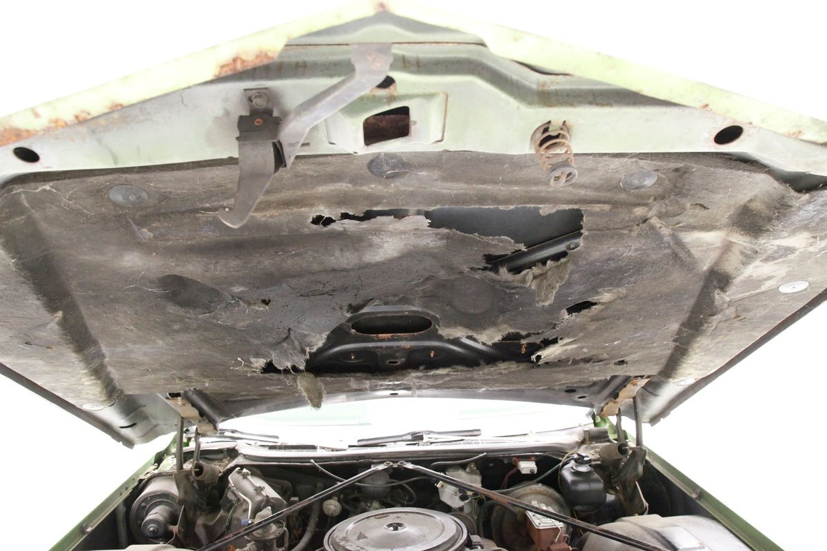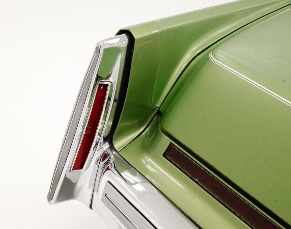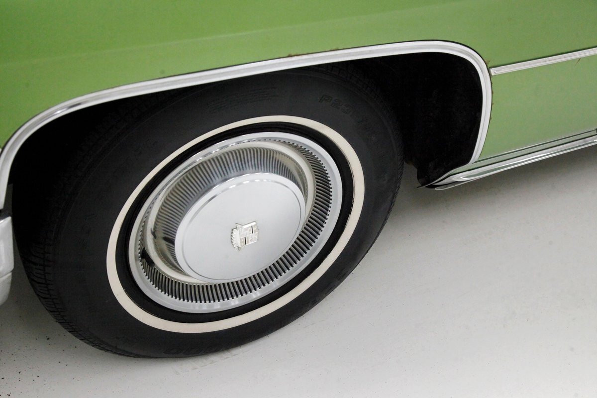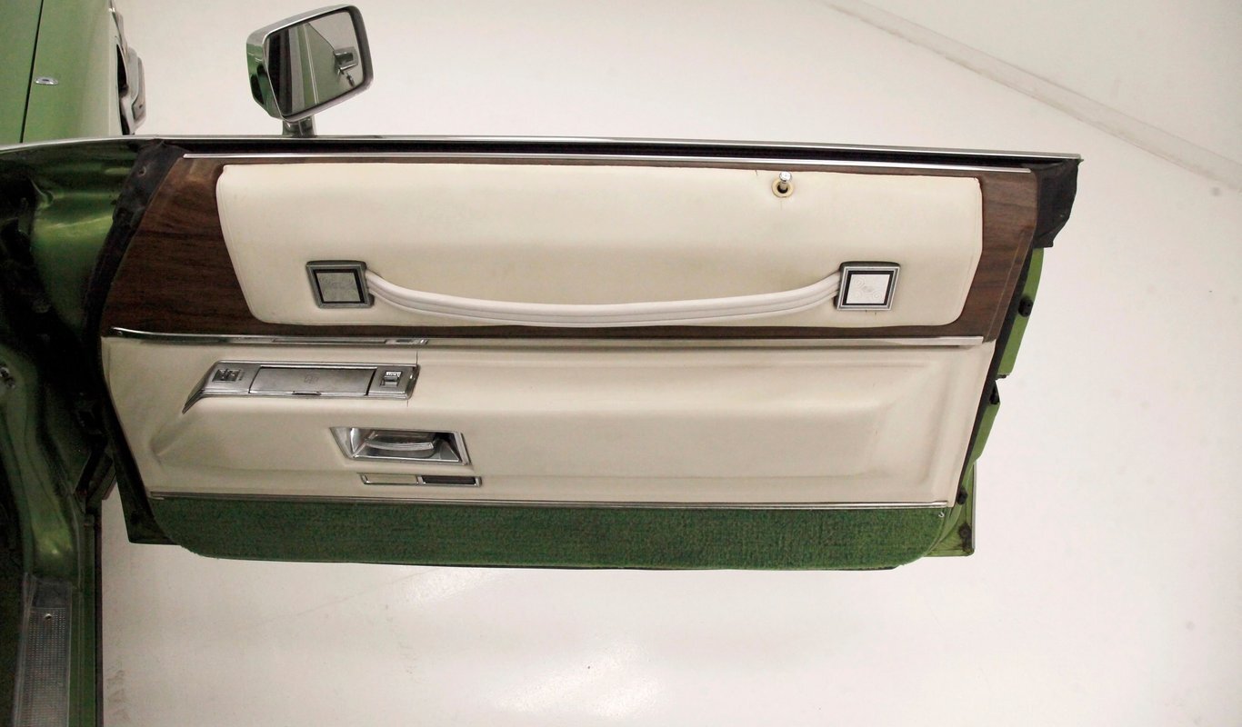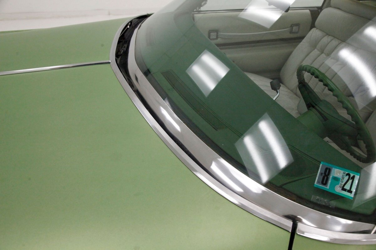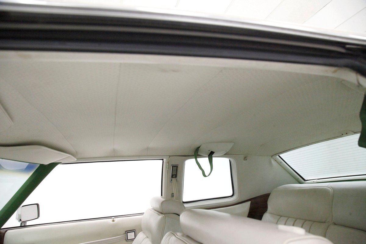 Dual headlights find either side and flank a wide square pattern egg crate grille and have a big bumper below in a match the hood outward V. Signal lighting wraps around the front quarters from the dual duals and a fine trim spear runs the gamut to the back of the car. Large doors provide access to the passenger compartment and this is topped by a white vinyl top. This shows some invasive rusting on its edges, a hole in the vinyl in the center and rust in the white trimming surrounding the top. This rust has migrated to the body and a few other areas where the roof meets the body. The remainder of the Persian Lime Firemist paint is still good and holding the shine. In the back of this big beauty are vertical tail lights and large vertical Caddy iconic bezels just off the backside of the rear quarters. Horizontal tail lights also run across the rear just below the trunk lid. A shiny bumper below, and some Caddy Badging around the entirety of this car, and we have an exterior ladies and gentlemen.