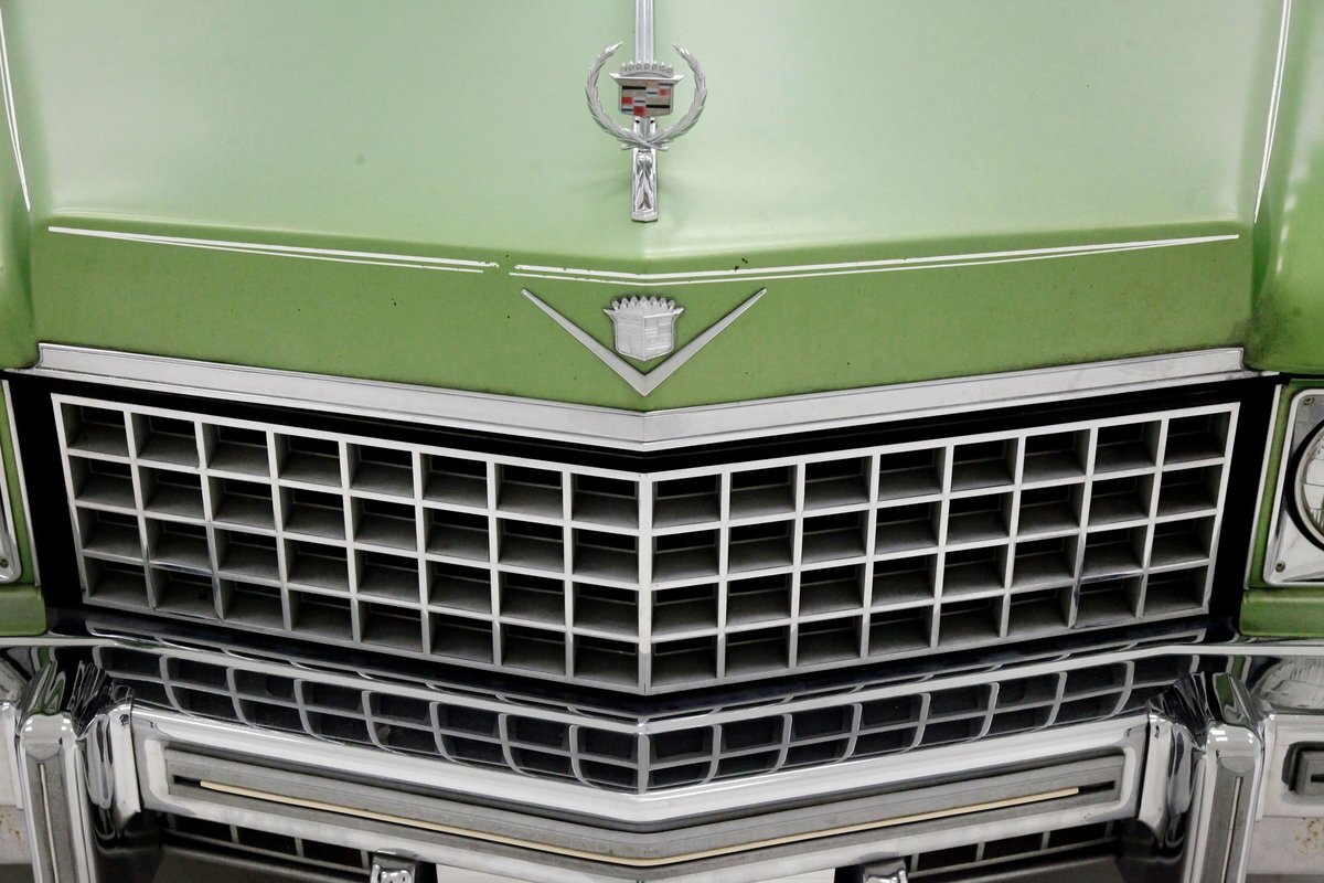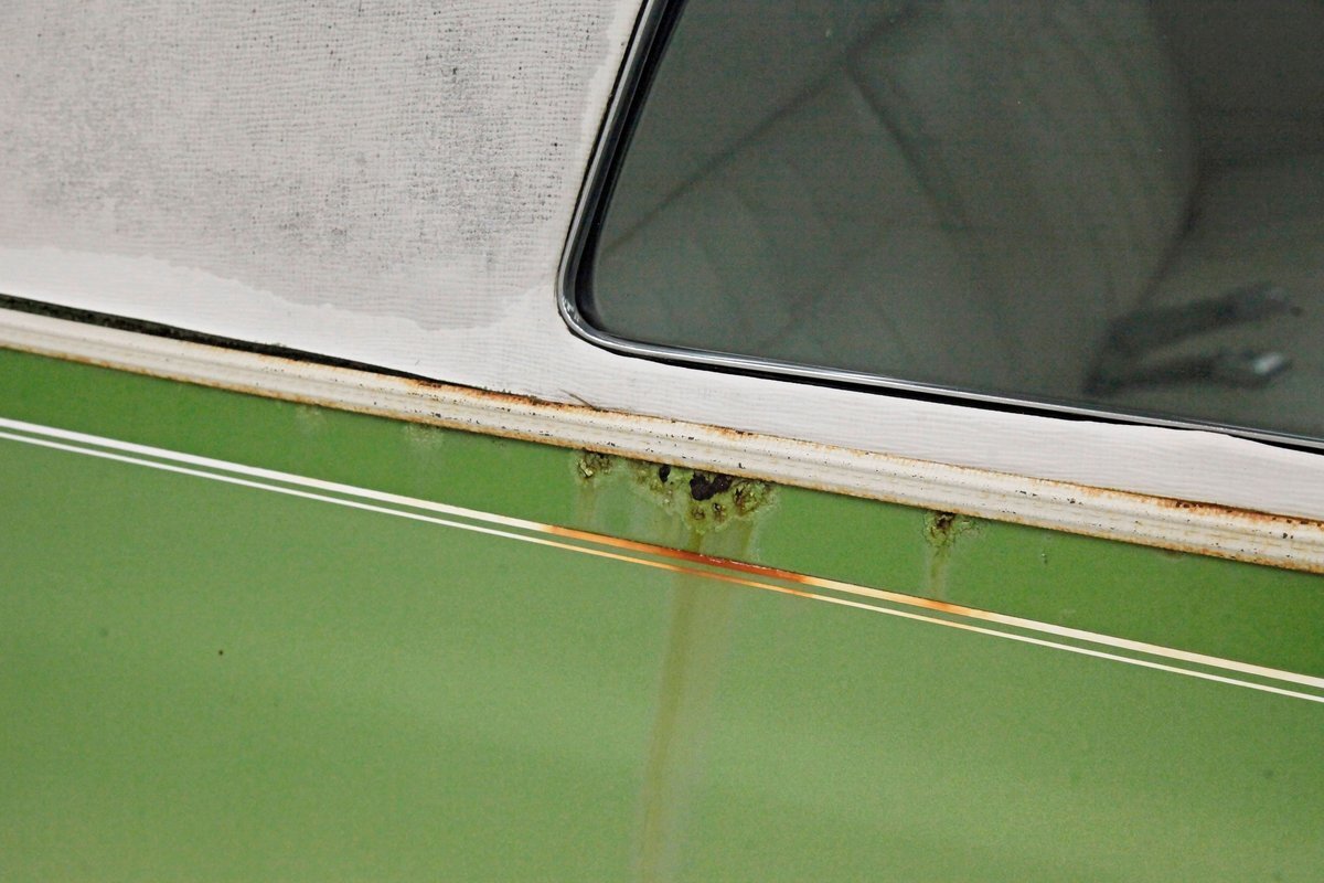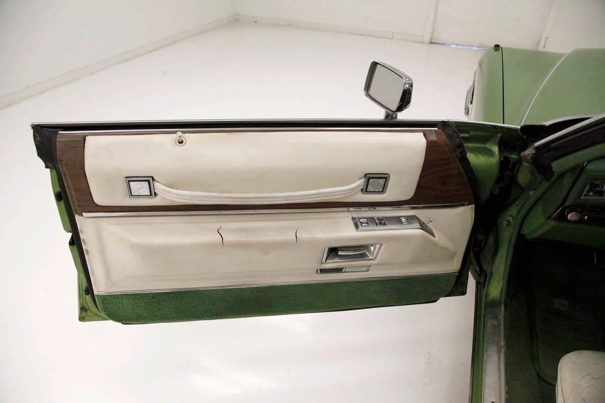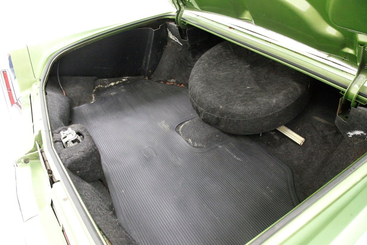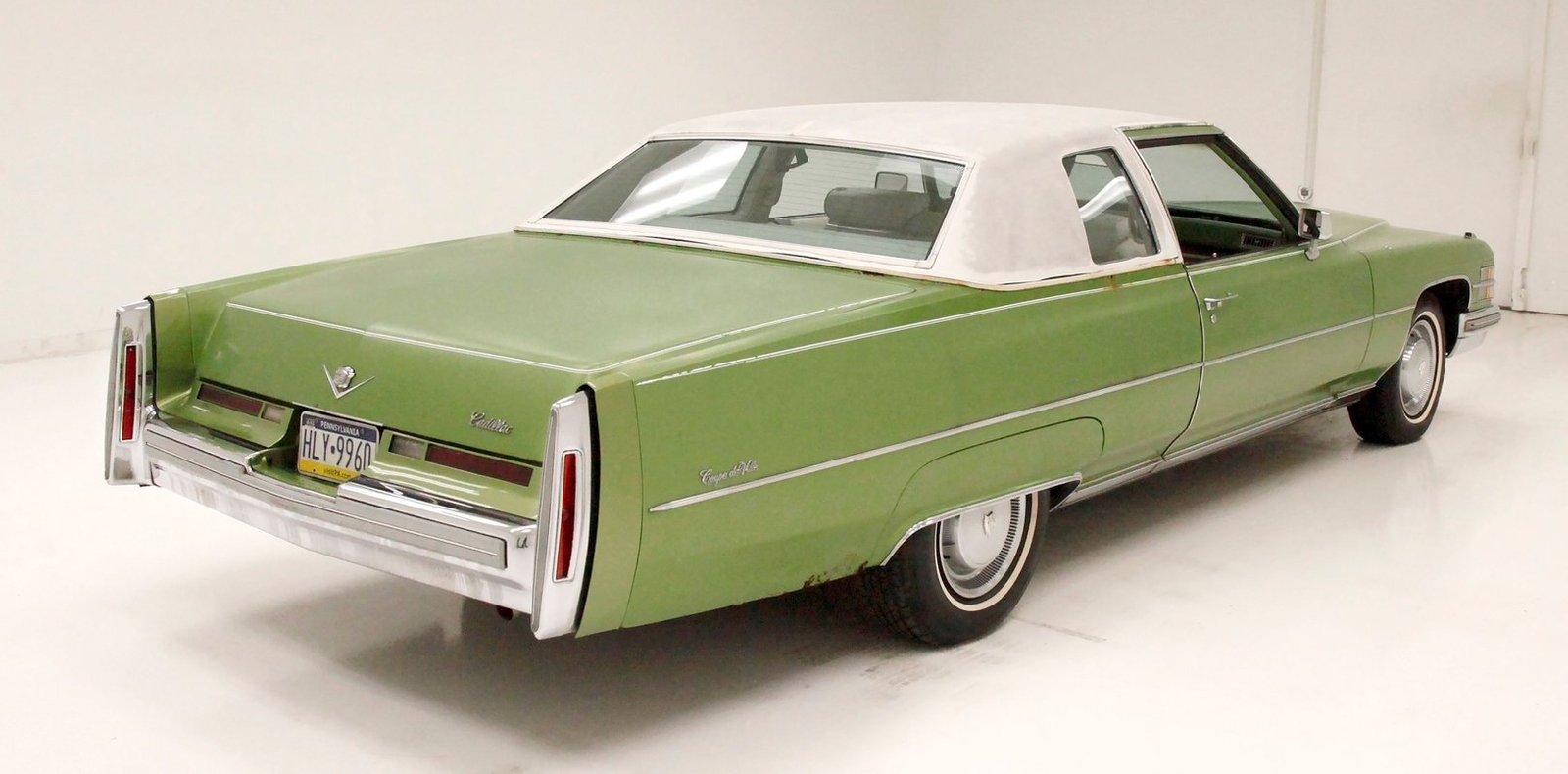 Dual headlights find either side and flank a wide square pattern egg crate grille and have a big bumper below in a match the hood outward V. Signal lighting wraps around the front quarters from the dual duals and a fine trim spear runs the gamut to the back of the car. Large doors provide access to the passenger compartment and this is topped by a white vinyl top. This shows some invasive rusting on its edges, a hole in the vinyl in the center and rust in the white trimming surrounding the top. This rust has migrated to the body and a few other areas where the roof meets the body. The remainder of the Persian Lime Firemist paint is still good and holding the shine. In the back of this big beauty are vertical tail lights and large vertical Caddy iconic bezels just off the backside of the rear quarters. Horizontal tail lights also run across the rear just below the trunk lid. A shiny bumper below, and some Caddy Badging around the entirety of this car, and we have an exterior ladies and gentlemen.