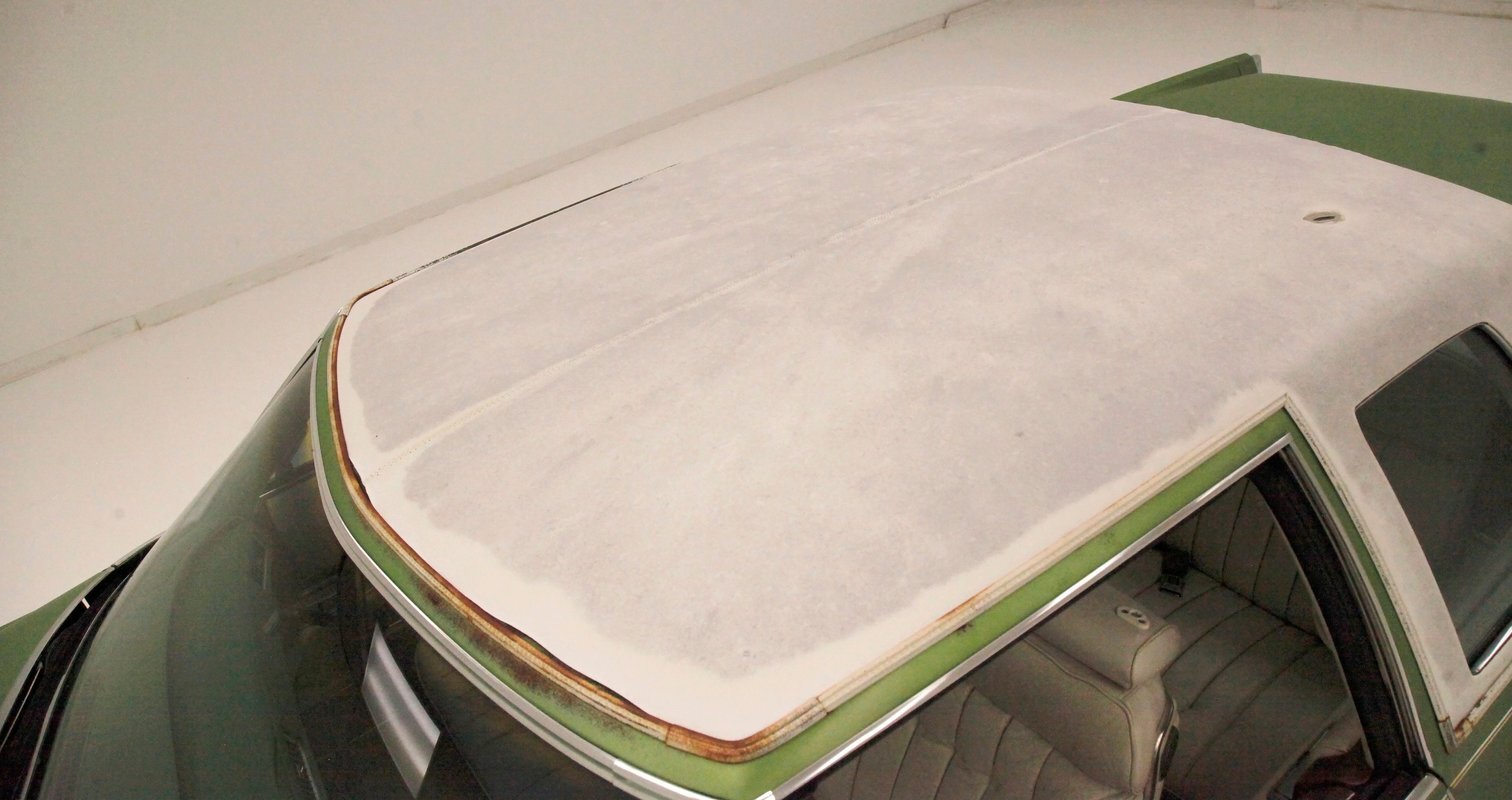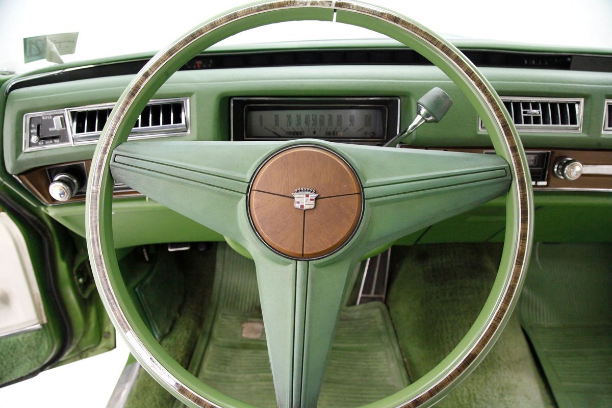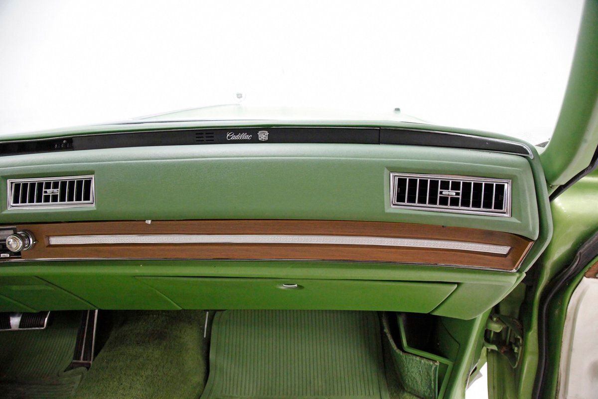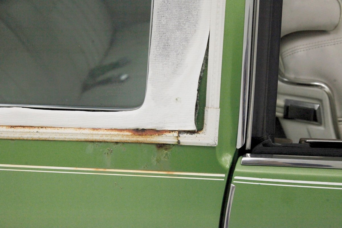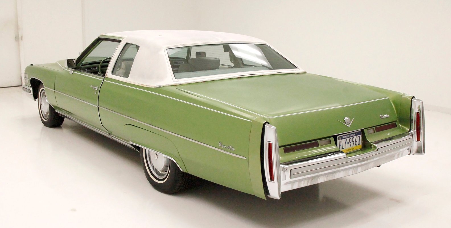 Dual headlights find either side and flank a wide square pattern egg crate grille and have a big bumper below in a match the hood outward V. Signal lighting wraps around the front quarters from the dual duals and a fine trim spear runs the gamut to the back of the car. Large doors provide access to the passenger compartment and this is topped by a white vinyl top. This shows some invasive rusting on its edges, a hole in the vinyl in the center and rust in the white trimming surrounding the top. This rust has migrated to the body and a few other areas where the roof meets the body. The remainder of the Persian Lime Firemist paint is still good and holding the shine. In the back of this big beauty are vertical tail lights and large vertical Caddy iconic bezels just off the backside of the rear quarters. Horizontal tail lights also run across the rear just below the trunk lid. A shiny bumper below, and some Caddy Badging around the entirety of this car, and we have an exterior ladies and gentlemen.
