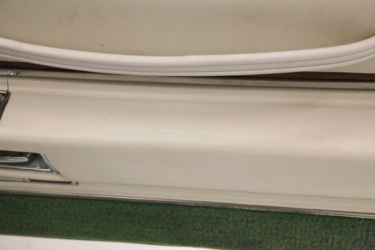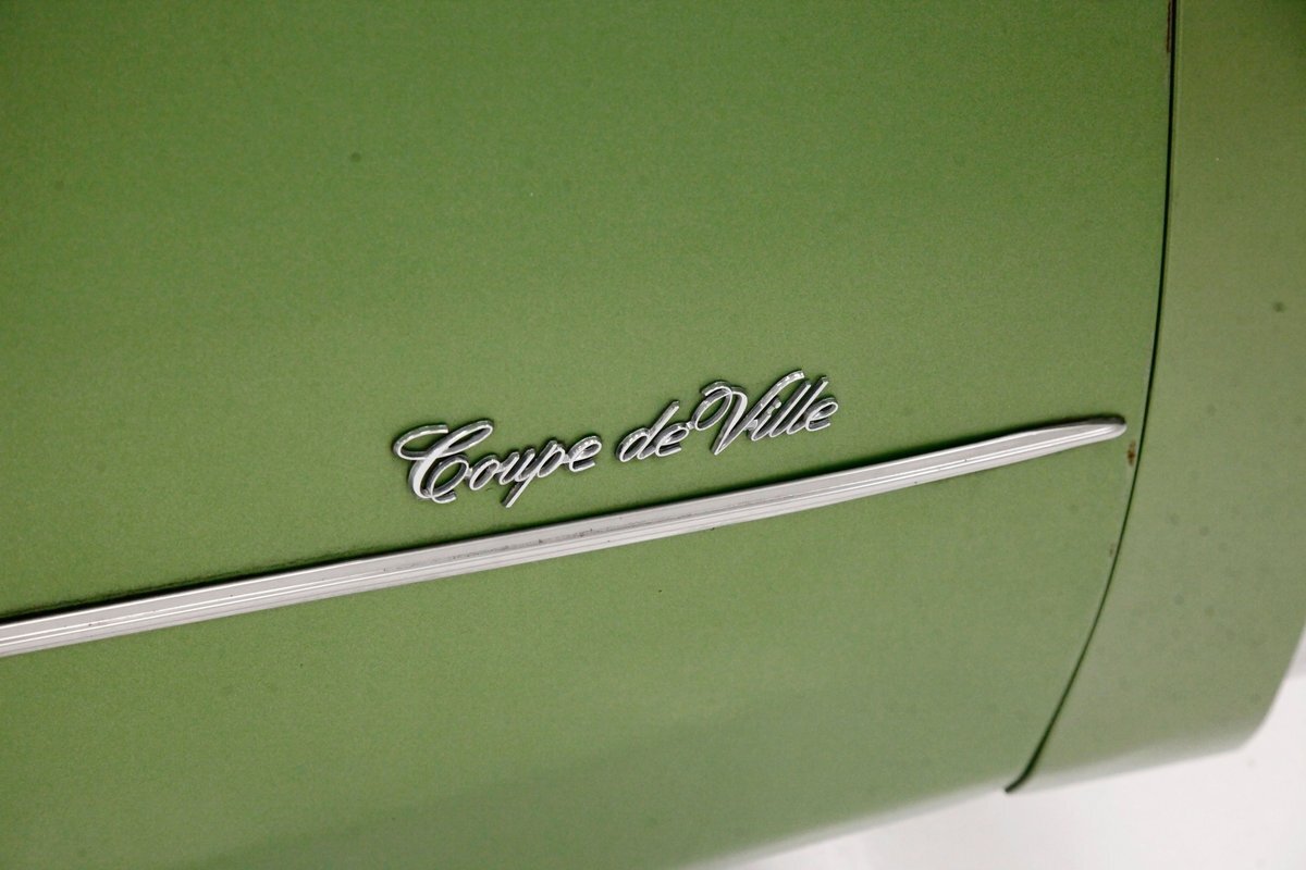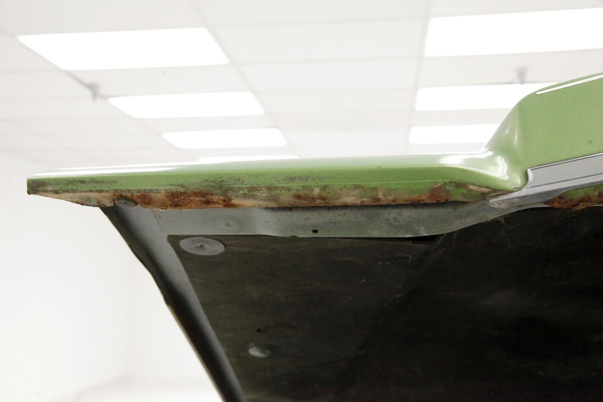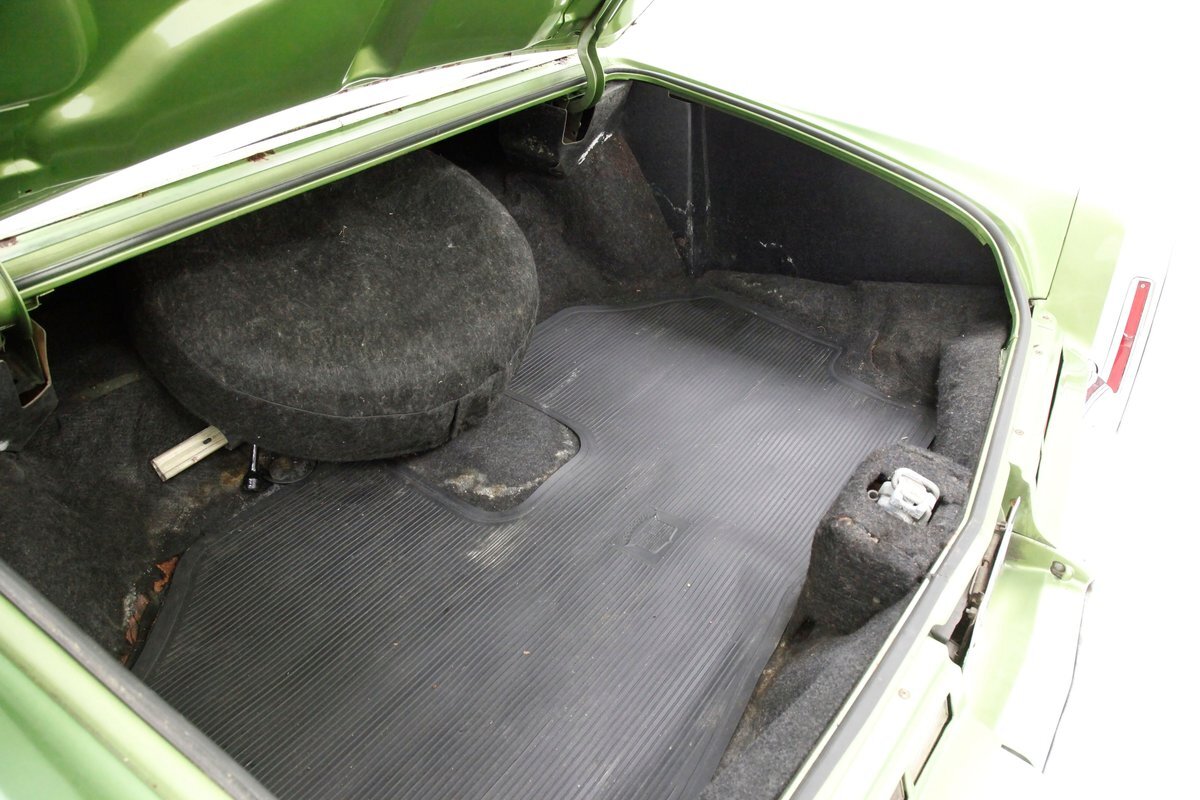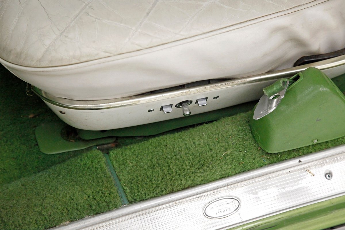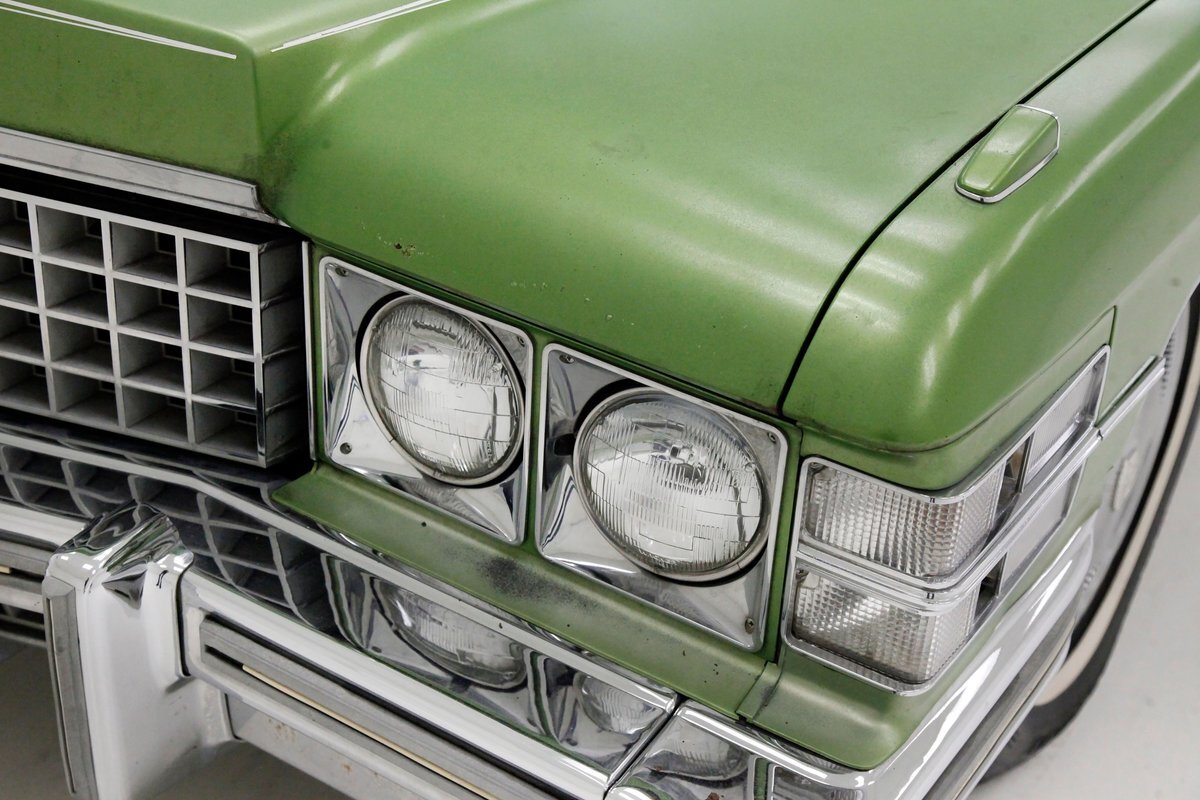 Dual headlights find either side and flank a wide square pattern egg crate grille and have a big bumper below in a match the hood outward V. Signal lighting wraps around the front quarters from the dual duals and a fine trim spear runs the gamut to the back of the car. Large doors provide access to the passenger compartment and this is topped by a white vinyl top. This shows some invasive rusting on its edges, a hole in the vinyl in the center and rust in the white trimming surrounding the top. This rust has migrated to the body and a few other areas where the roof meets the body. The remainder of the Persian Lime Firemist paint is still good and holding the shine. In the back of this big beauty are vertical tail lights and large vertical Caddy iconic bezels just off the backside of the rear quarters. Horizontal tail lights also run across the rear just below the trunk lid. A shiny bumper below, and some Caddy Badging around the entirety of this car, and we have an exterior ladies and gentlemen.
