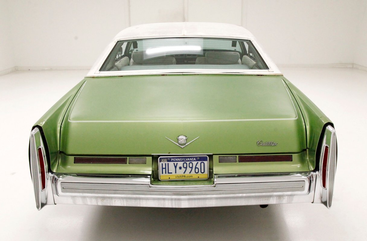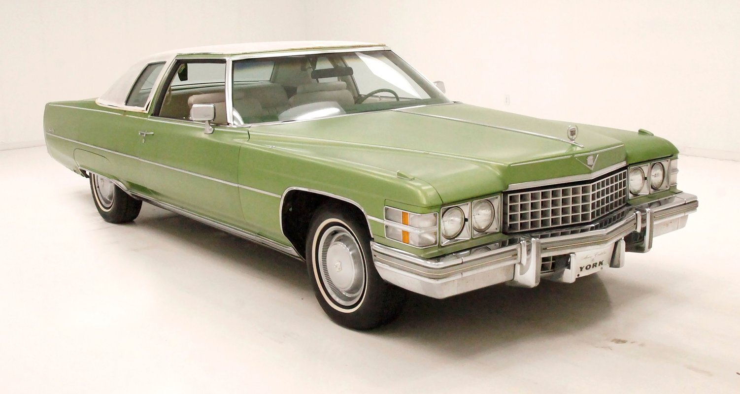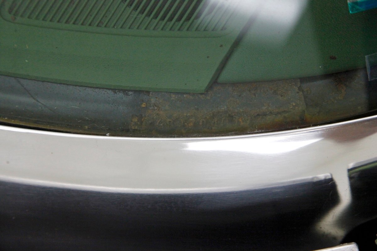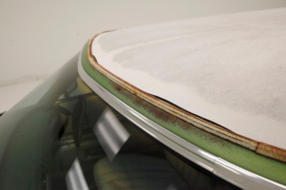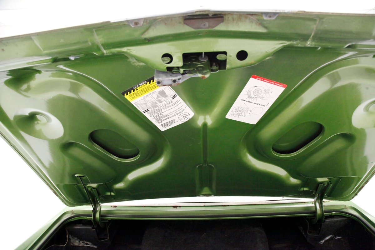 Dual headlights find either side and flank a wide square pattern egg crate grille and have a big bumper below in a match the hood outward V. Signal lighting wraps around the front quarters from the dual duals and a fine trim spear runs the gamut to the back of the car. Large doors provide access to the passenger compartment and this is topped by a white vinyl top. This shows some invasive rusting on its edges, a hole in the vinyl in the center and rust in the white trimming surrounding the top. This rust has migrated to the body and a few other areas where the roof meets the body. The remainder of the Persian Lime Firemist paint is still good and holding the shine. In the back of this big beauty are vertical tail lights and large vertical Caddy iconic bezels just off the backside of the rear quarters. Horizontal tail lights also run across the rear just below the trunk lid. A shiny bumper below, and some Caddy Badging around the entirety of this car, and we have an exterior ladies and gentlemen.