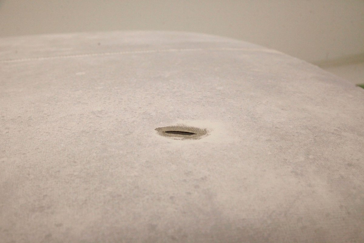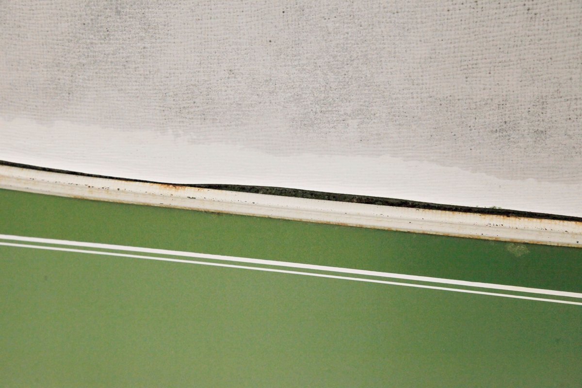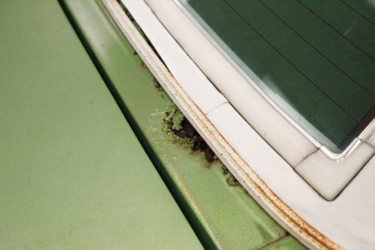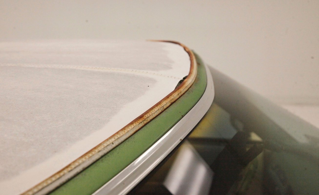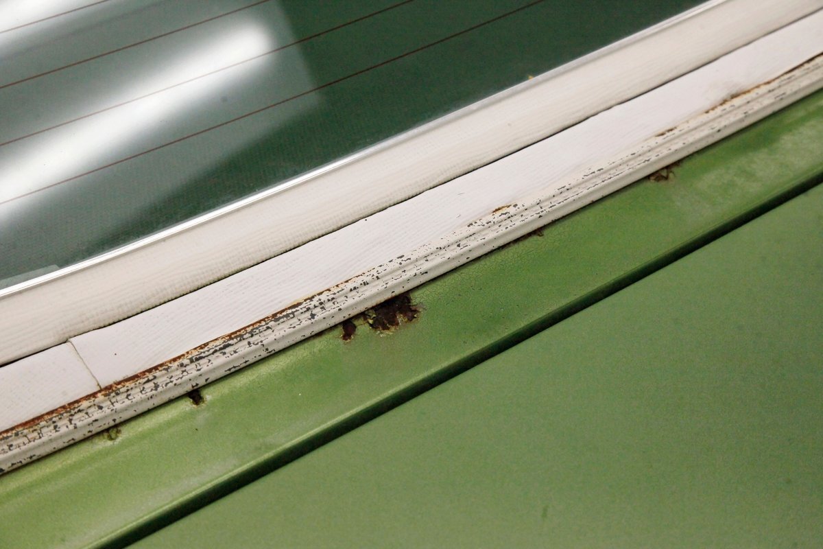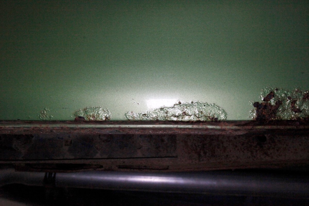 Dual headlights find either side and flank a wide square pattern egg crate grille and have a big bumper below in a match the hood outward V. Signal lighting wraps around the front quarters from the dual duals and a fine trim spear runs the gamut to the back of the car. Large doors provide access to the passenger compartment and this is topped by a white vinyl top. This shows some invasive rusting on its edges, a hole in the vinyl in the center and rust in the white trimming surrounding the top. This rust has migrated to the body and a few other areas where the roof meets the body. The remainder of the Persian Lime Firemist paint is still good and holding the shine. In the back of this big beauty are vertical tail lights and large vertical Caddy iconic bezels just off the backside of the rear quarters. Horizontal tail lights also run across the rear just below the trunk lid. A shiny bumper below, and some Caddy Badging around the entirety of this car, and we have an exterior ladies and gentlemen.