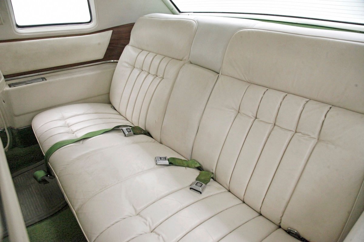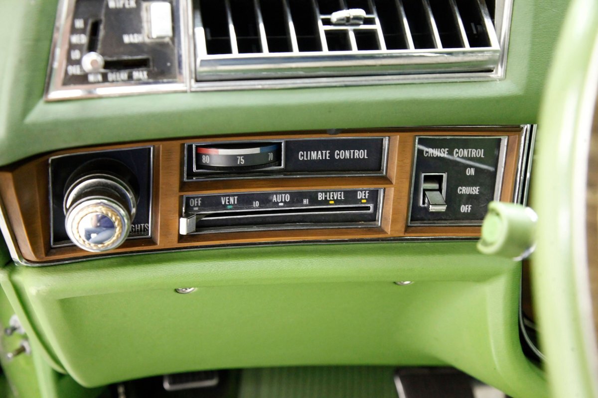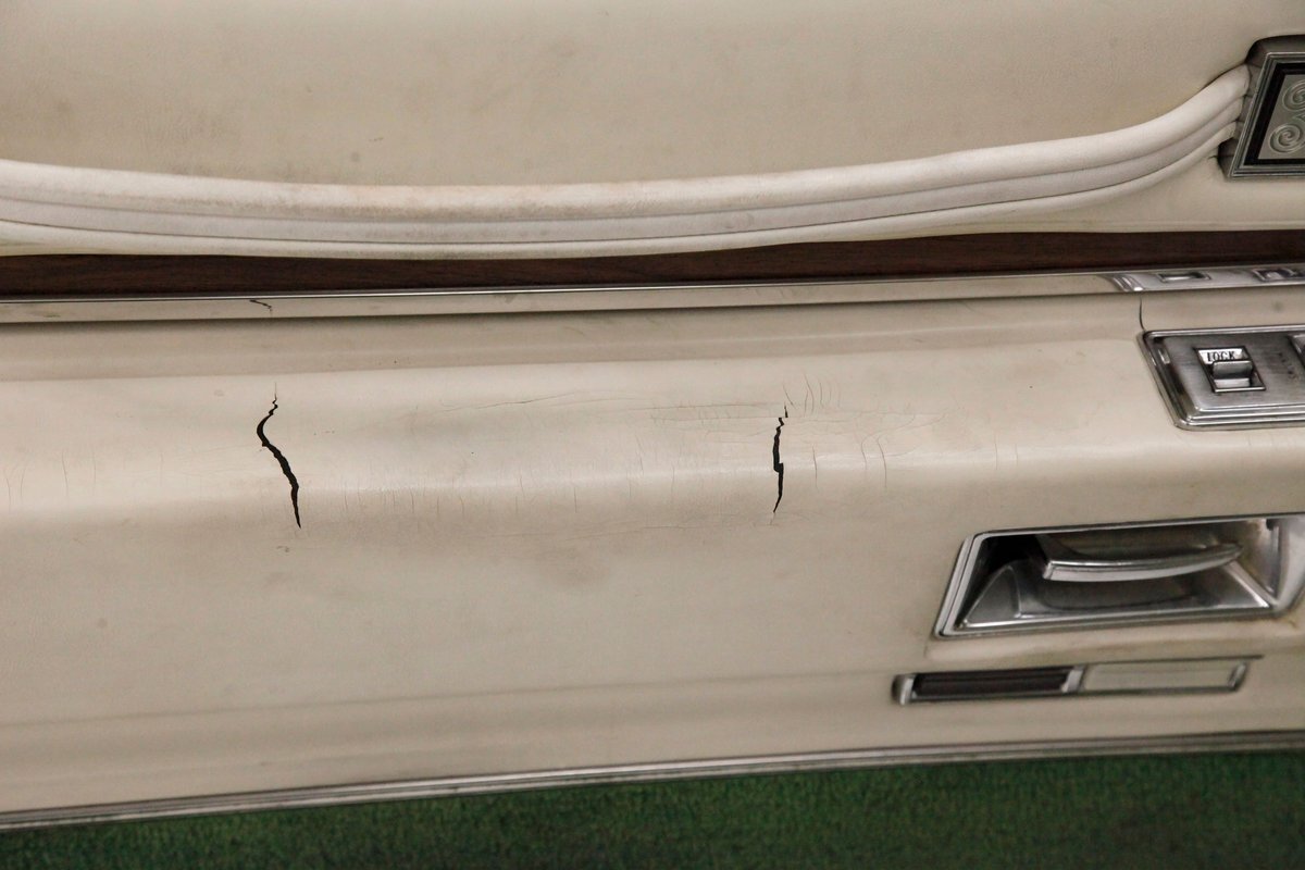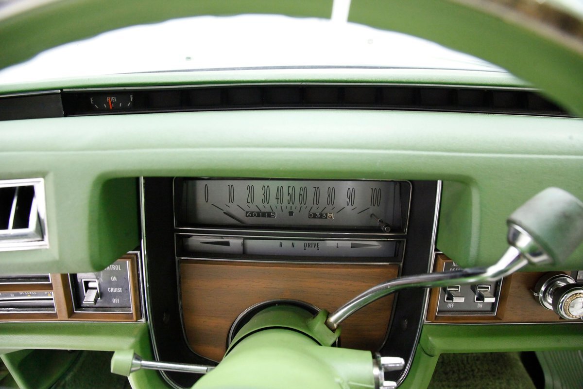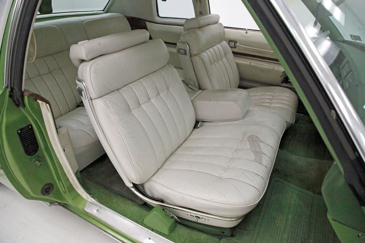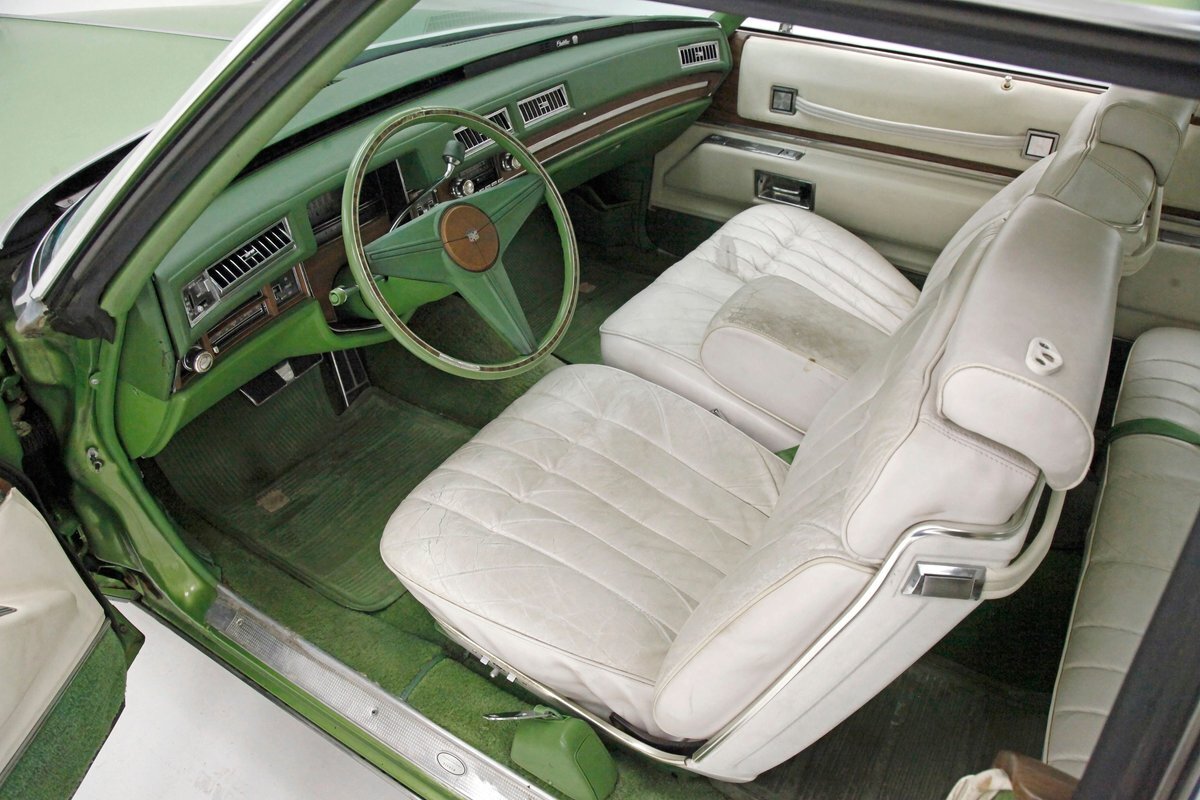 The BIG doors swing easily open and reveal lots of white leather and molded vinyl for the door panels. There is also some wood applique, a stainless toggle panel for the power windows and mirrors, and a molded white armrest. The lowers are exterior matching green carpeting. Inside we can breathe in white leather which may have taken out an entire herd of cattle to cover these overstuffed wide chairs. Split backs with a wide fold down armrest in front, and a wide bench for at least 3 in back. The front seats are power adjustable and show some soiling mostly on the fold down armrest. The door panels have it as well in a lot less obvious form. The green monster curved vinyl molded dash in green stretches across the front of the car. Here we see wood applique accenting and true GM dash design right out of 1974. Green carpeting covers the floors and a tight whitey headliner hangs tightly above. A very mid 70's color combo now retro cool!
