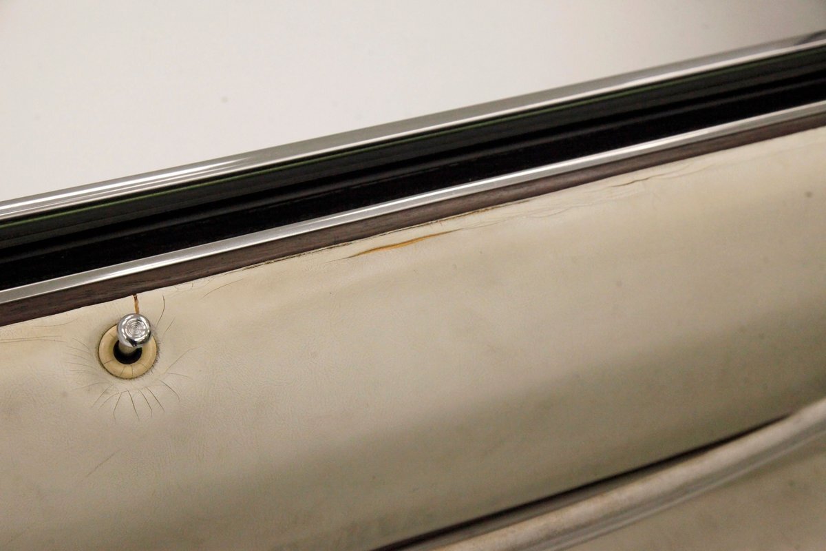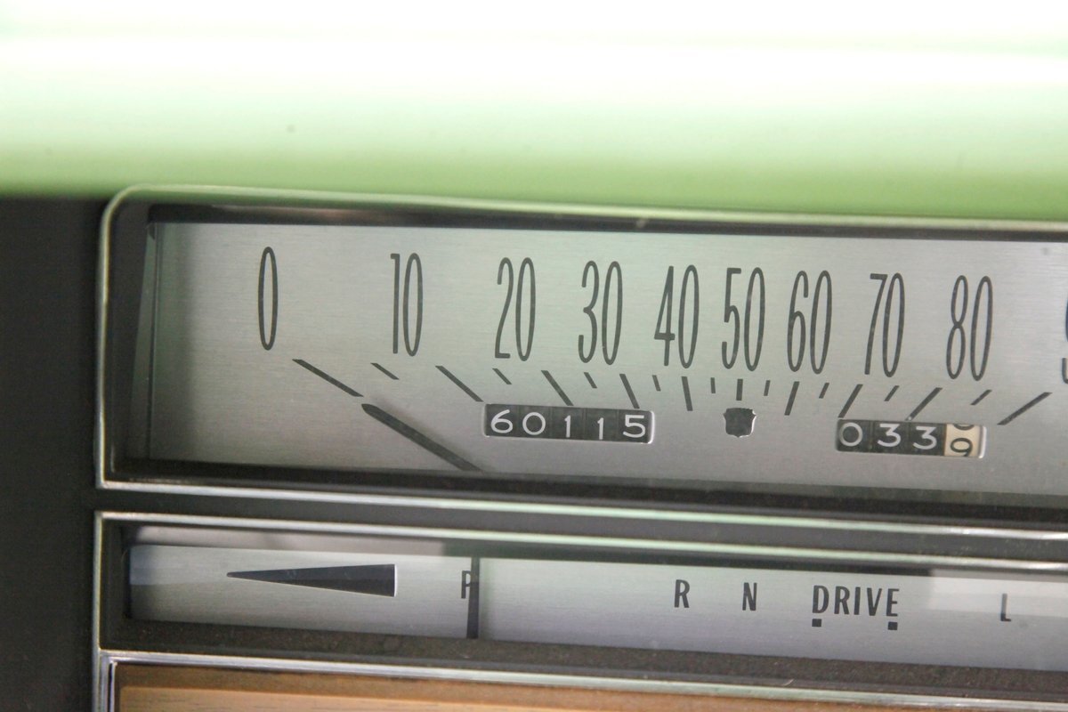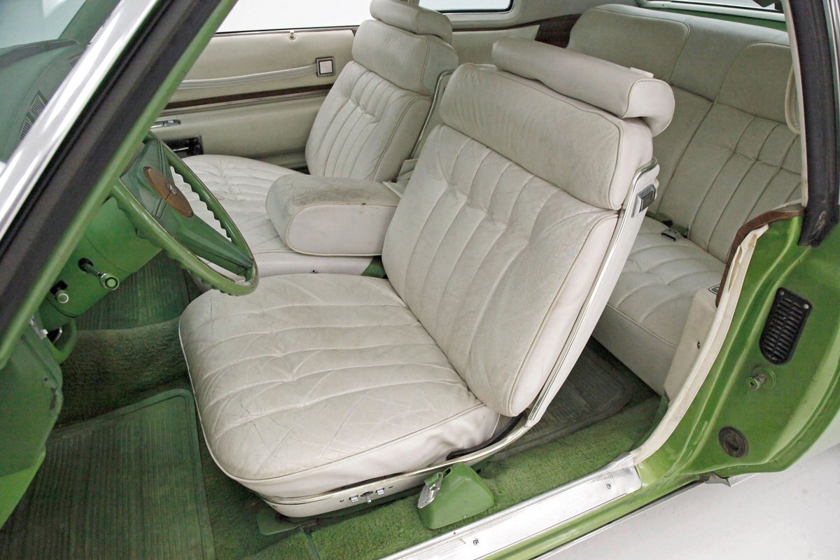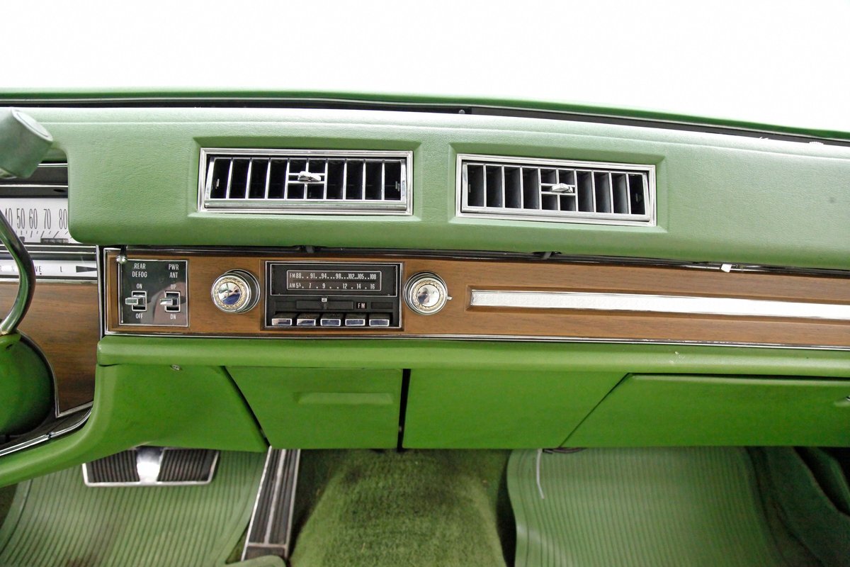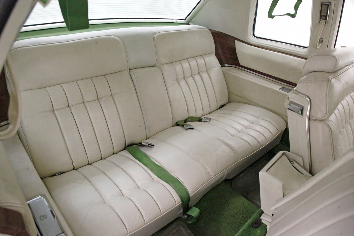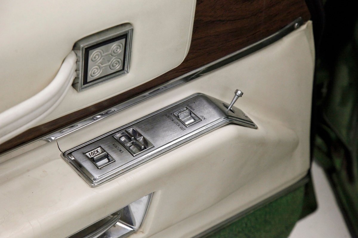 The BIG doors swing easily open and reveal lots of white leather and molded vinyl for the door panels. There is also some wood applique, a stainless toggle panel for the power windows and mirrors, and a molded white armrest. The lowers are exterior matching green carpeting. Inside we can breathe in white leather which may have taken out an entire herd of cattle to cover these overstuffed wide chairs. Split backs with a wide fold down armrest in front, and a wide bench for at least 3 in back. The front seats are power adjustable and show some soiling mostly on the fold down armrest. The door panels have it as well in a lot less obvious form. The green monster curved vinyl molded dash in green stretches across the front of the car. Here we see wood applique accenting and true GM dash design right out of 1974. Green carpeting covers the floors and a tight whitey headliner hangs tightly above. A very mid 70's color combo now retro cool!