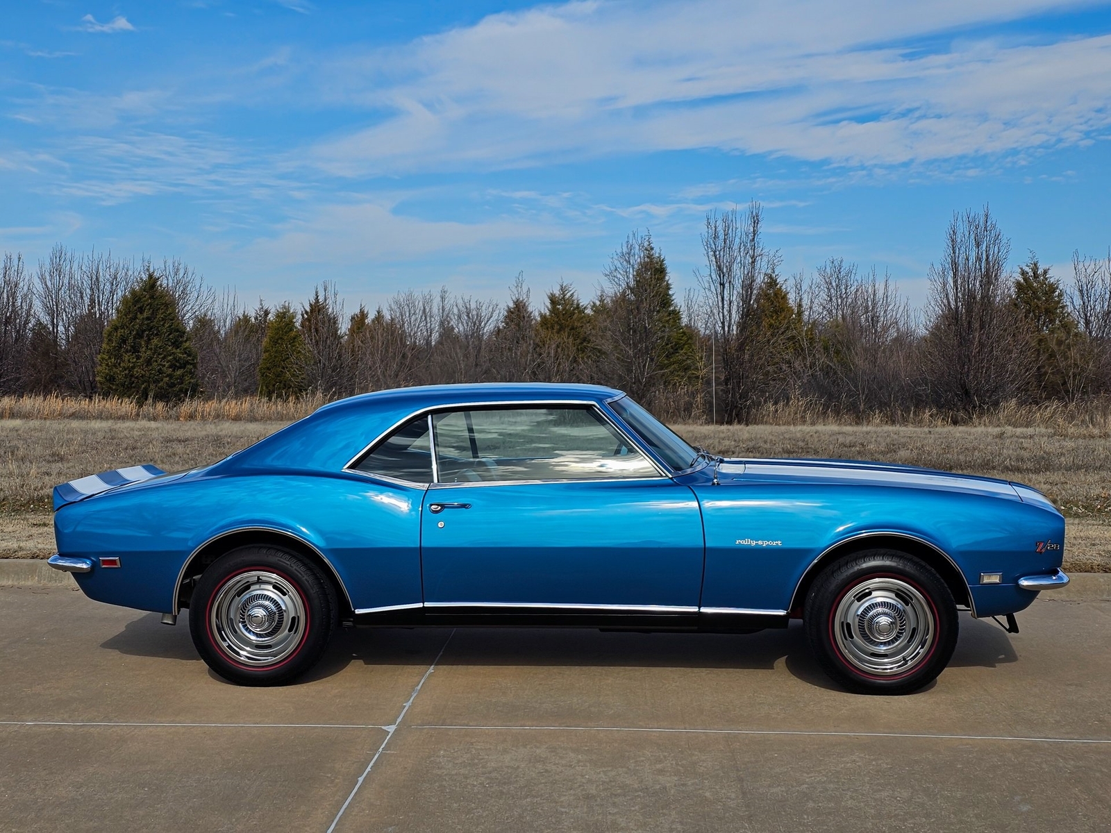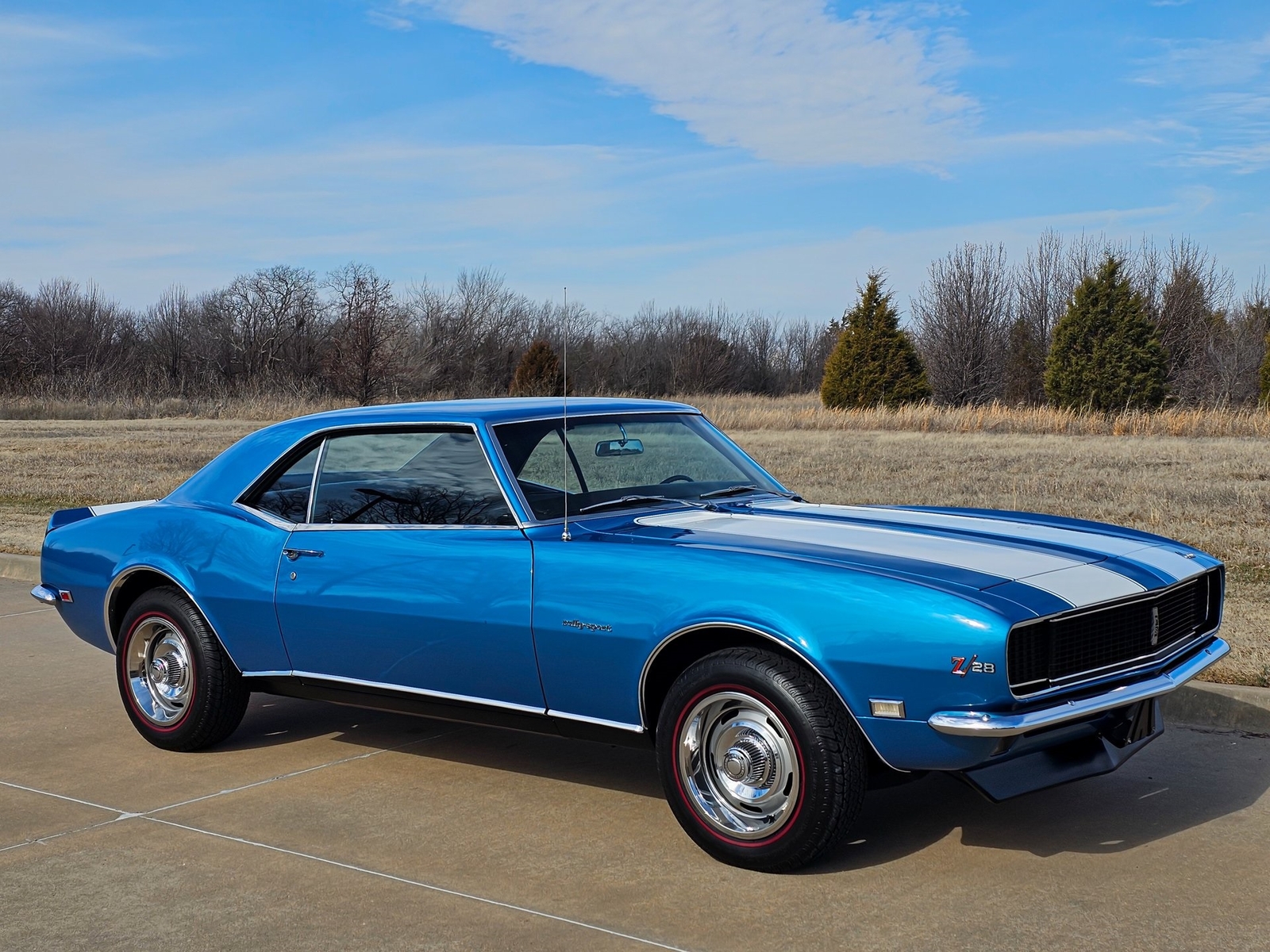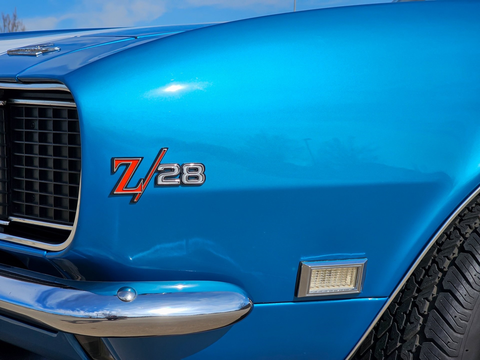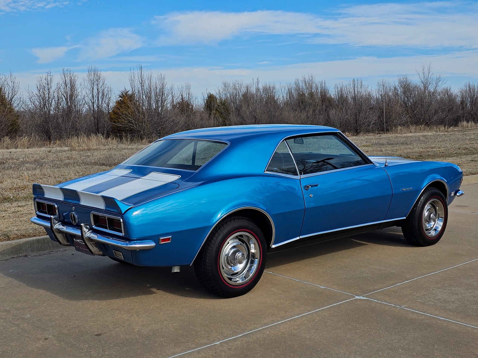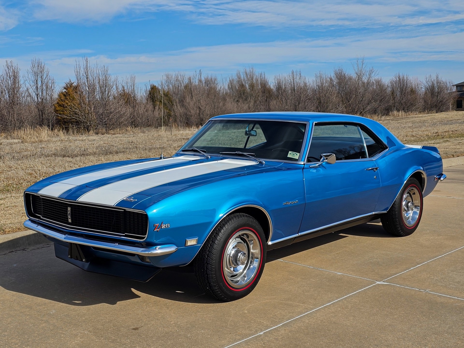 1968 CHEVROLET CAMARO RS Z/28 * 57K MILES * COUPE * BLUE PAINT WITH PAINTED WHITE STRIPES * BLACK INTERIOR * MOST OF THE INTERIOR IS ORIGINAL * OPTIONS INCLUDE TACHOMETER WITH CLOCK, CONSOLE, GAUGES, AM/FM RADIO WITH REAR SPEAKER AND TEAK WHEEL * ALL GAUGES WORK GREAT WITH OIL PRESSURE SHOWING 60 PSI COLD * ALL INTERIOR LIGHTS WORK * ALL WOOD GRAIN IS IN GOOD CONDITION * REAR PACKAGE TRAY IS NEW * CARPET, HEADLINER AND SUN VISORS ARE IN GOOD CONDITION * ALL TRUNK JACK PARTS ARE INCLUDED WITH JACK AND POSI-TRACTION DECALS * EXTERIOR UU CODE LEMANS BLUE PAINT * FRONT AND REAR SPOILERS * RALLY WHEELS * DELCO BATTERY, AIR PUMP, NEW MASTER CYLINDER AND POWER BRAKE BOOSTER AND ALL PERIOD CORRECT HOSE CLAMPS * THE ENGINE IS MATCHING NUMBER 302 (MO). EVEN THE HOLLEY CARBURETOR IS CORRECT (4053) ALONG WITH THE INTAKE AND EXHAUST MANIFOLDS * NEW UNDER HOOD INSULATION * THE ORIGINAL EMISSIONS STICKER IS STILL ON THE FRONT CORE SUPPORT! * THE FRONT SUB-FRAME APPEARS TO HAVE BEEN REMOVED, CLEANED PAINTED AND REPLACED WITH ALL NEW BUSHINGS AND SUSPENSION COMPONENTS * THE REAR SUSPENSION HAS BEEN REBUILT * CORRECT 12-BOLT REAR * NEW GAS TANK * CORRECT CHAMBERED Z/28 MUFFLER AND EXHAUST * NO SIGNS OF ANY RUST, REPAIRS OR DAMAGE WERE FOUND DURING 3RD PARTY APPRAISAL.