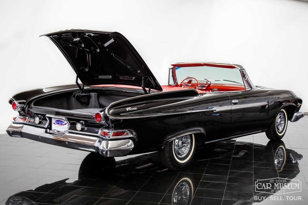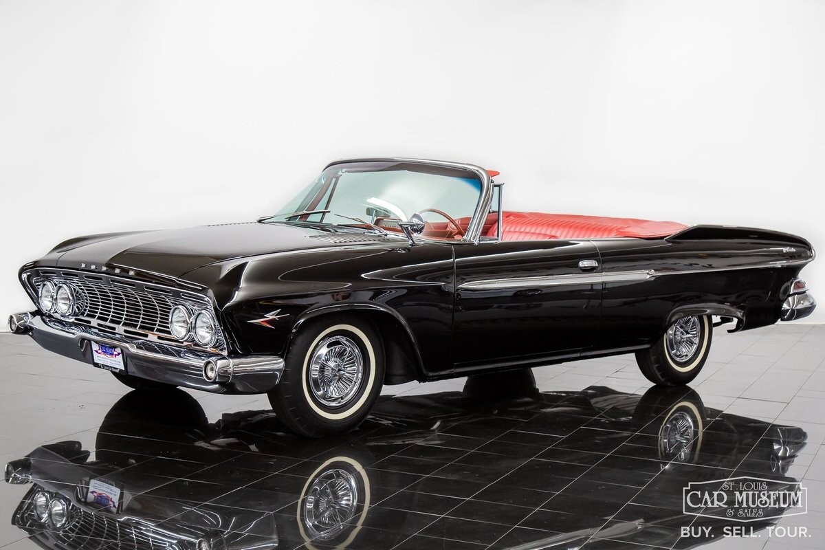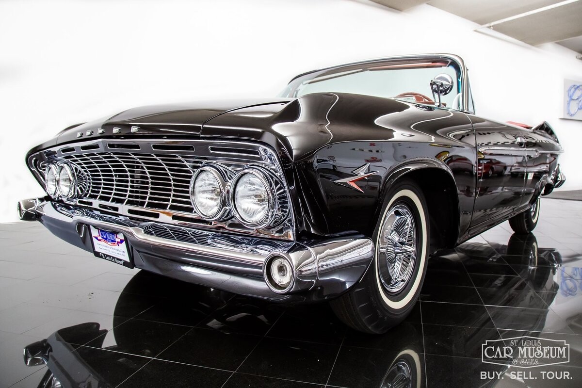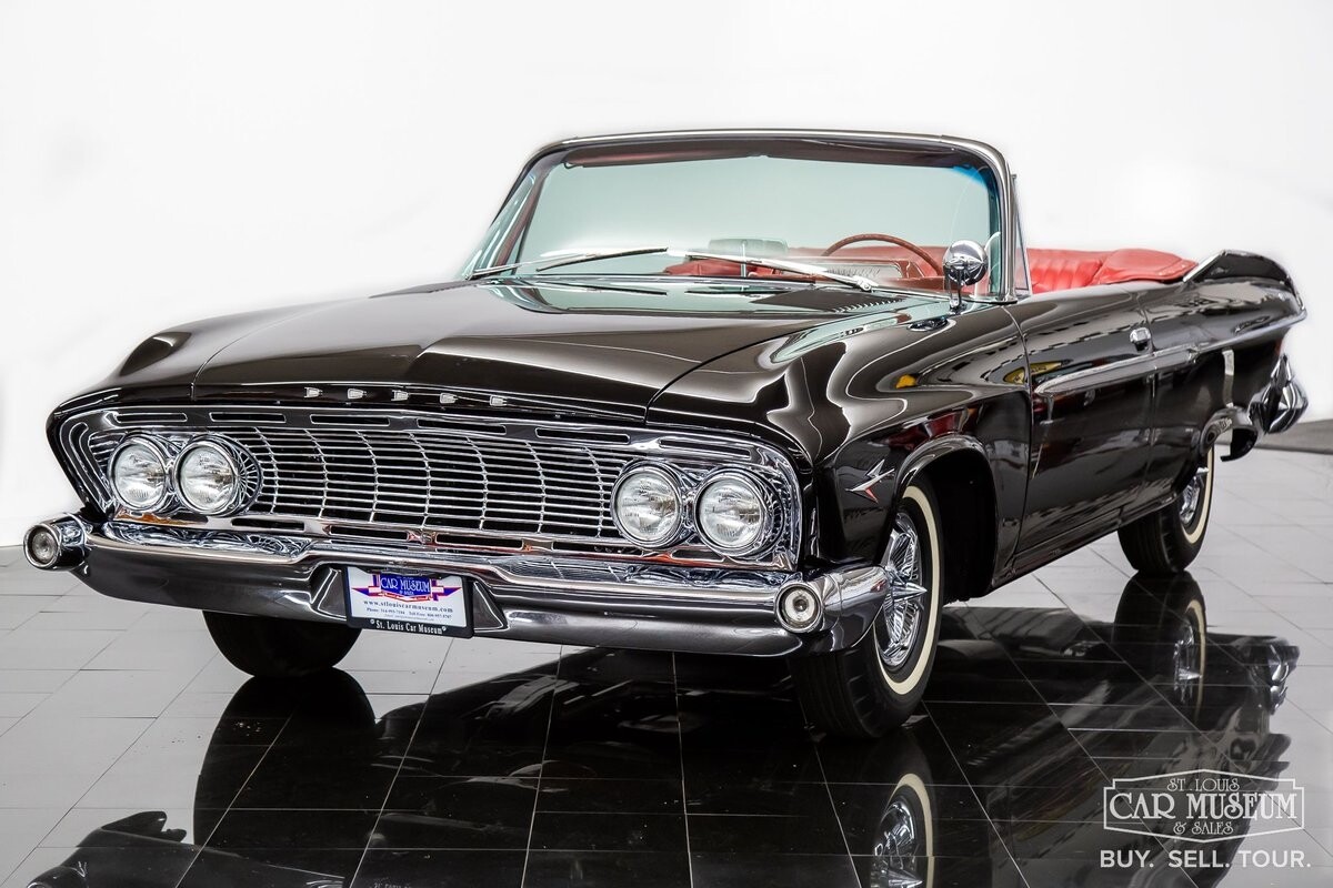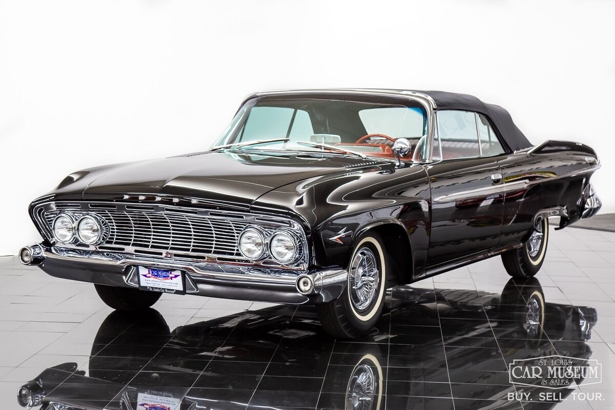 We are proud to offer for sale a gorgeous 1961 Dodge Dart Phoenix D-500 Convertible finished in factory code correct BB1- Midnight (Black) with a Black convertible top of correct 325- Red Vinyl & Cloth interior! This fine Phoenix D-500 example has been restored to an excellent, show-level condition throughout! Under the hood rests its original 383ci High Performance V8 with D-500 dual carburetion resting on the impressive Cross Ram tuned intake system to produce 340 horsepower and 460 lb. ft. of torque! Options include pushbutton TorqueFlite 3-speed automatic transmission, AM radio, power folding convertible top, heater/defrost, chrome full wheel covers, Goodyear Custom Super Cushion 8.00-14 1.5" whitewall tires, and a fender-mounted rearview mirror.