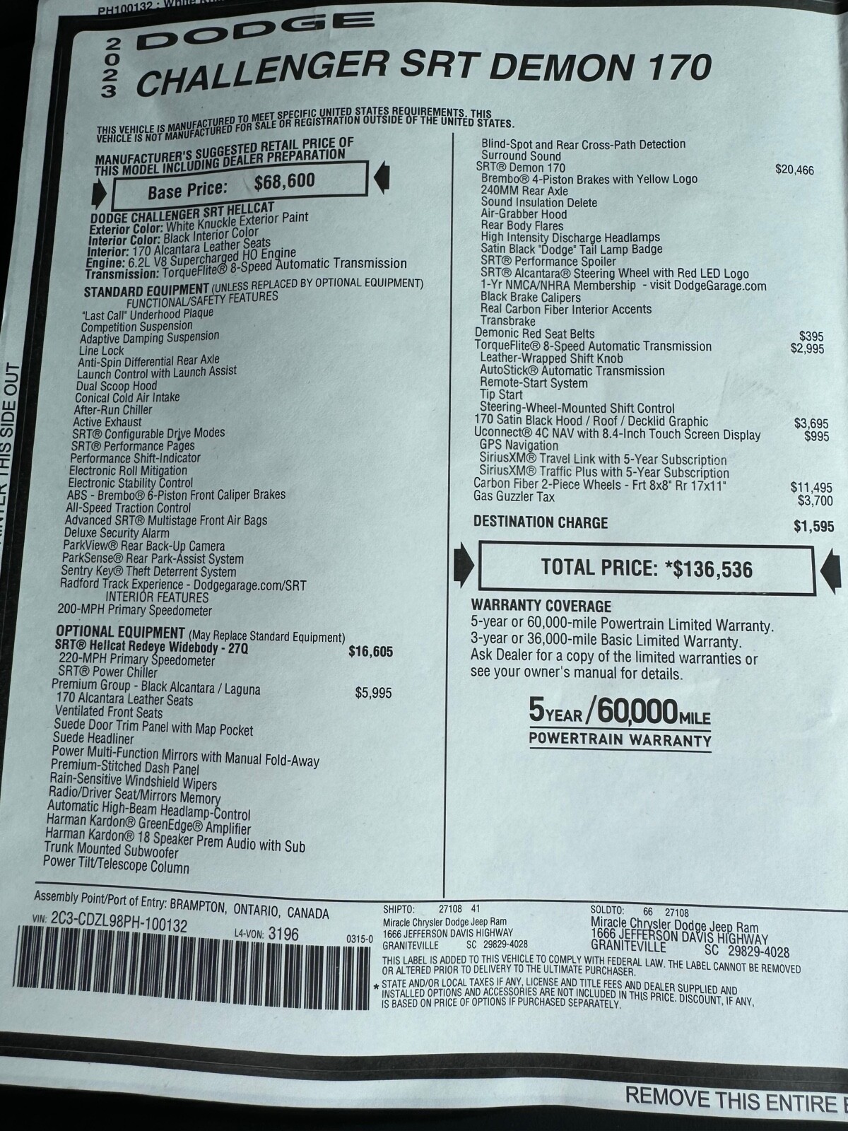 This model is a last call Dodge. Only 3,000 of these were produced! 1,025 HP!! This 2023 Dodge Challenger is a rare gem being offered for sale by its original owner. Includes all available options except sun roof. With only 24 miles on the odometer, this vehicle is practically brand new. The exterior is a stunning white and the title is clean, ensuring a hassle-free transfer of ownership. Under the hood, this Challenger runs like a dream and has been well-maintained by the original owner. It is not regularly driven, so you can be assured that it has been preserved in excellent condition. Don't miss out on the chance to own this exceptional vehicle.Vehicle Details