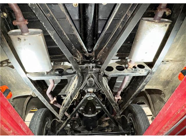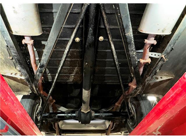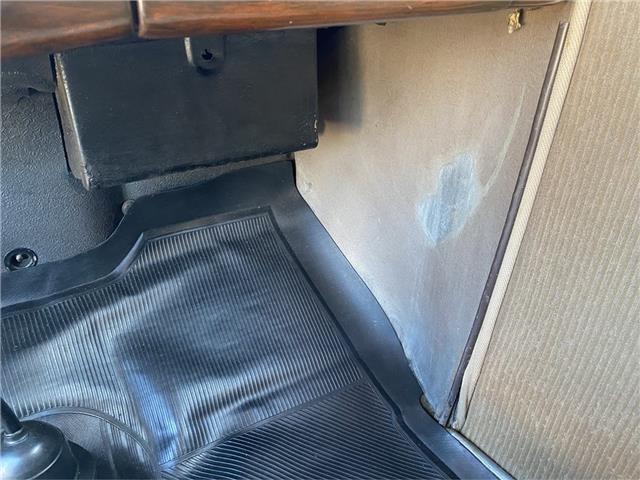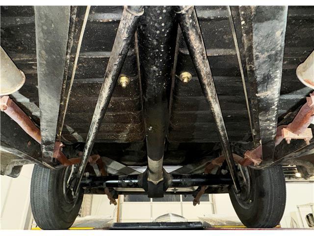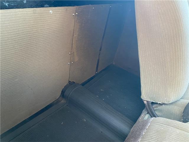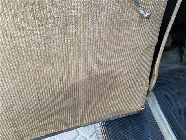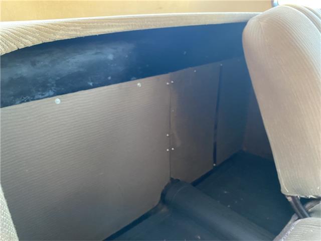 The interior is fitted with a tan cloth split bench seat with a matching headliner and door panels, and a contrasting black rubber floor pad. The metal dashboard was finished with a faux wood appearance, and additional faux wood trim is featured on the interior window surrounds. The trunk houses a spare tire with the car’s original retention hardware and boards.