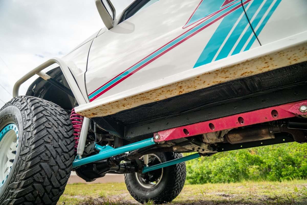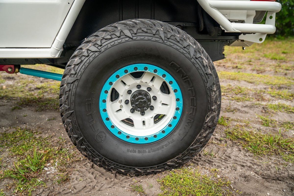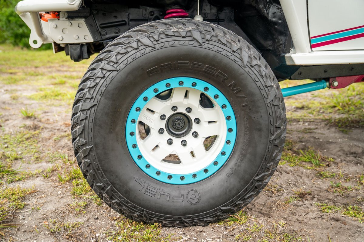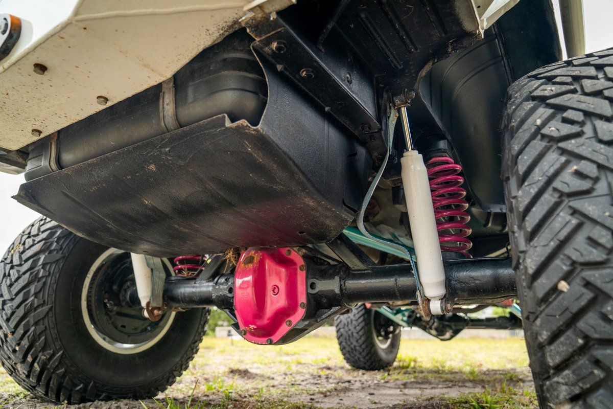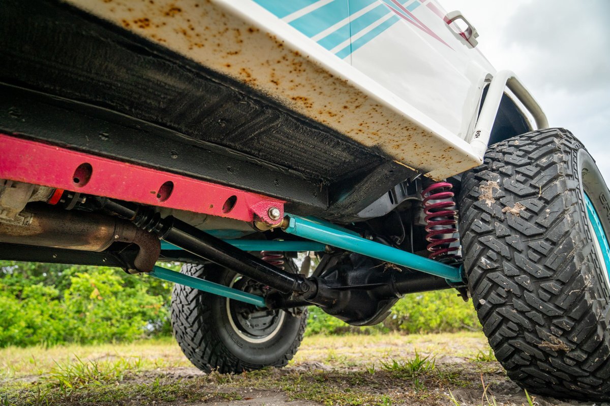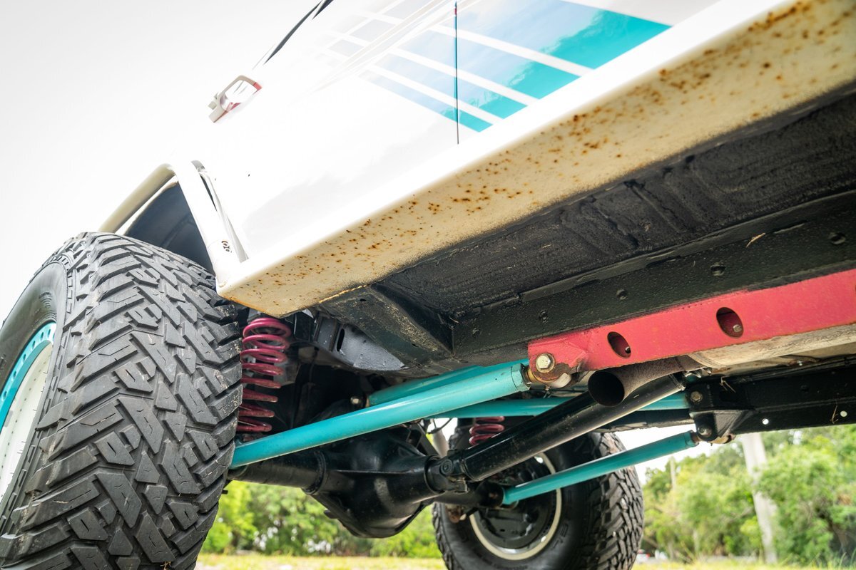 The 5.2-liter V8 was factory rated at 220 horsepower and 300 lb-ft of torque and is equipped with a K&N dual air intake. Power is sent to the rear or all four wheels via a four-speed automatic transmission and an NP242 dual-range transfer case. The truck is also equipped with a Dana 60 front and Dana 80 rear axle with ARB locking differentials and 5.13:1 gearing. Underbody components have been painted teal and pink. The white-finished 17" Fuel Off-Road wheels feature teal accents and are mounted with 37x13.5" Fuel Off-Road Gripper M/T tires. The truck rides on a 5" long-arm suspension lift.